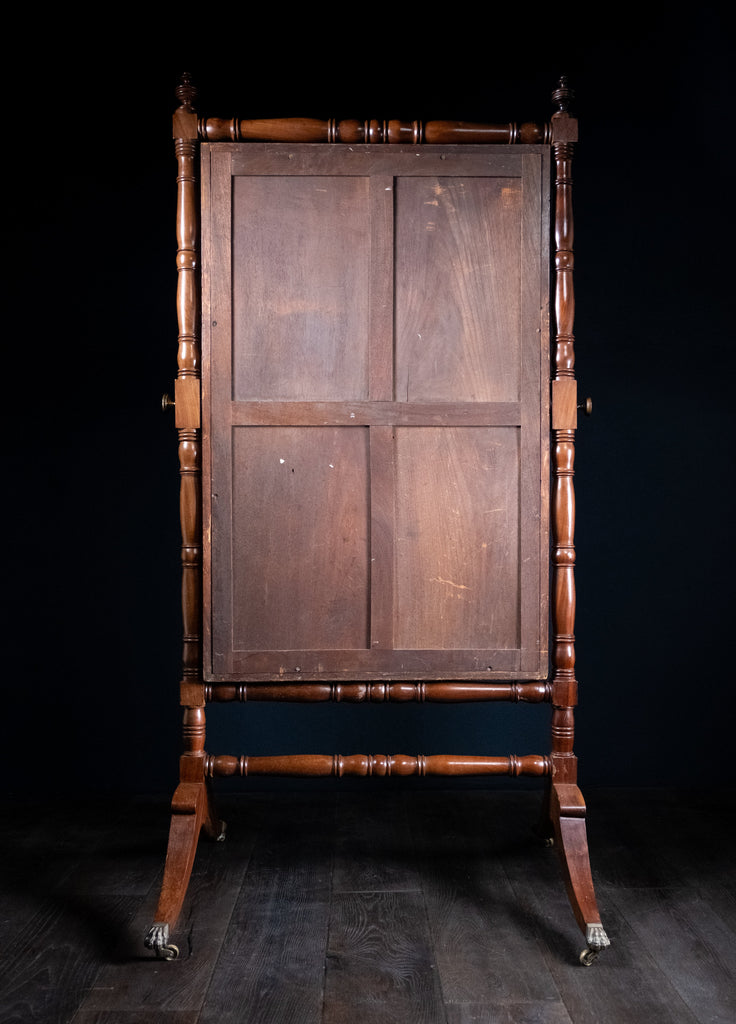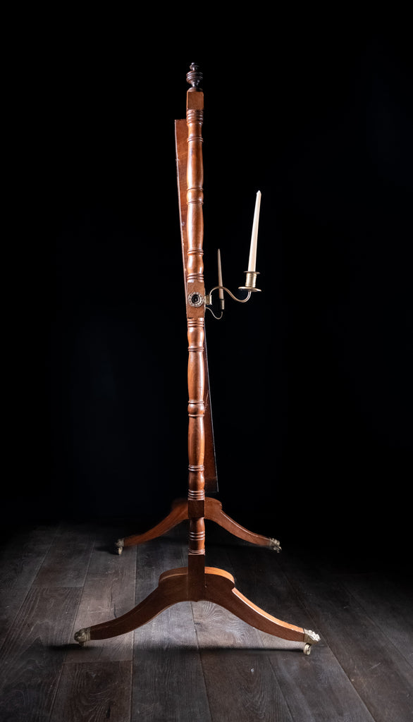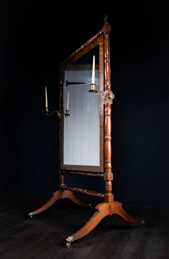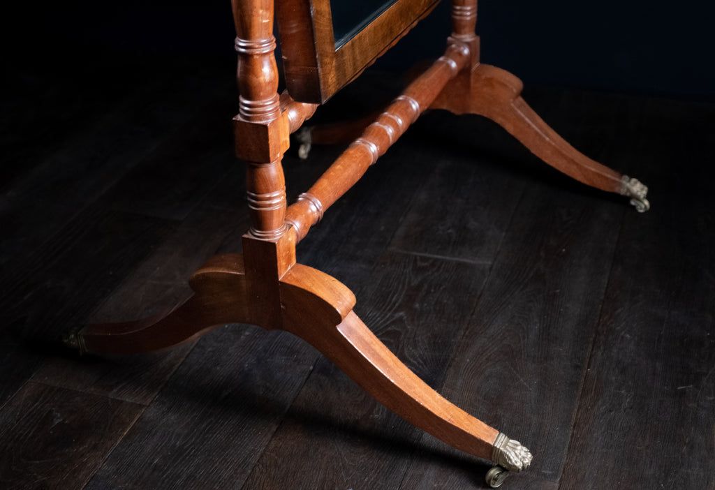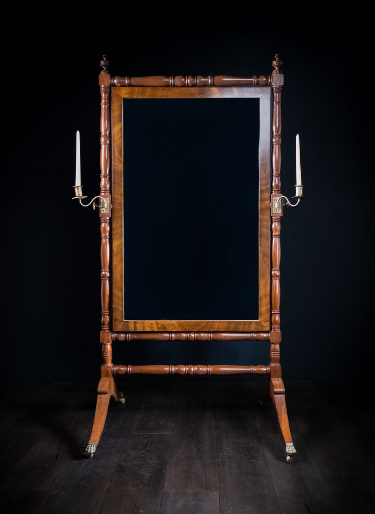The turned frame supports a large rotating mirror of very good proportions flanked by two brass candlesticks. The whole raised upon brass paw feet and castors and surmounted by turned urns.