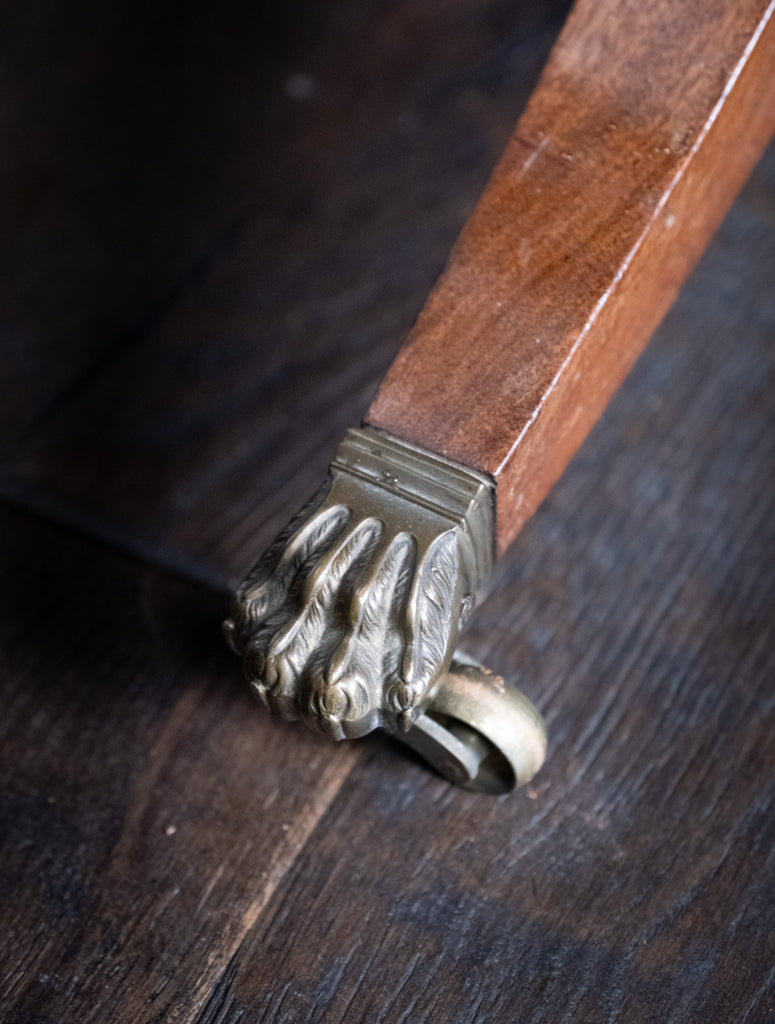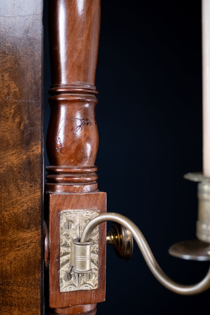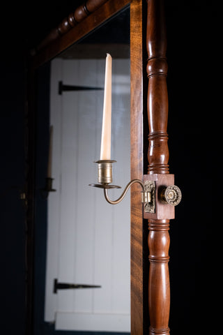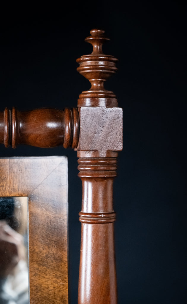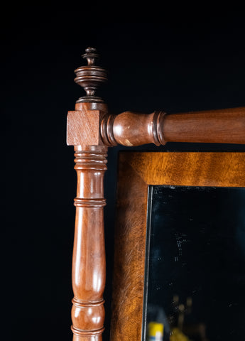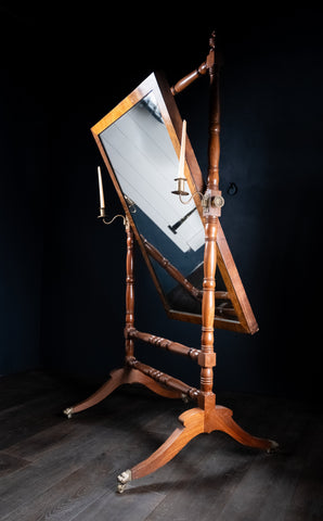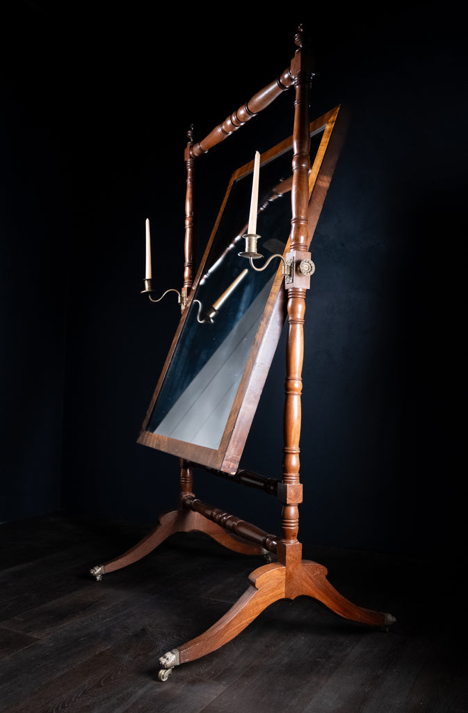 The turned frame supports a large rotating mirror of very good proportions flanked by two brass candlesticks. The whole raised upon brass paw feet and castors and surmounted by turned urns.