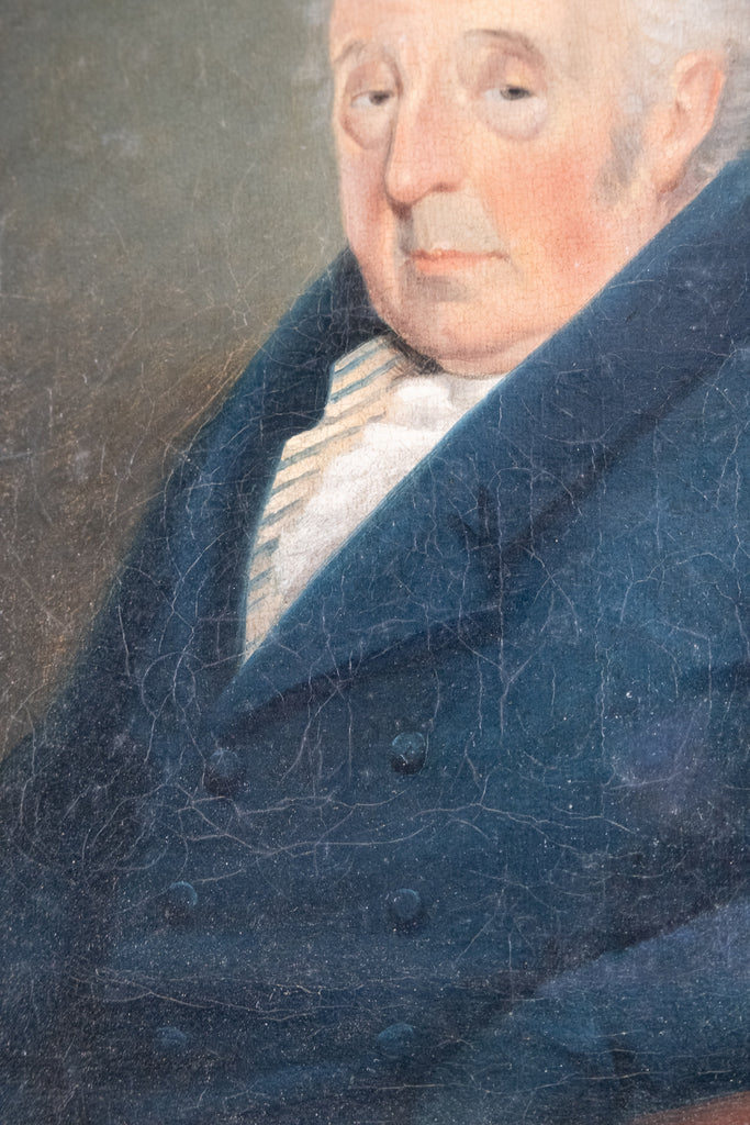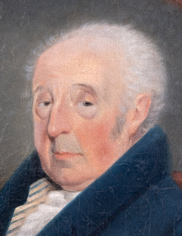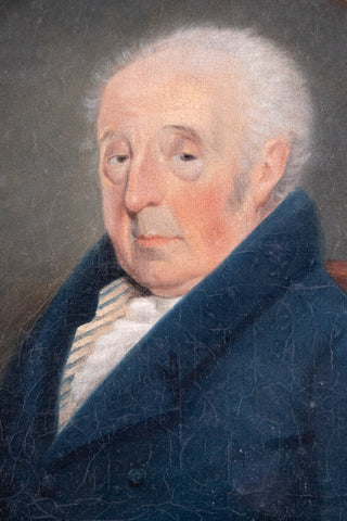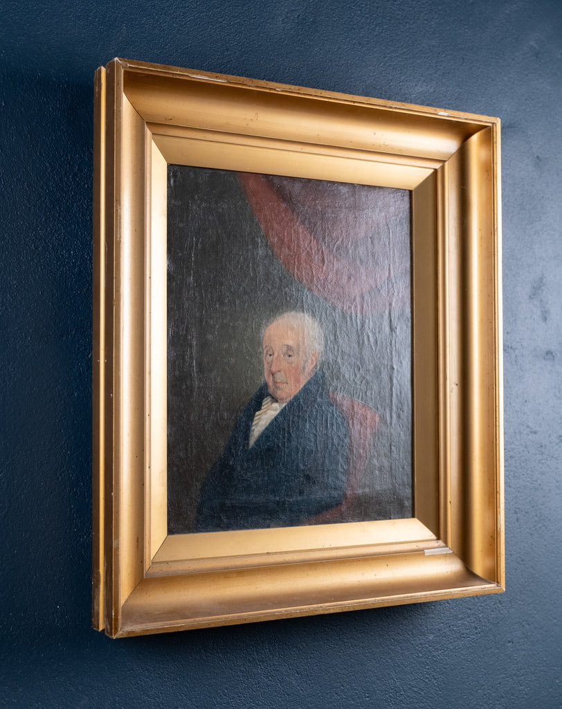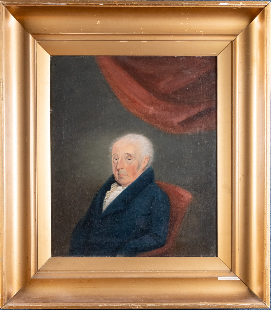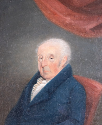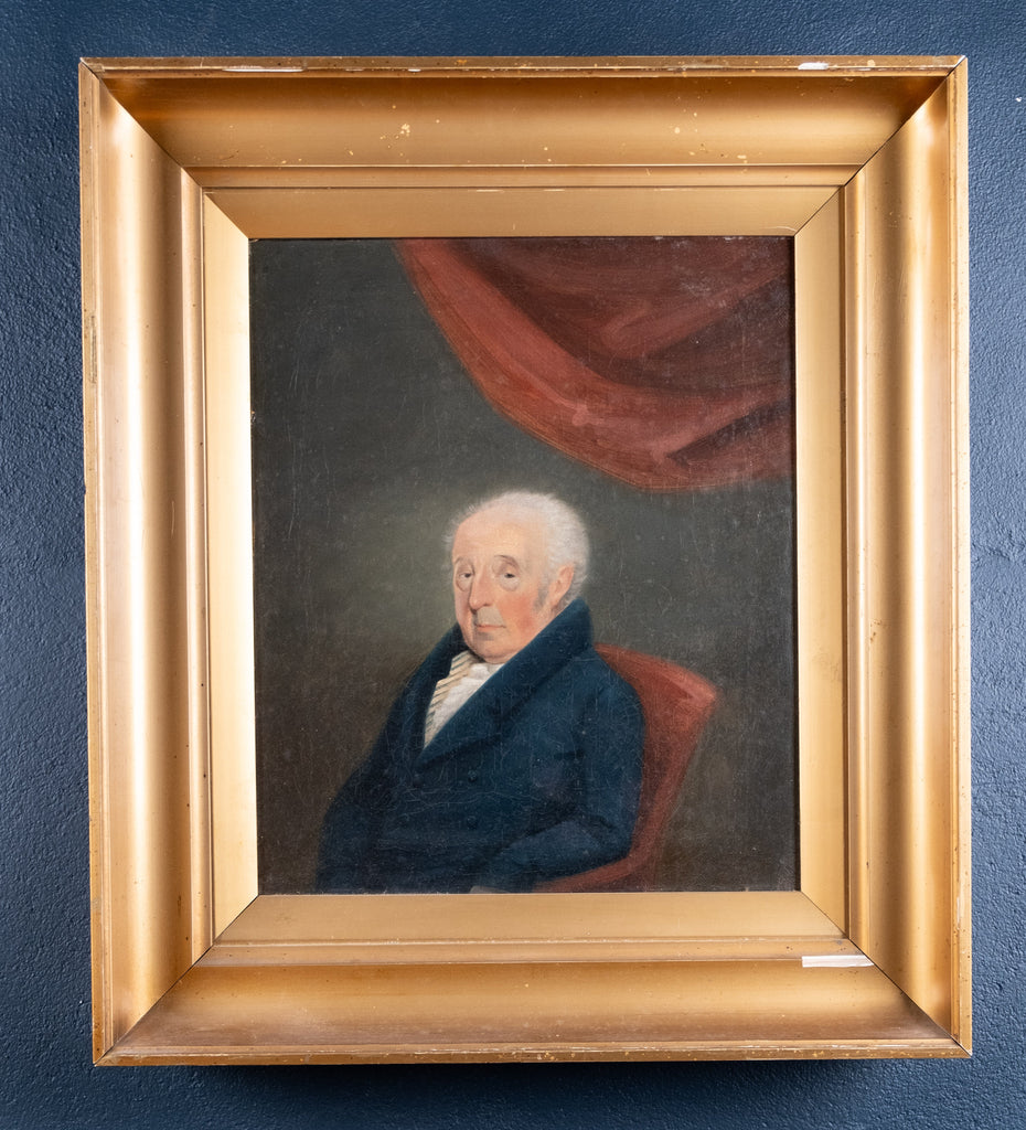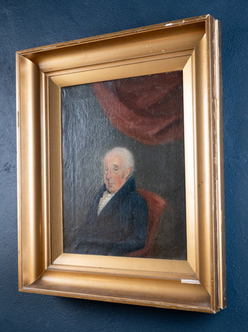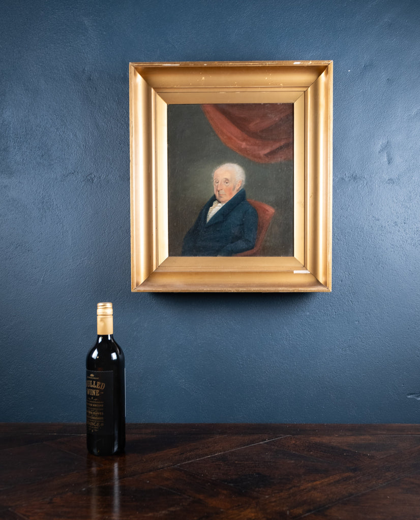 A wonderfully charismatic 19th century oil on canvas portrait of a gentleman with drapes to the background. Whilst in a dour position within both the seat and composition itself, the sitter's expression is rather wry.