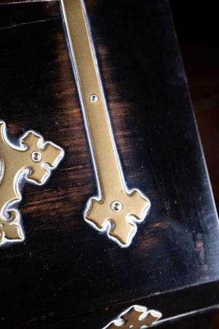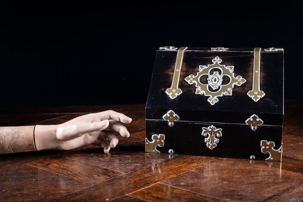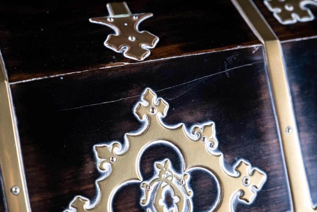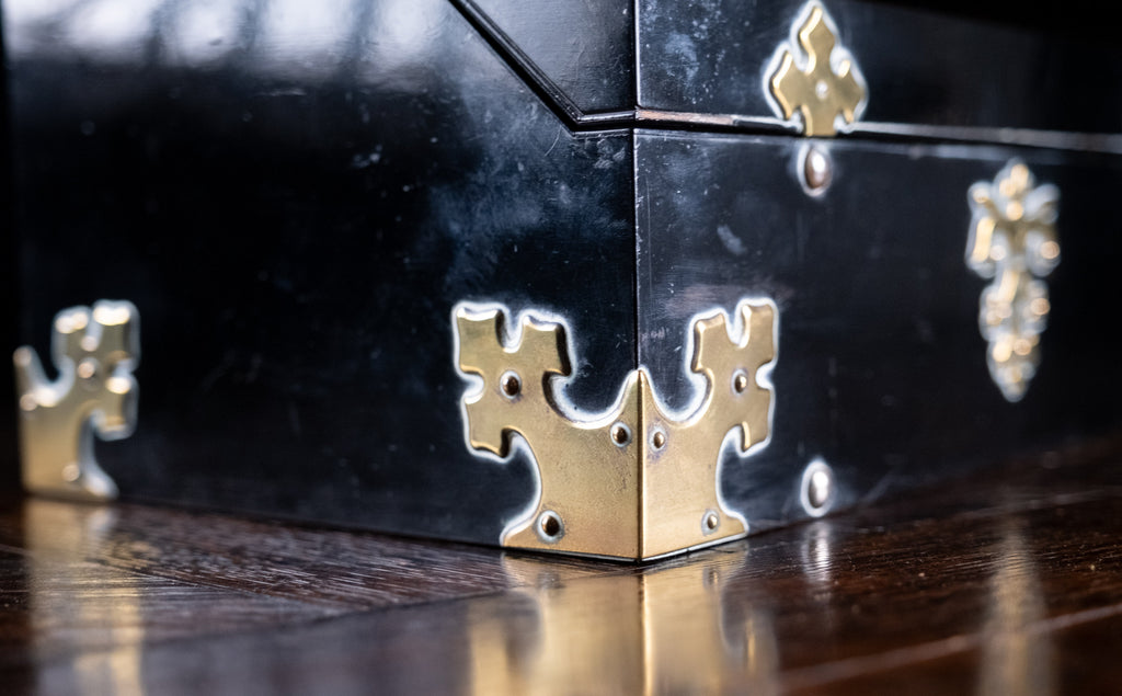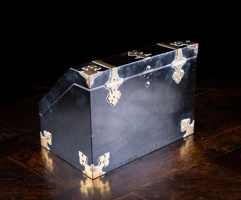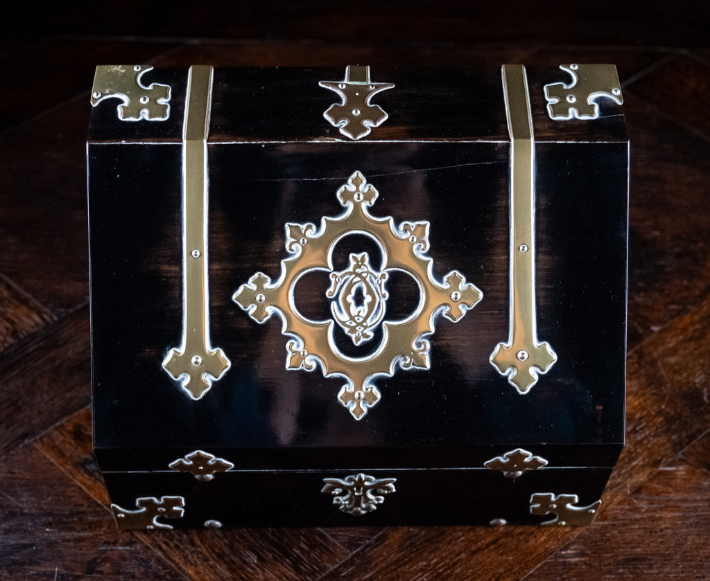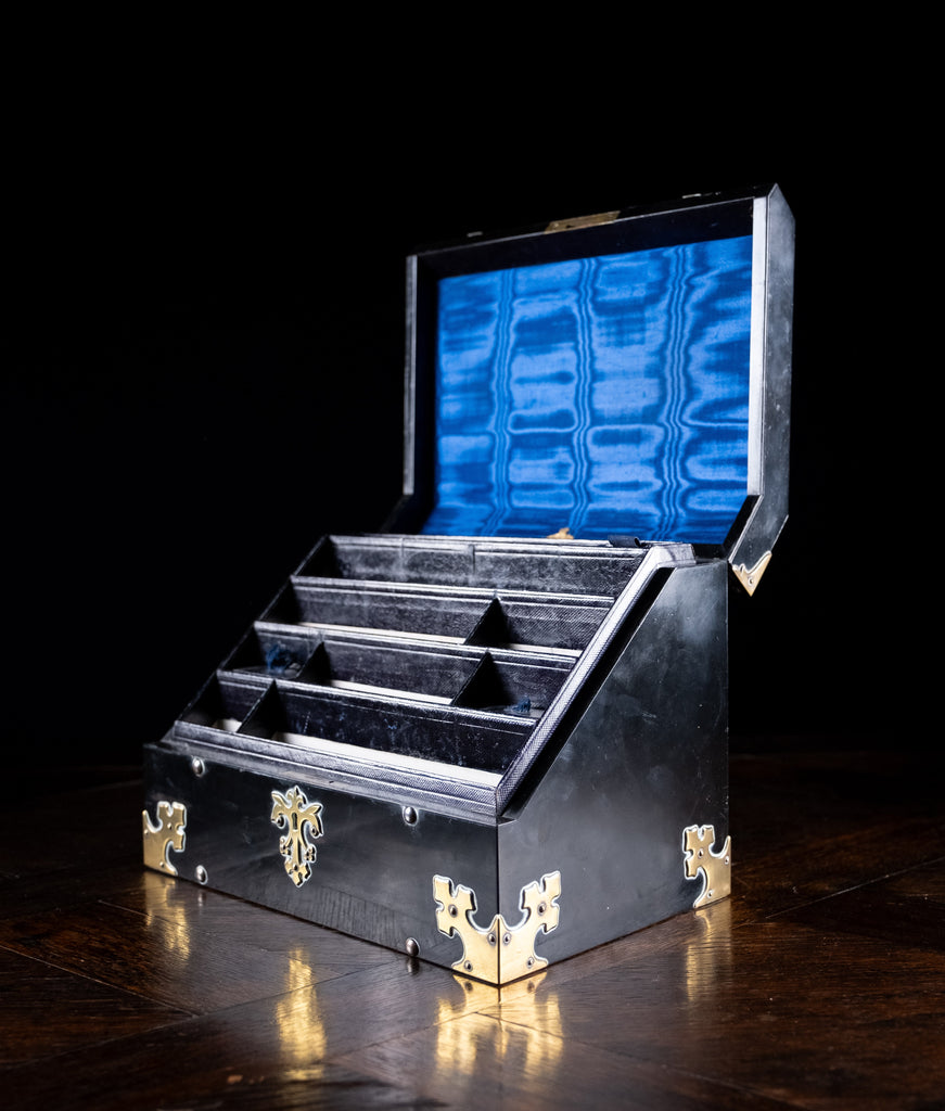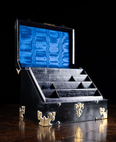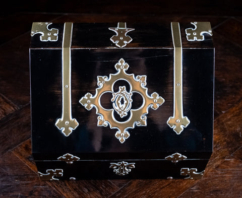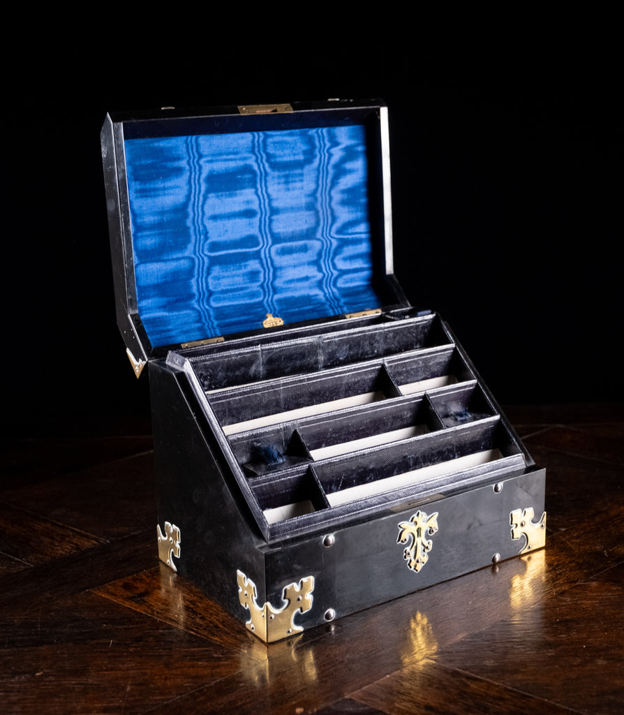 The highly polished coromandel is adorned with solid brass banding in the gothic taste, with a a 'CC" monogram to the centre of the lid. The lid opens to reveal a blue silk lined interior, the gilt 'Leuchars' maker stamp and numerous compartments for stationary.