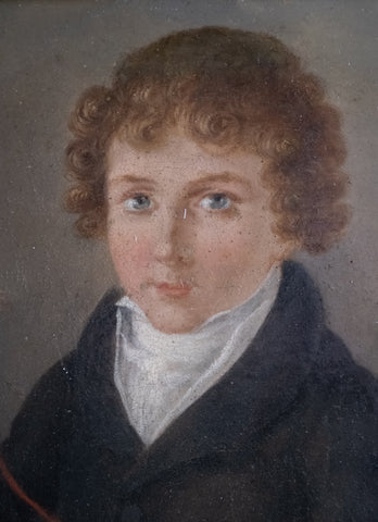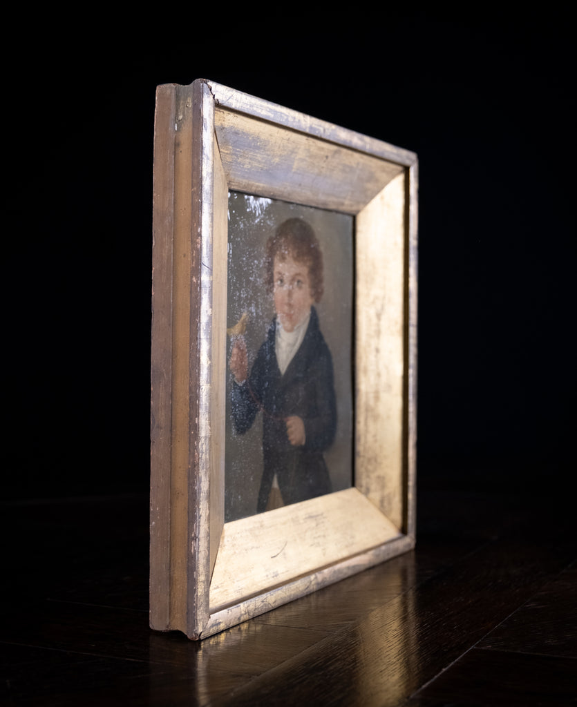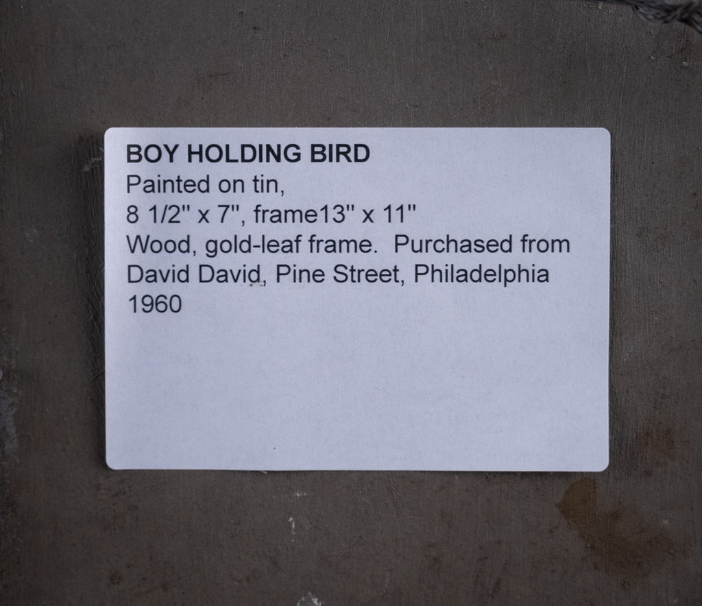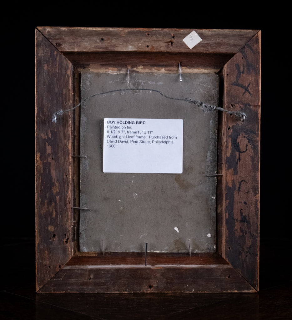 A charming early 19th century oil on tin depicting a boy holding a small yellow bird. American School.