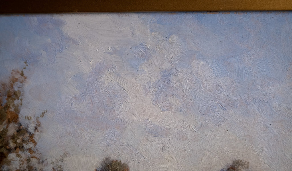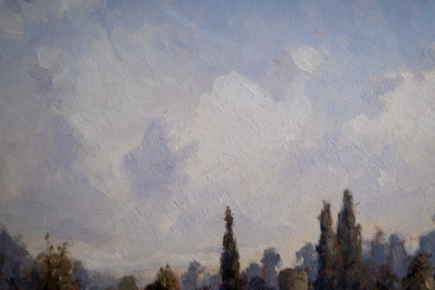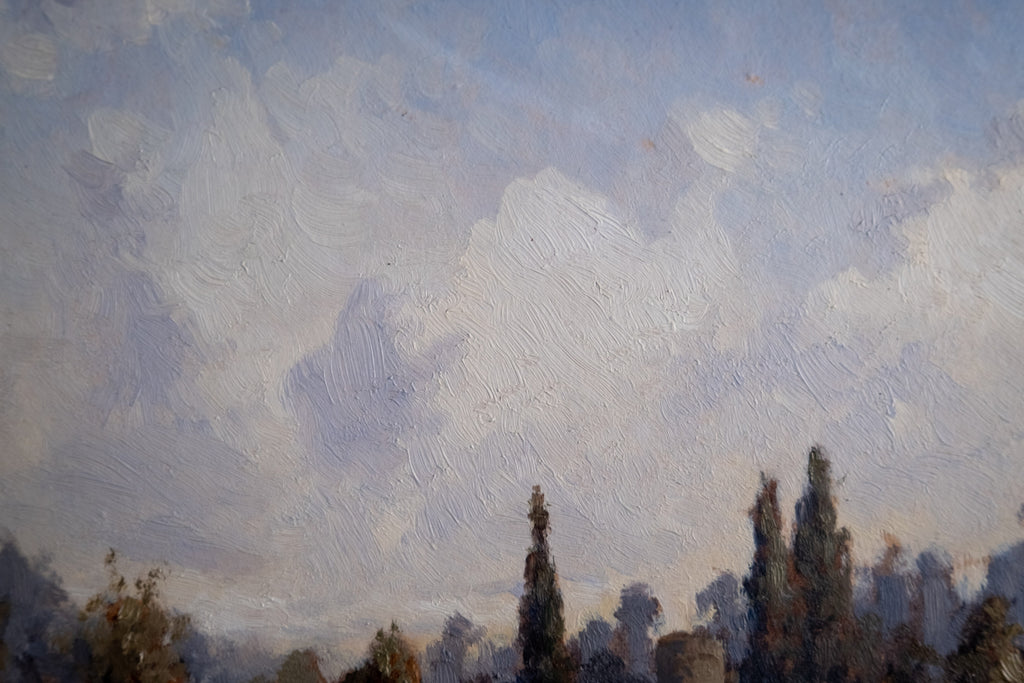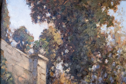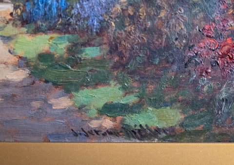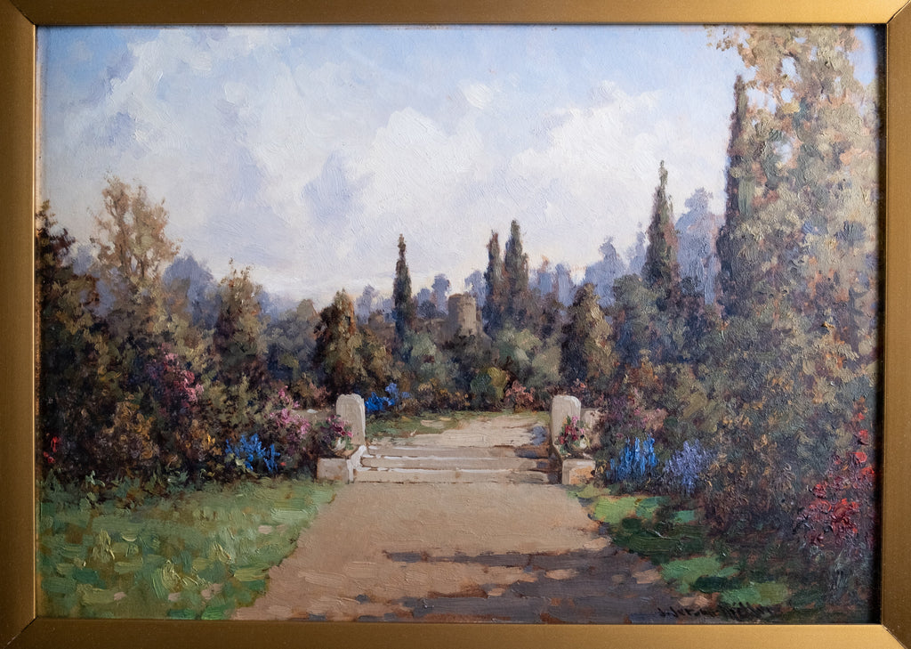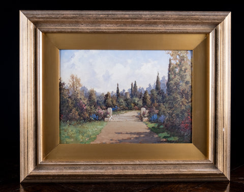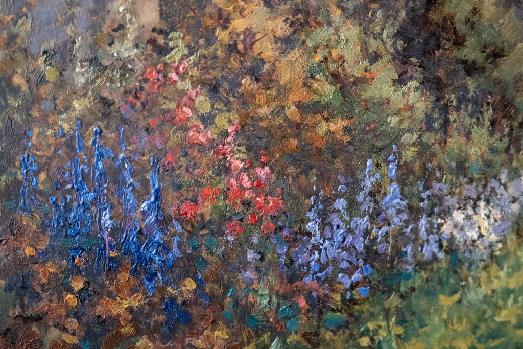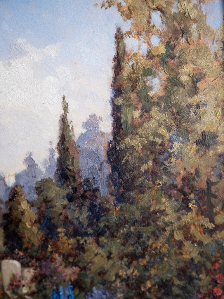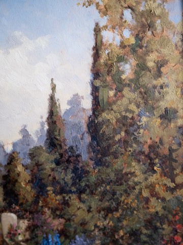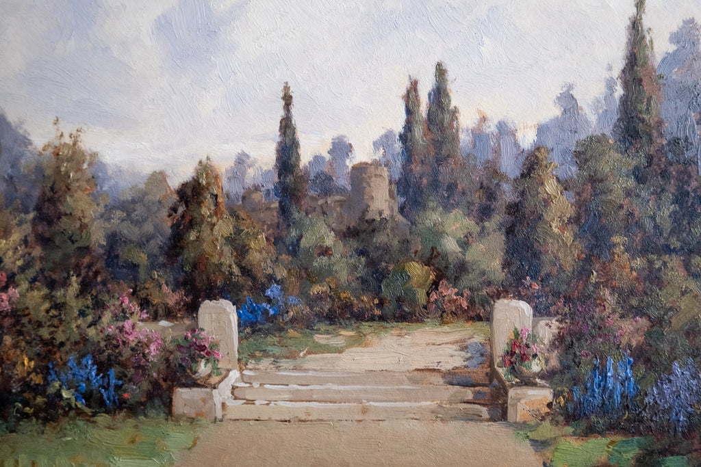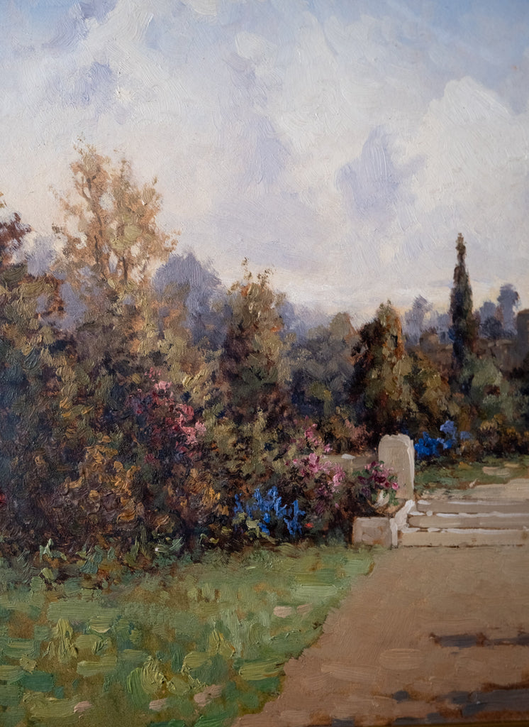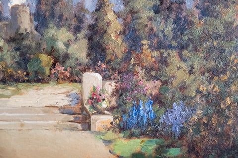 Each oil is rich in colour and texture with every pot, flower, tree and cloud carefully depicted. Both works are housed in a later gilt and anti-reflective glass frame. Very small nick to the lower right frame of the 'steps' work.