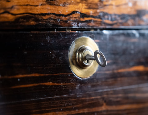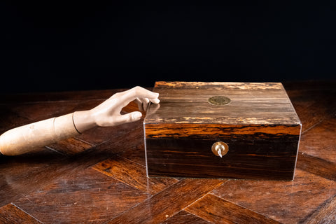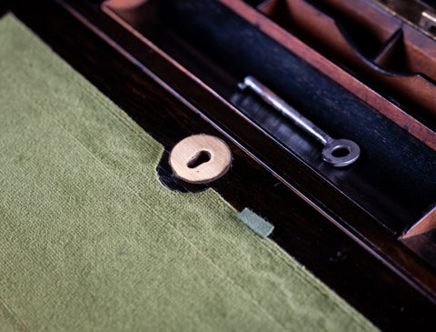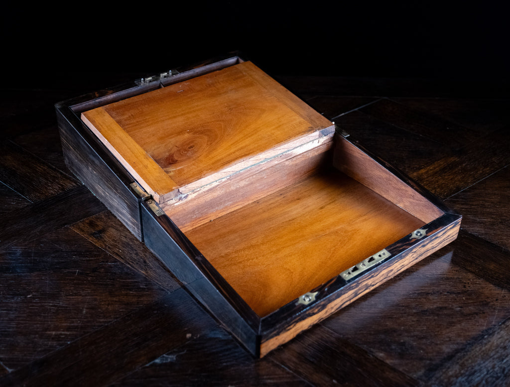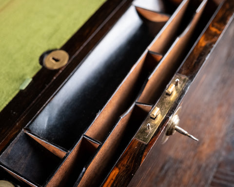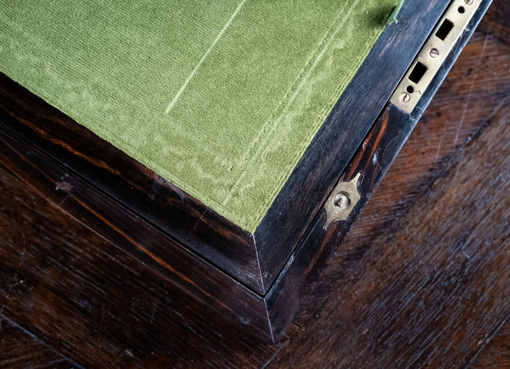 The coromandel has faded heavily in areas, most notably to the lid. The locks all work as they should and the interior baize lining remains clean.