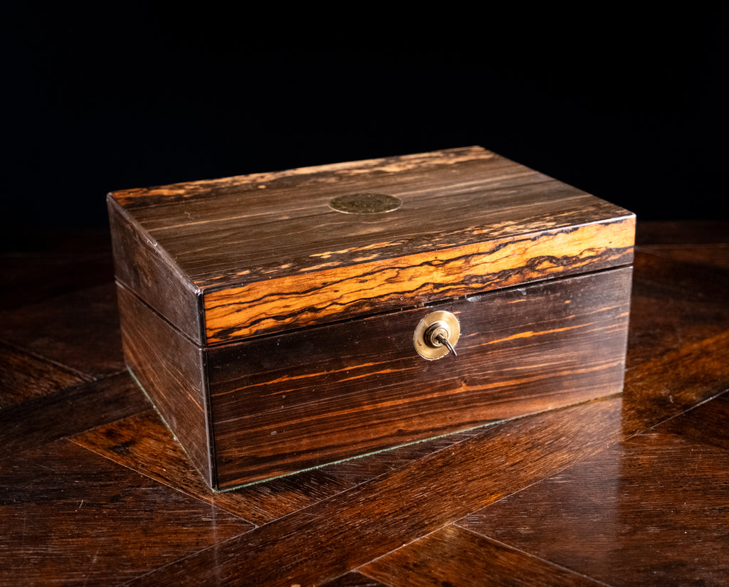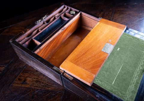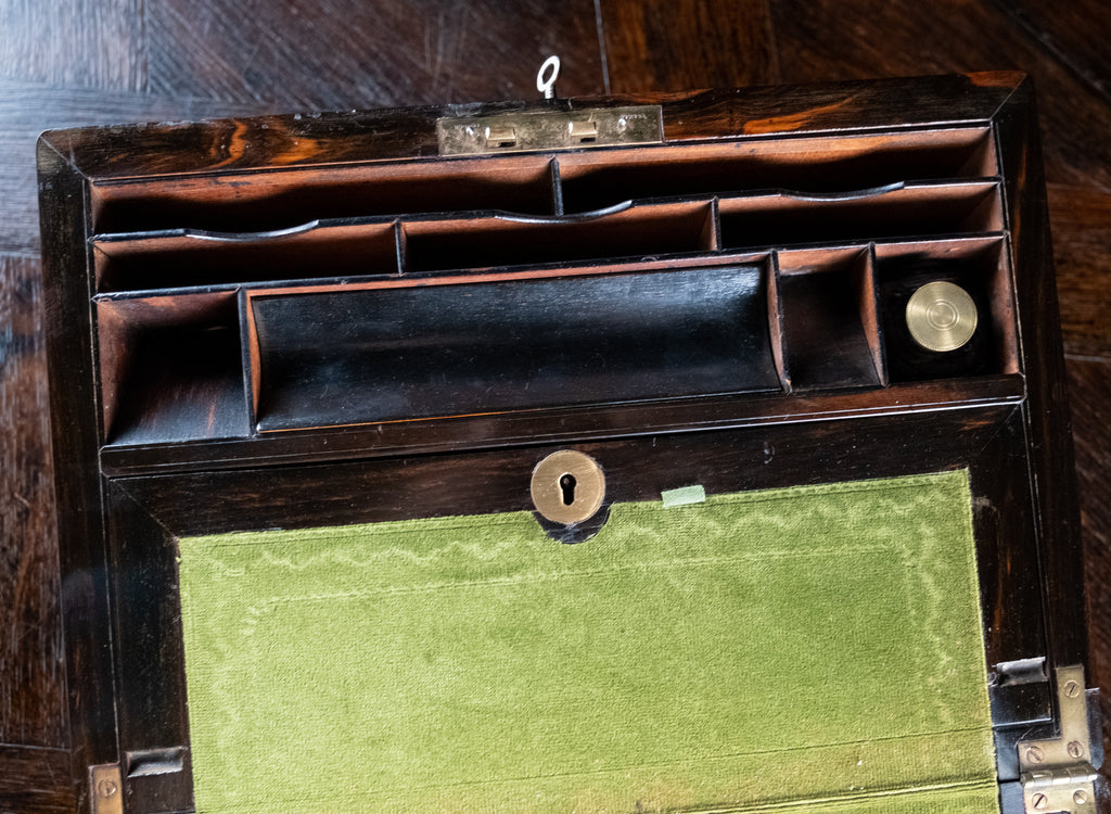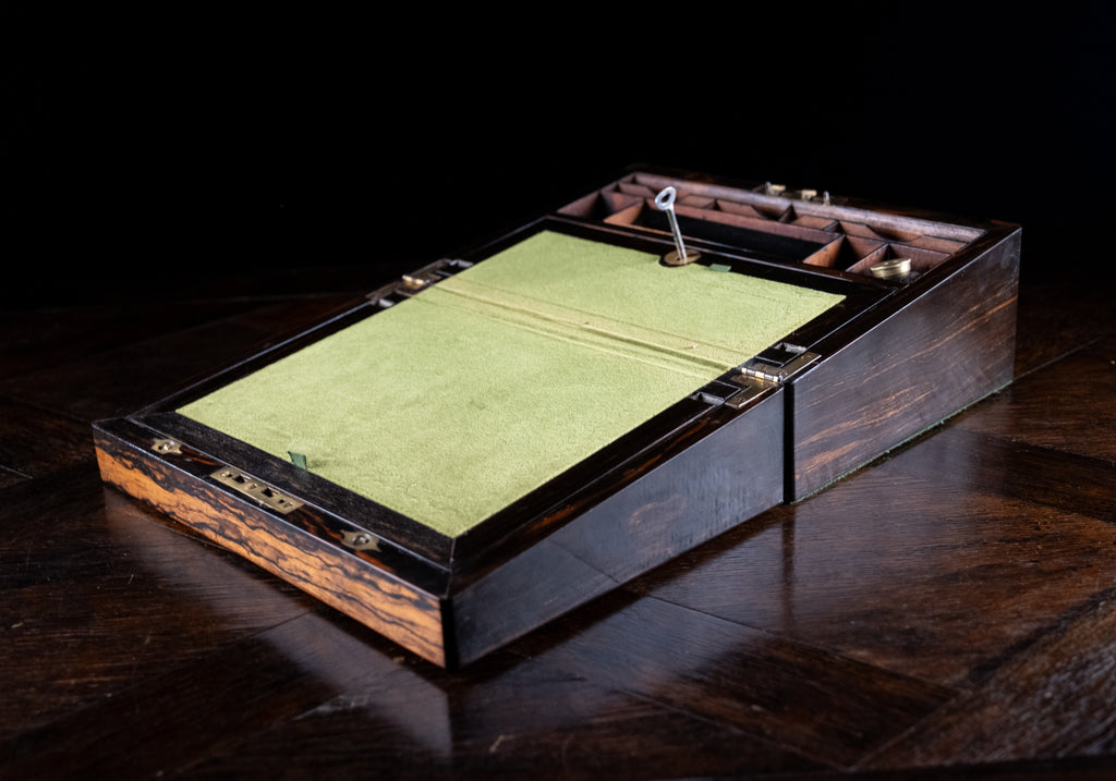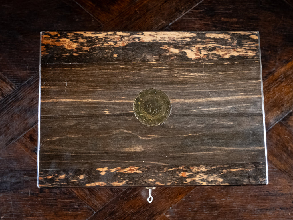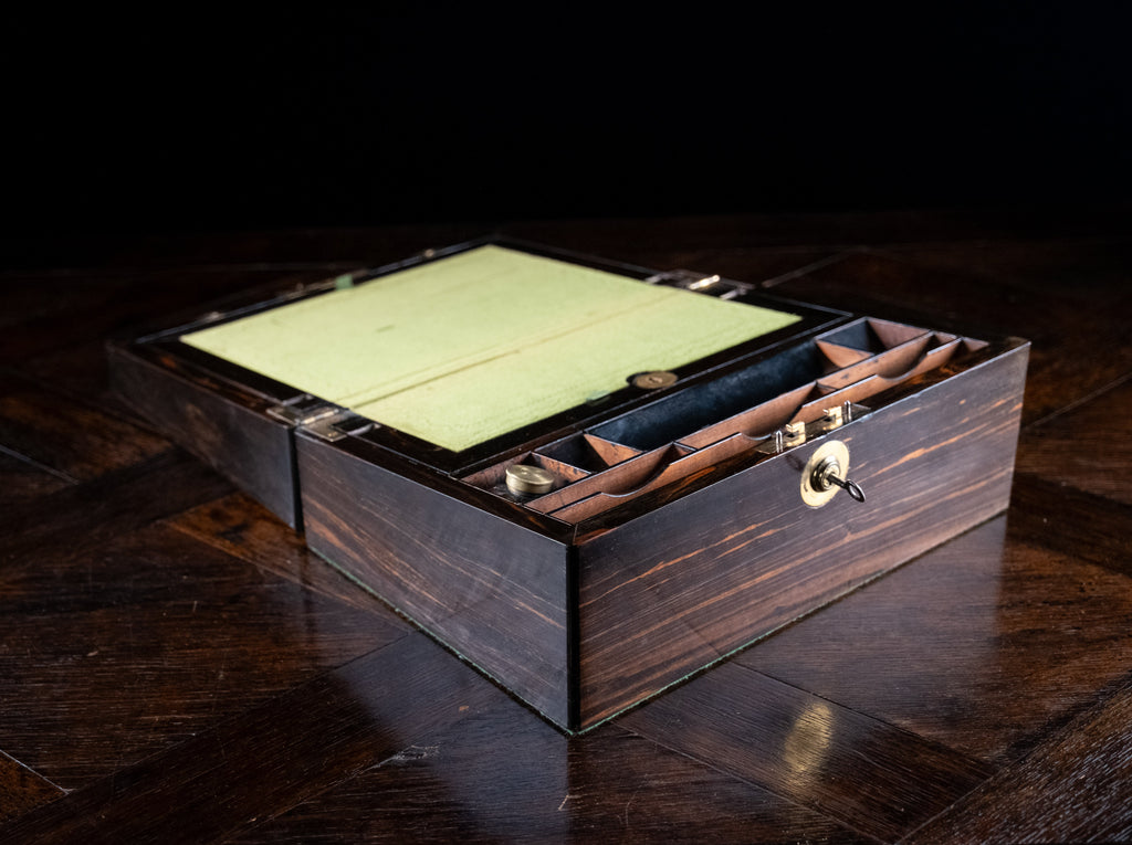 The coromandel box has a monogrammed circular brass inlay to the lid. The hinged lid opens to reveal a green baize lined writing slope with a lockable inner compartment. Baize lined base.