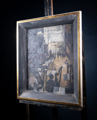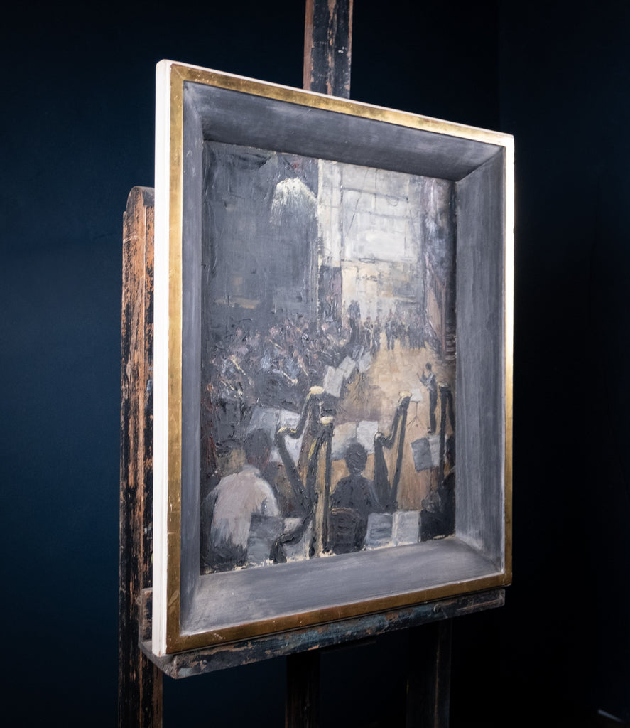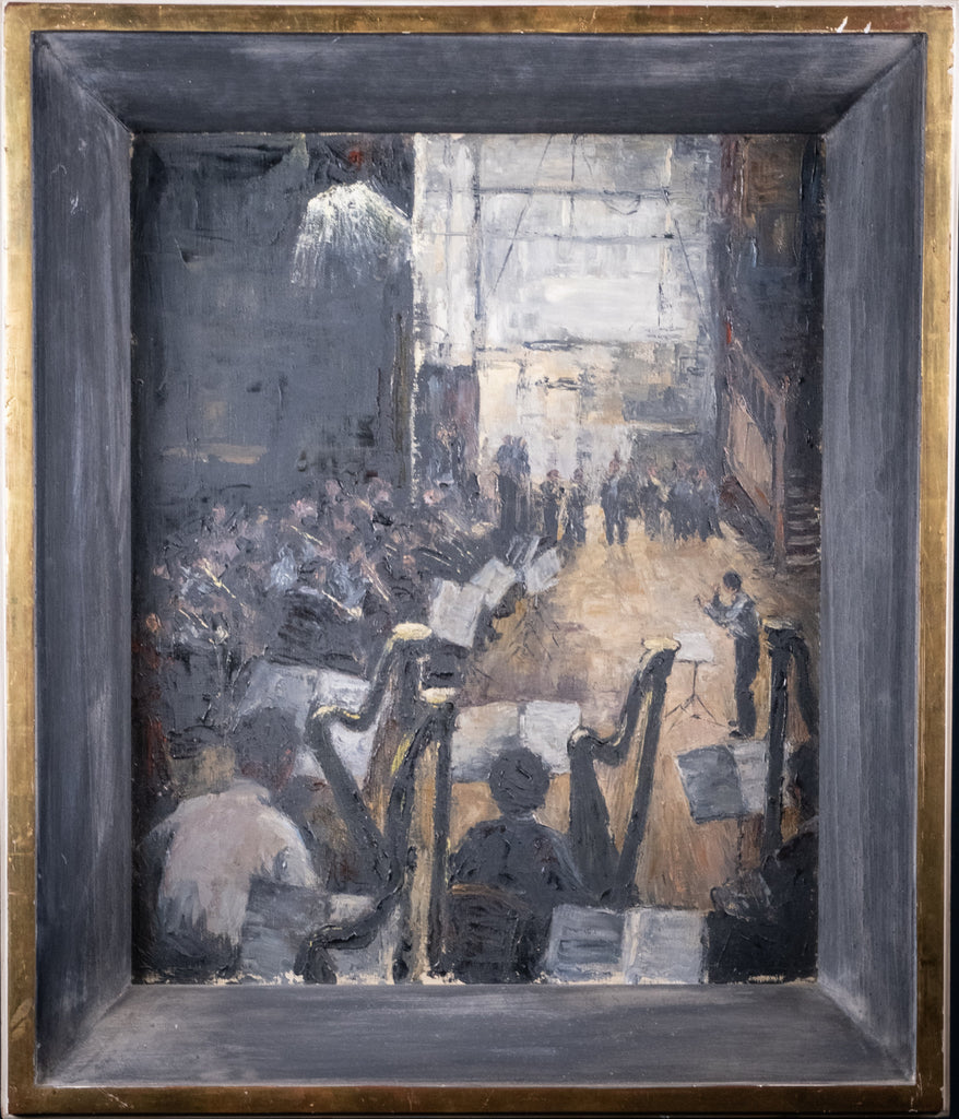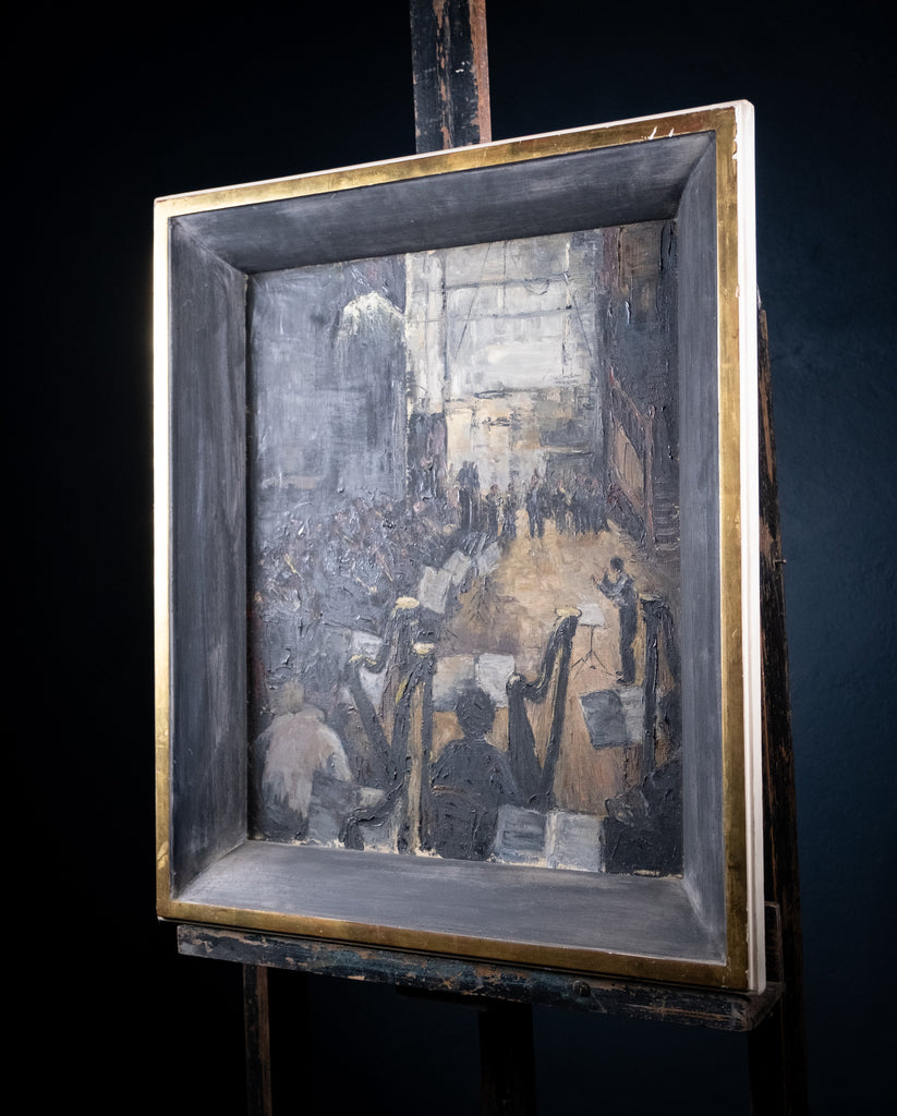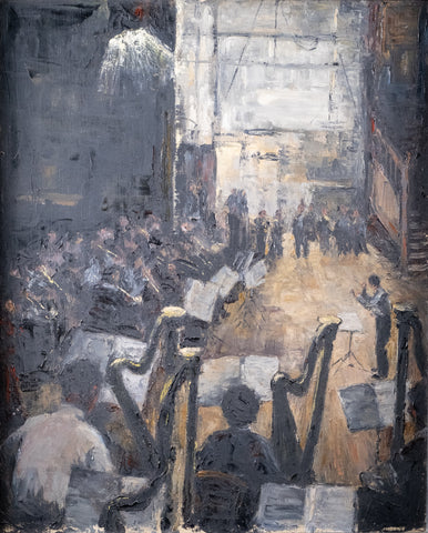 The work is extremely atmospheric, almost impressionistic. The unusual composition makes it feel like one is amongst the orchestra, and the bold use of contrast and impasto gives the work a real verve.