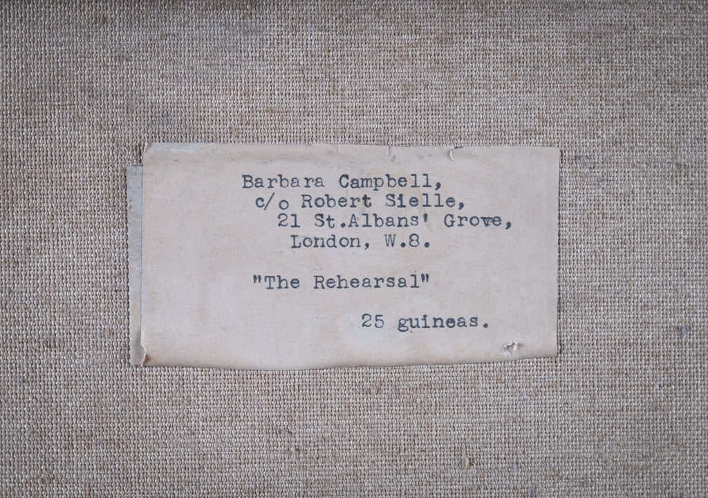 'The Rehearsal' by Barbara Campbell. Unfortunately we have been unable to find any information regarding the artist herself. The label verso, 'Barbara Campbell, c/o Robert Sielle...', does help us date the work however.