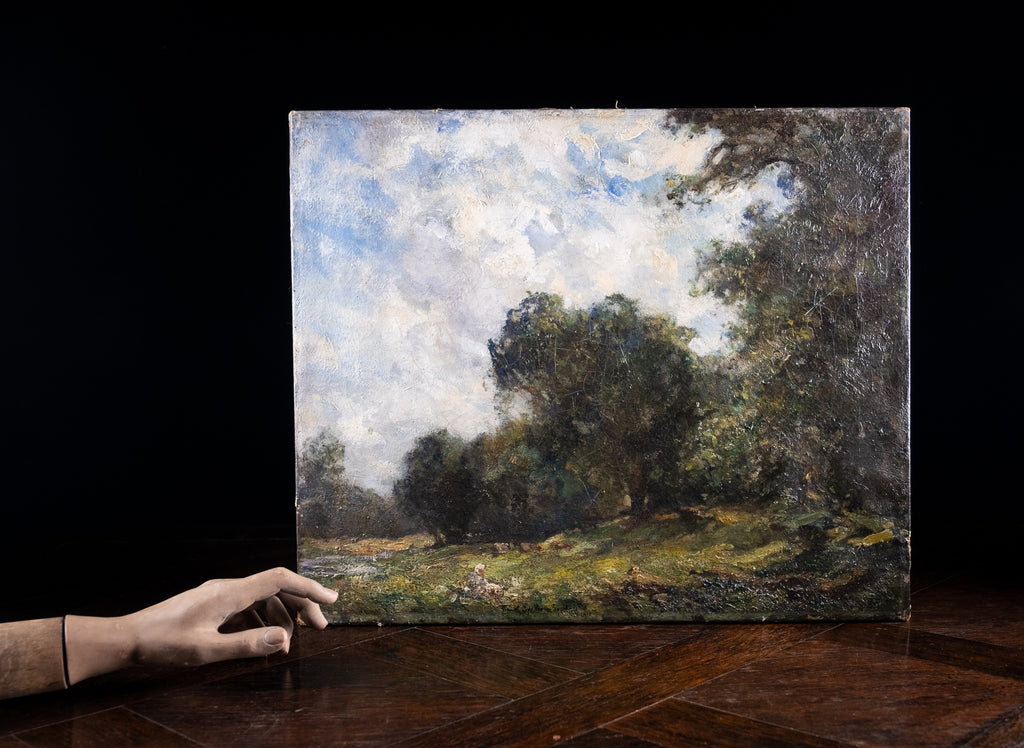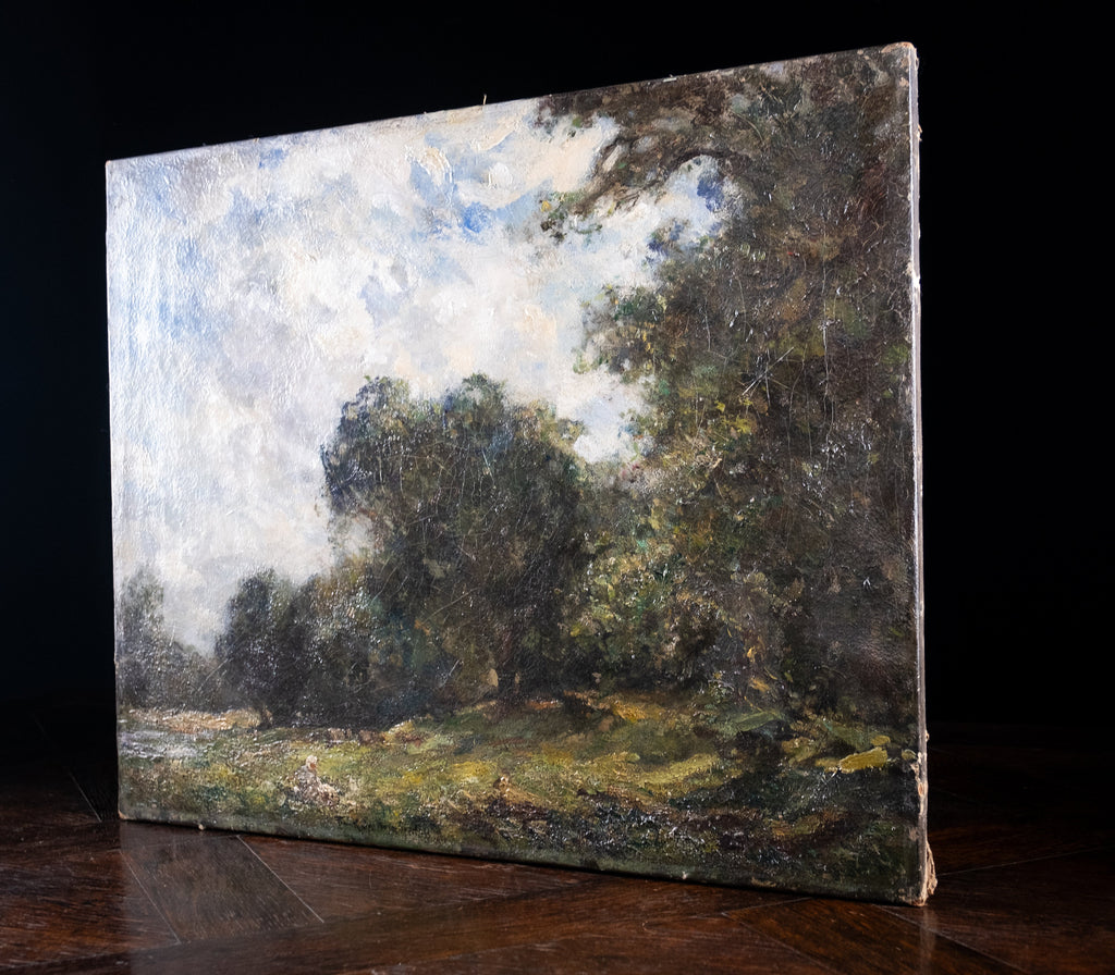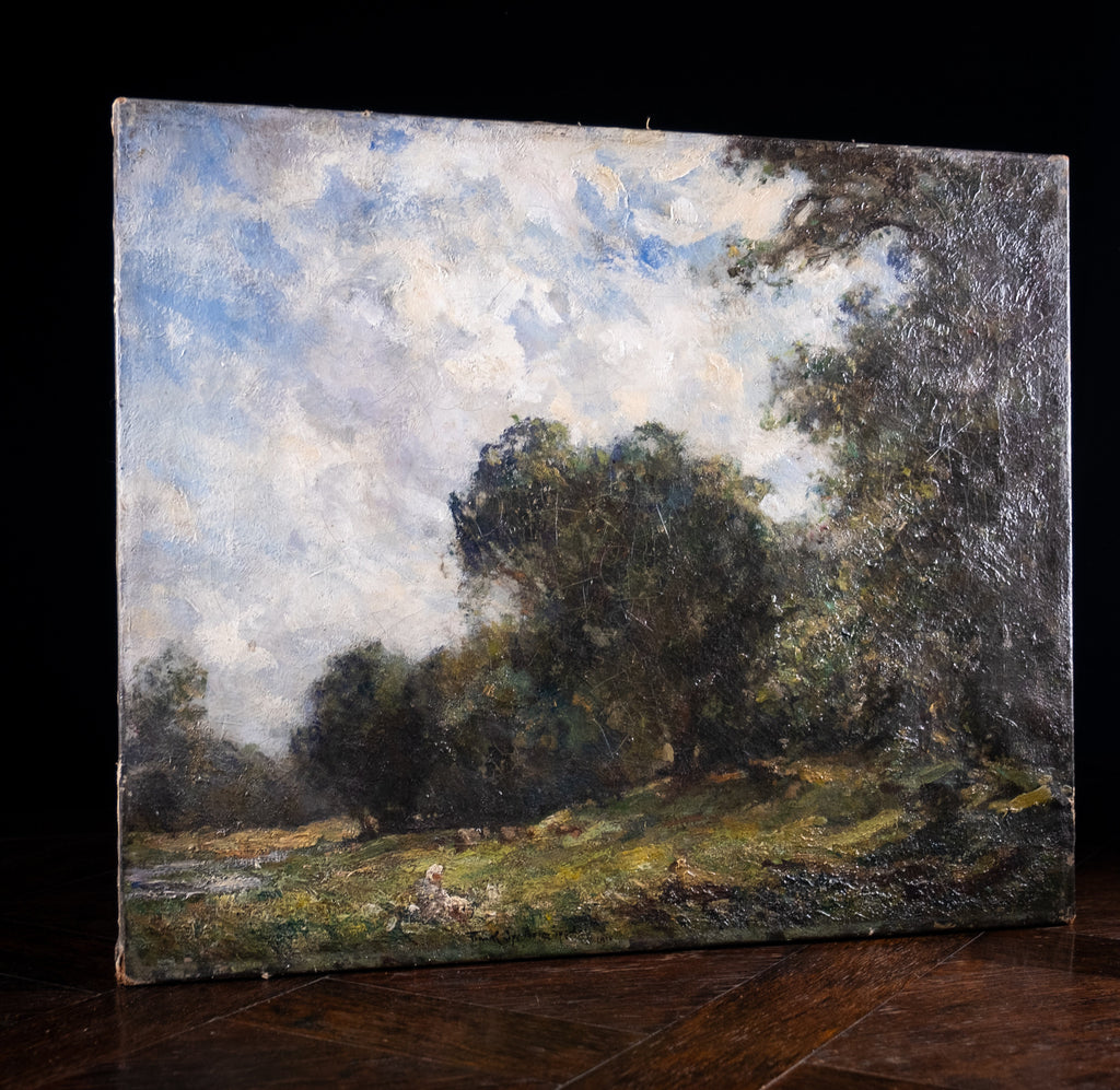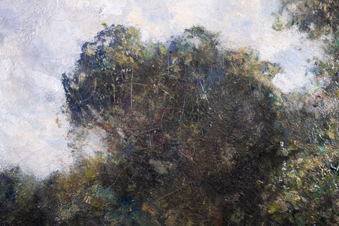 This impasto work is of good proportions and full of verve and atmosphere with fluffy white clouds and dense foliage. Unframed.