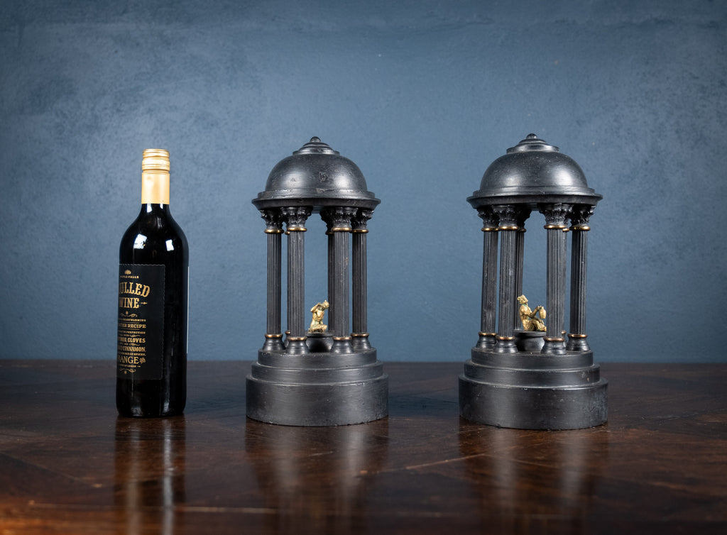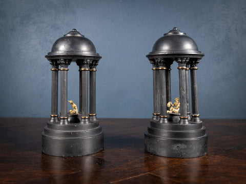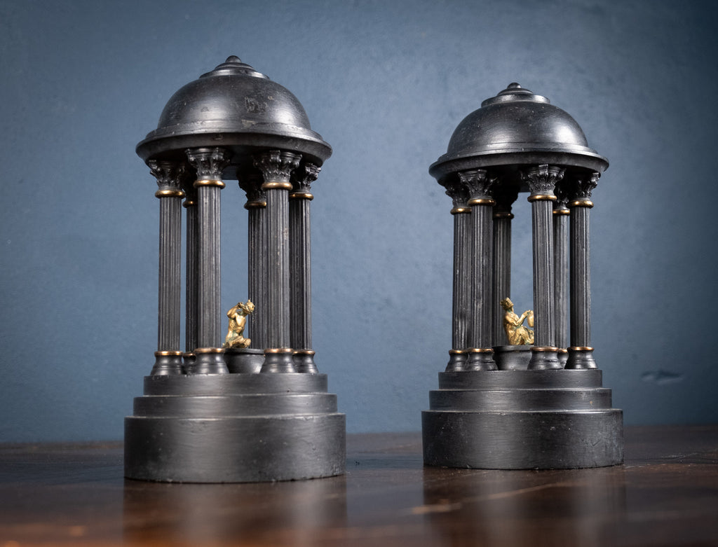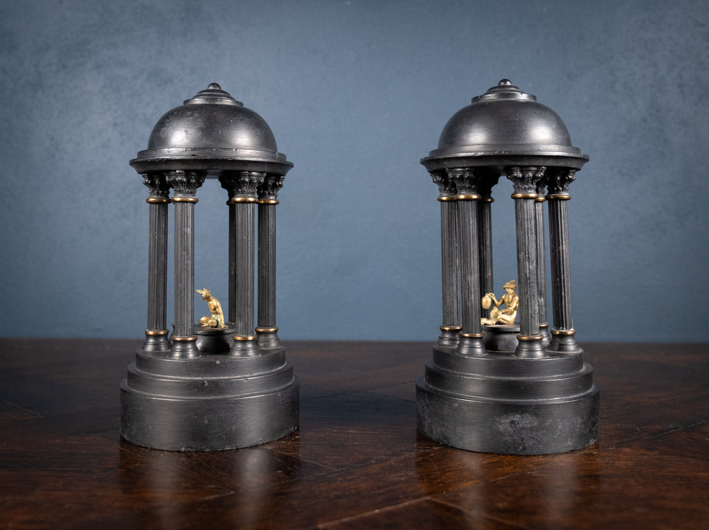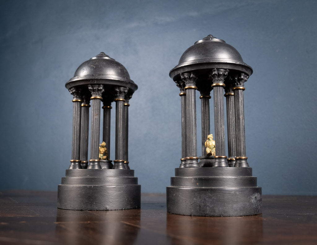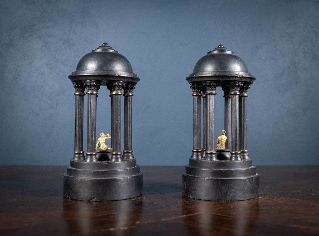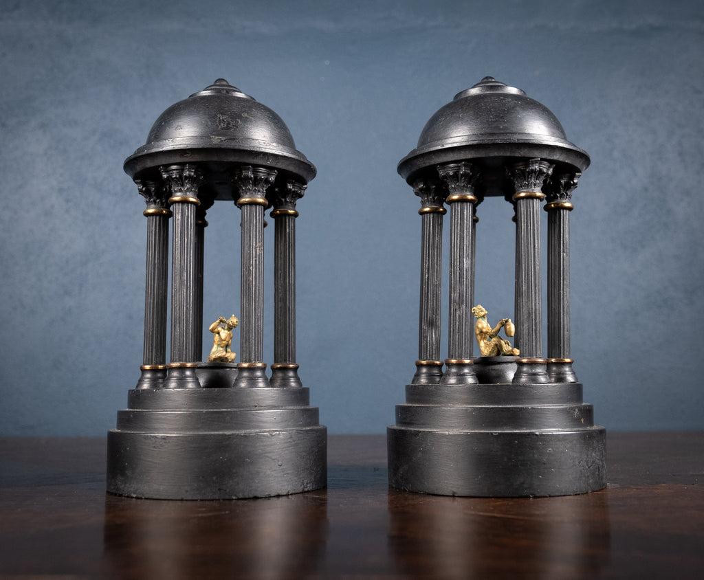 Each model boasts a domed top above six reeded pillars with gilt detailing above a stepped base. The small gilt bronze figures of Bacchus and Pan within each temple are very crisply cast and boast impressive detail.