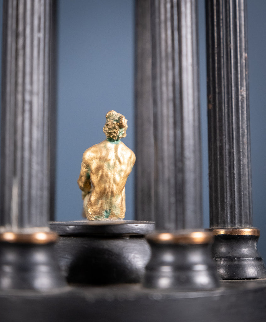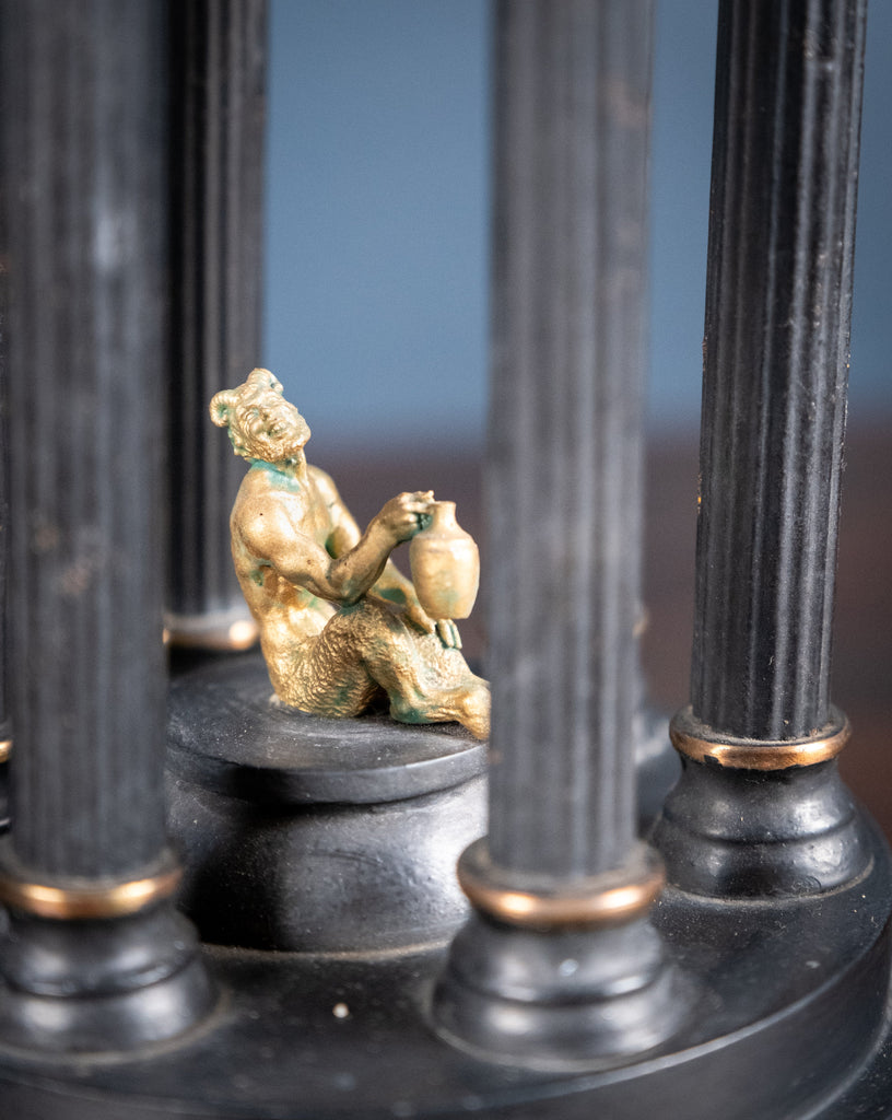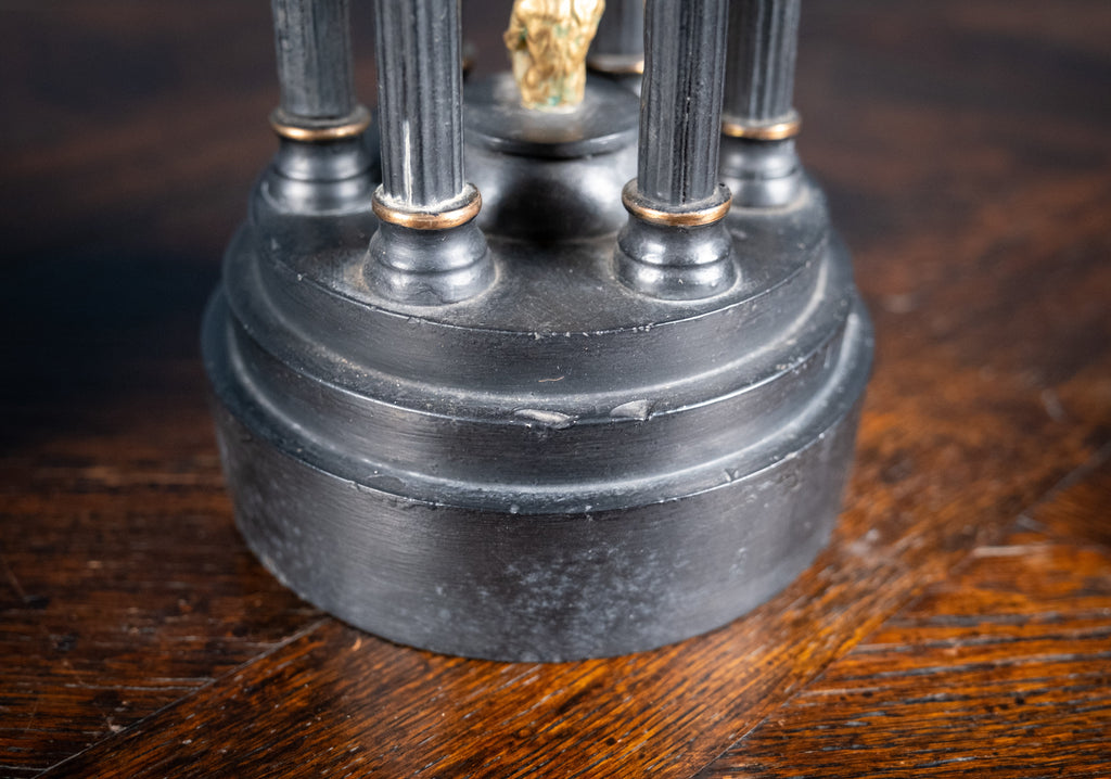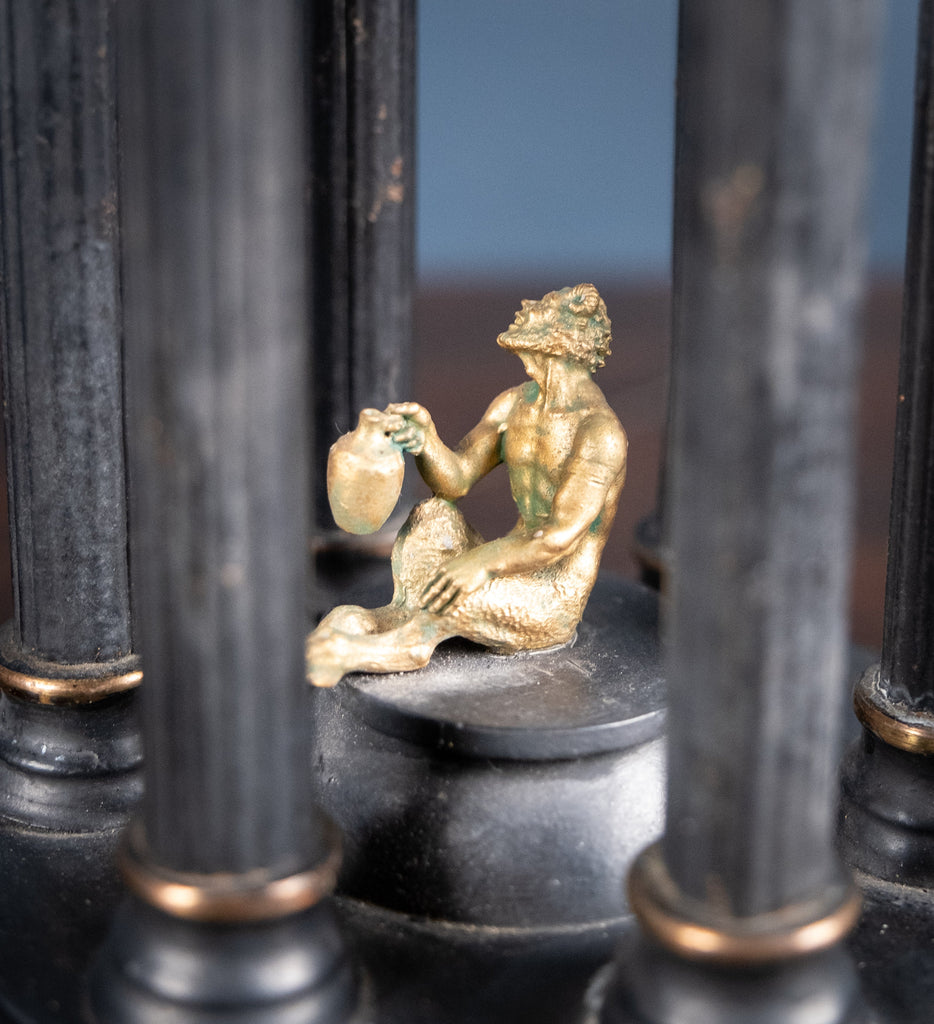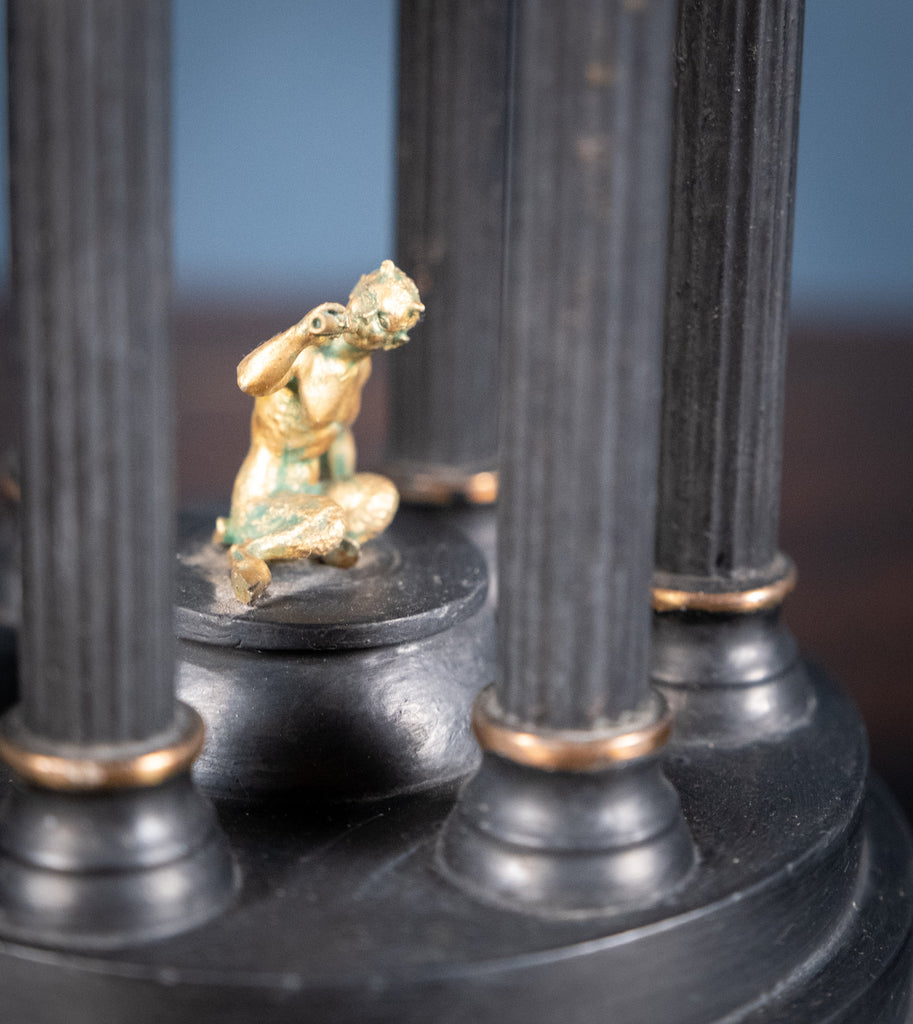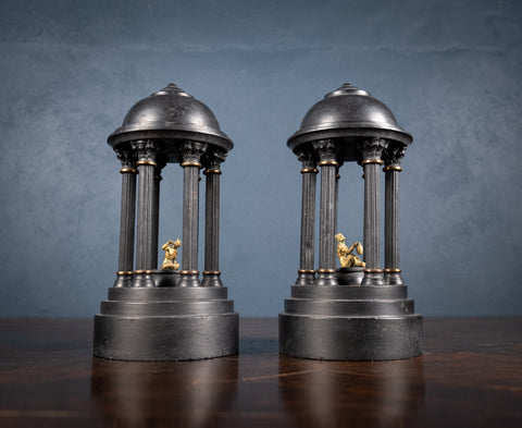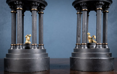 Each model boasts a domed top above six reeded pillars with gilt detailing above a stepped base. The small gilt bronze figures of Bacchus and Pan within each temple are very crisply cast and boast impressive detail.