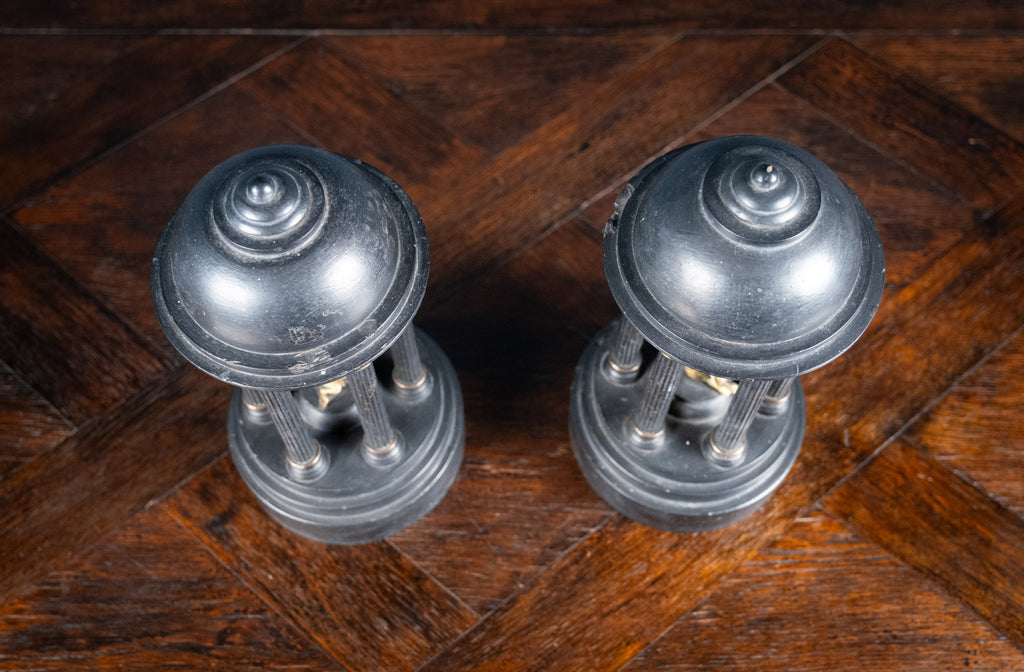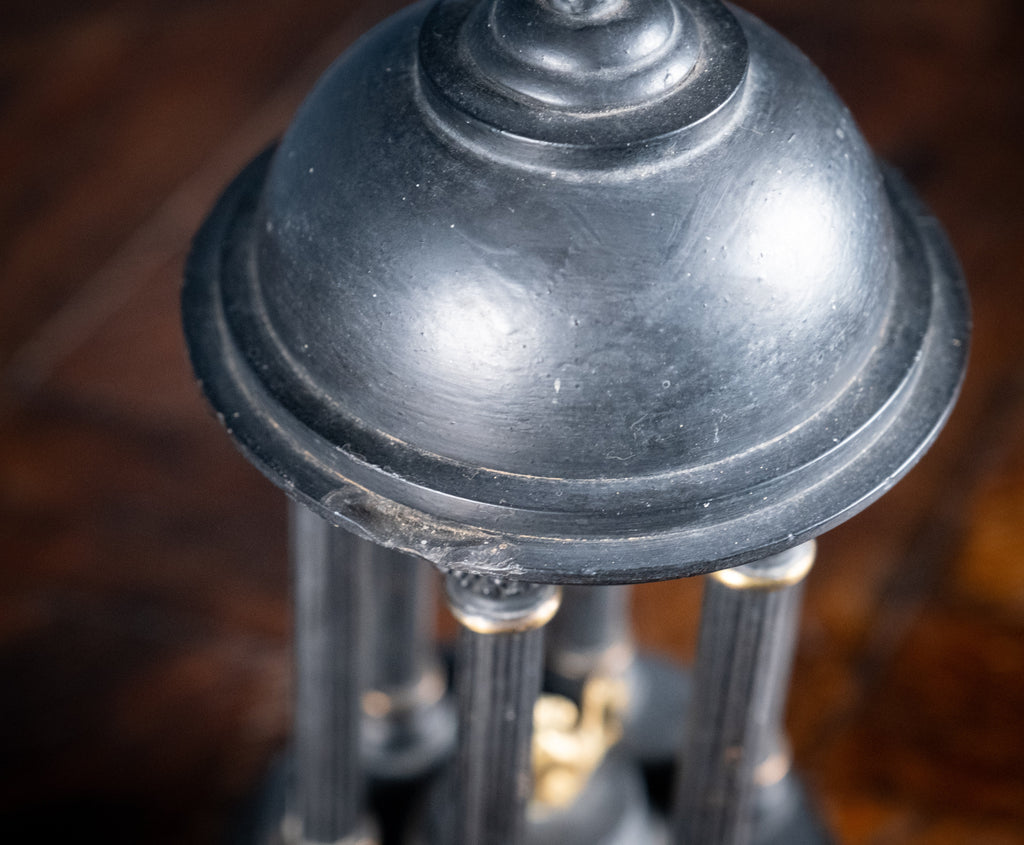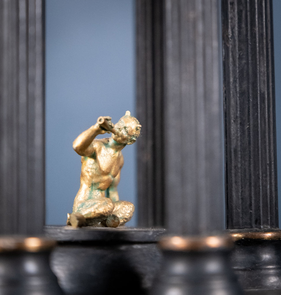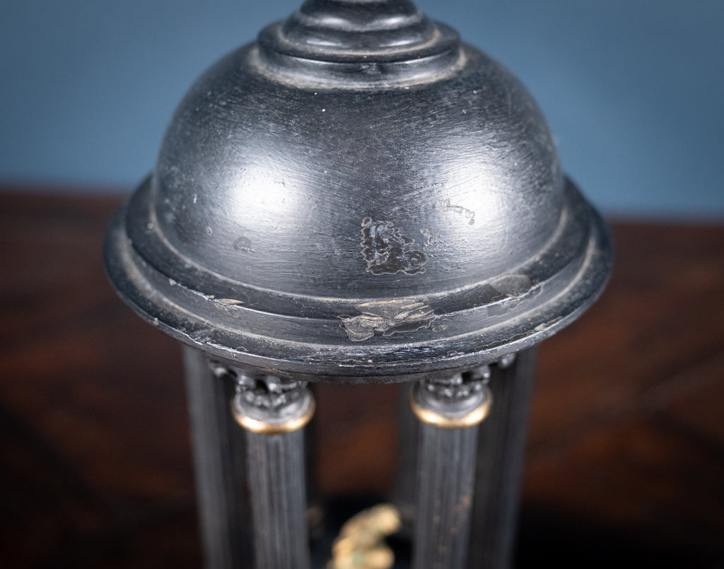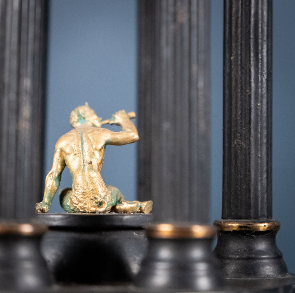 Each model boasts a domed top above six reeded pillars with gilt detailing above a stepped base. The small gilt bronze figures of Bacchus and Pan within each temple are very crisply cast and boast impressive detail.