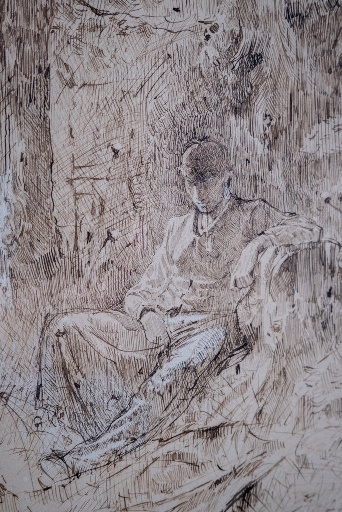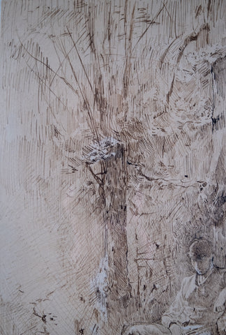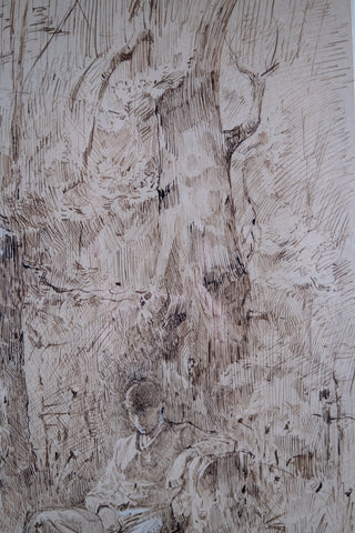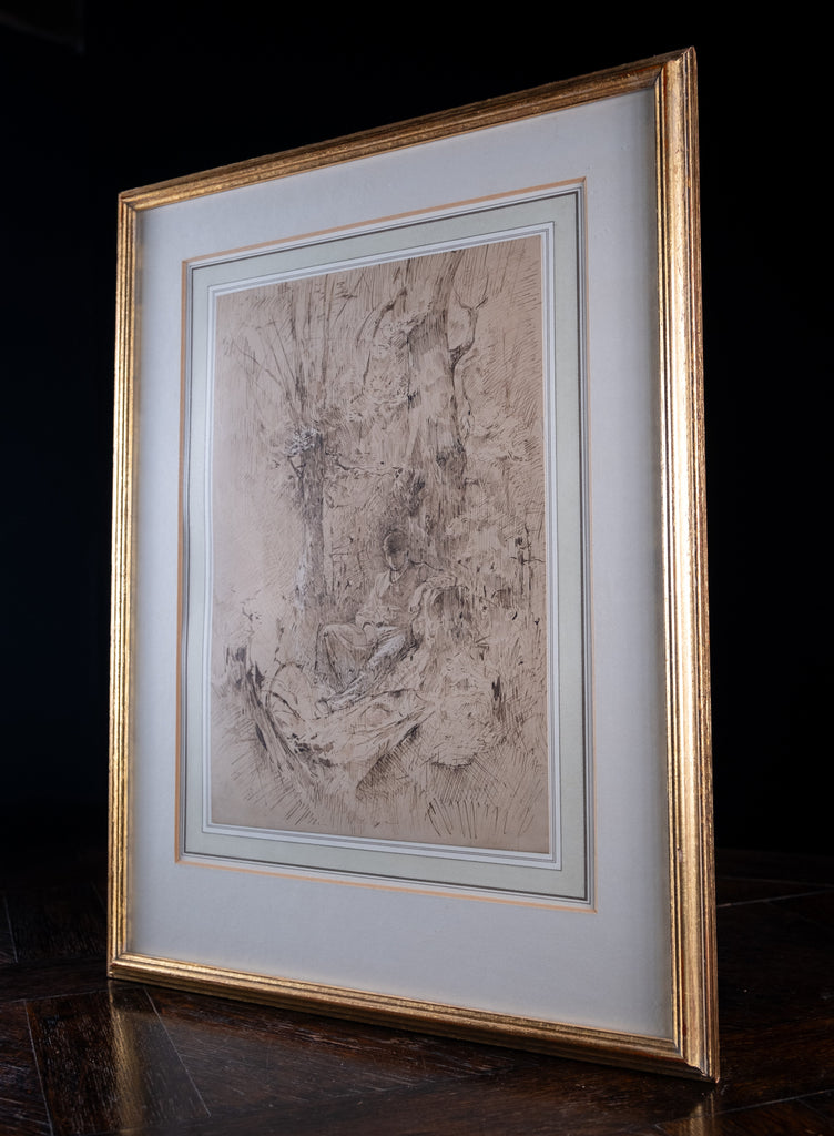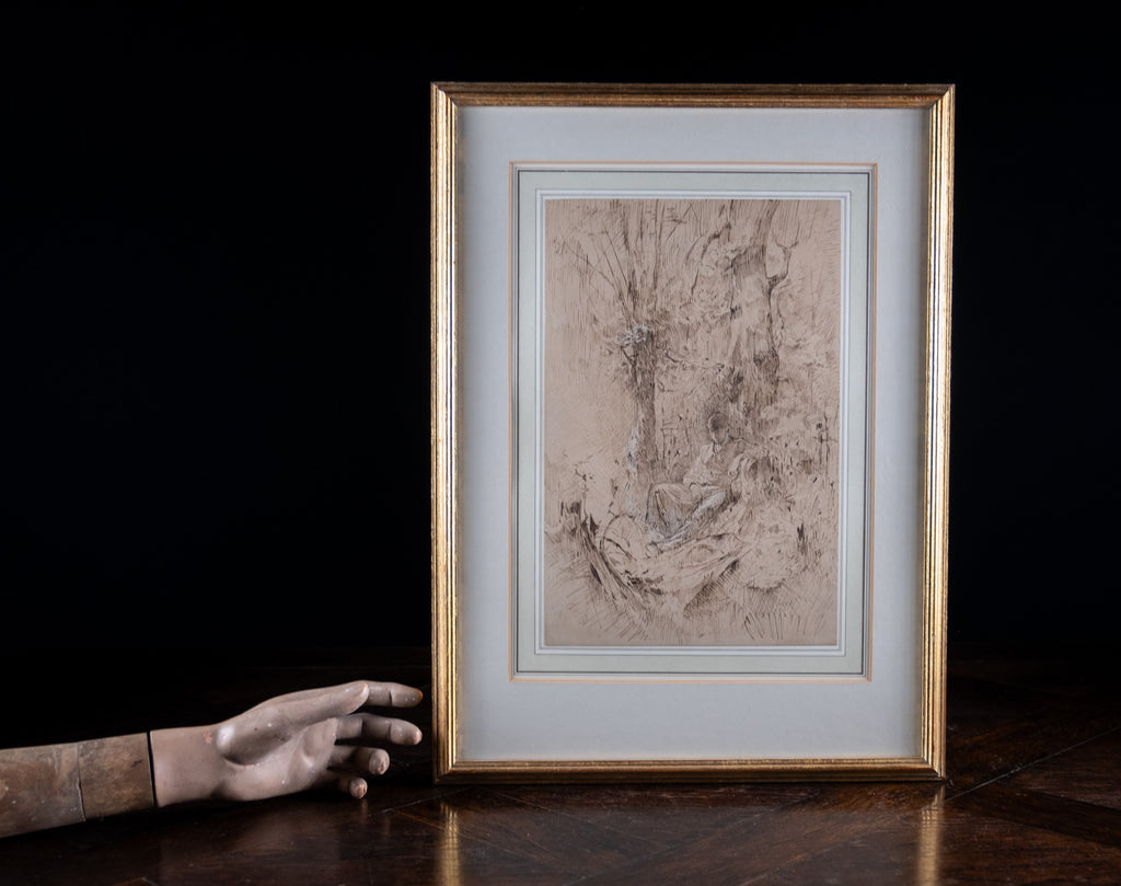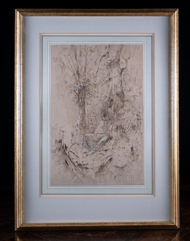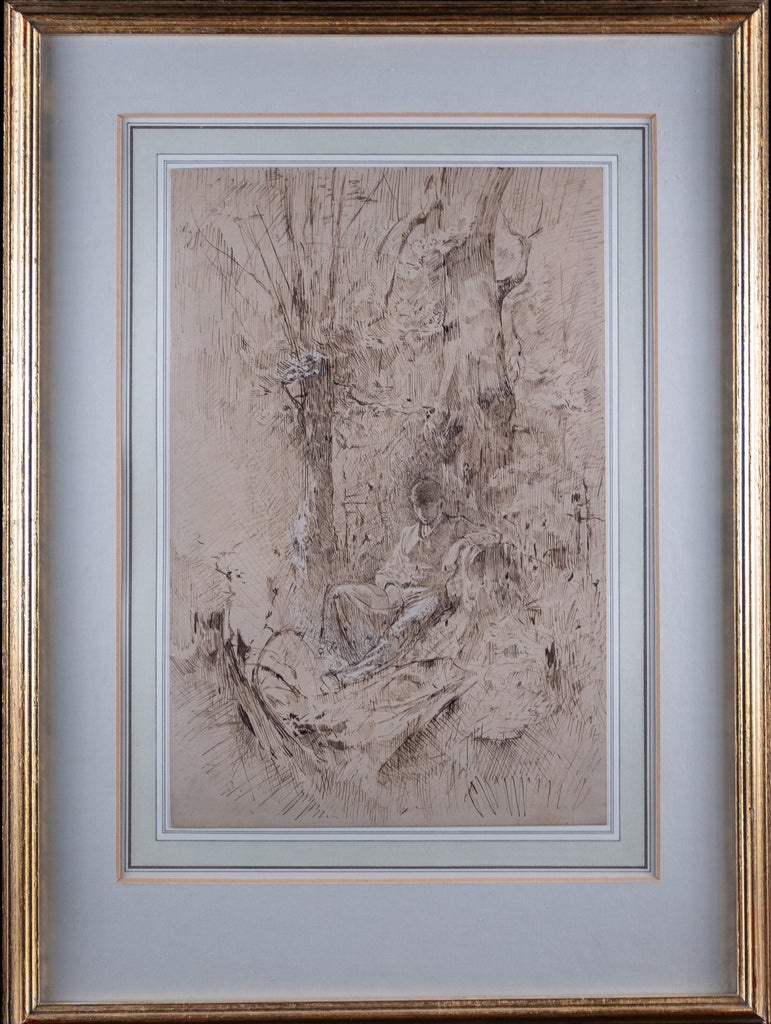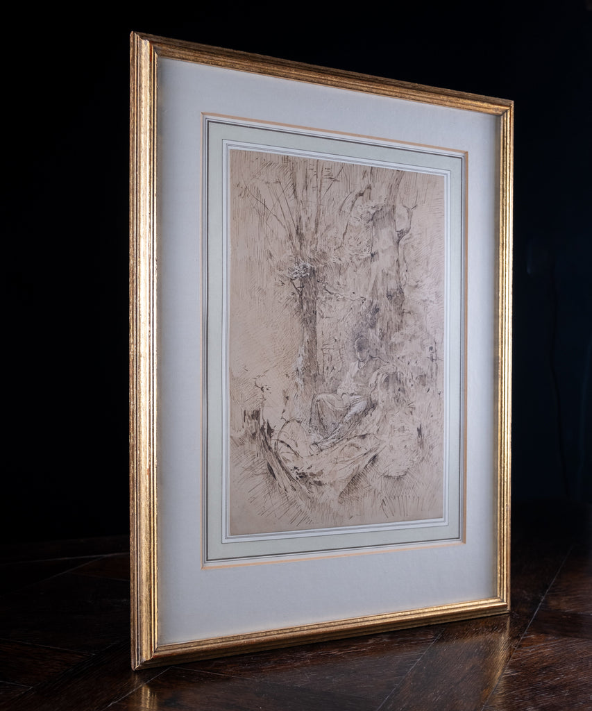 An extremely well drawn pen, ink and watercolour depicting a young man resting amongst trees. Unsigned. Undated. Probably circa. early 20th century.
