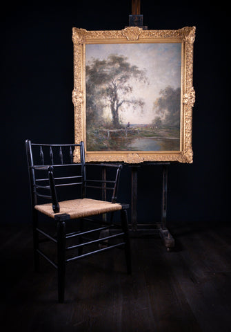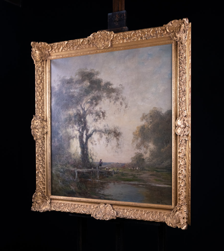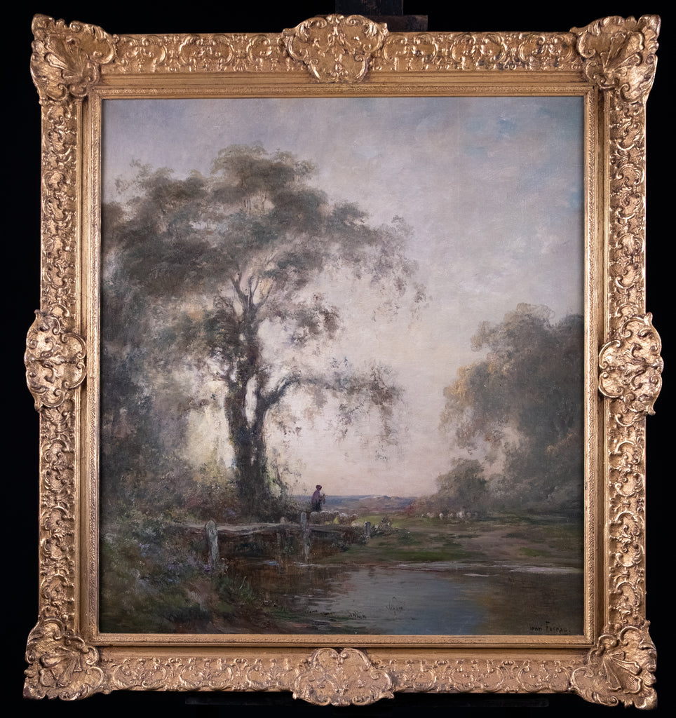This striking landscape scene depicts a shepherdess and her sheep crossing a small footbridge with the landscape extending out into background. The dominant subject of the landscape is the tree which has been masterfully painted reaching up into the morning sky. The whole work has an almost dream like quality.