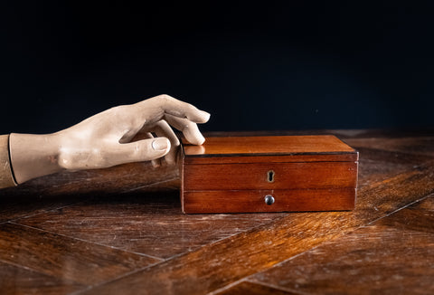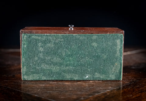 The hinged mahogany lid opens to reveal an array of watercolours, largely untouched, together with a further black watercolour paint block and accoutrements left by the box's previous artist. The bottom tray opens by lifting a pin and reveals a ceramic paint dish. The watercolours lift out to reveal three ceramic mixing dishes.