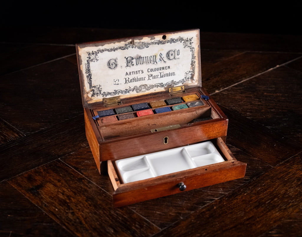 A charming artist's watercolour paintbox by George Rowney & Co. The box label states the company address as 52 Rathbone Place, London; George Rowney & Co are documented as operating from that address between 1854-1862 and dates the box nicely thus. Key absent.