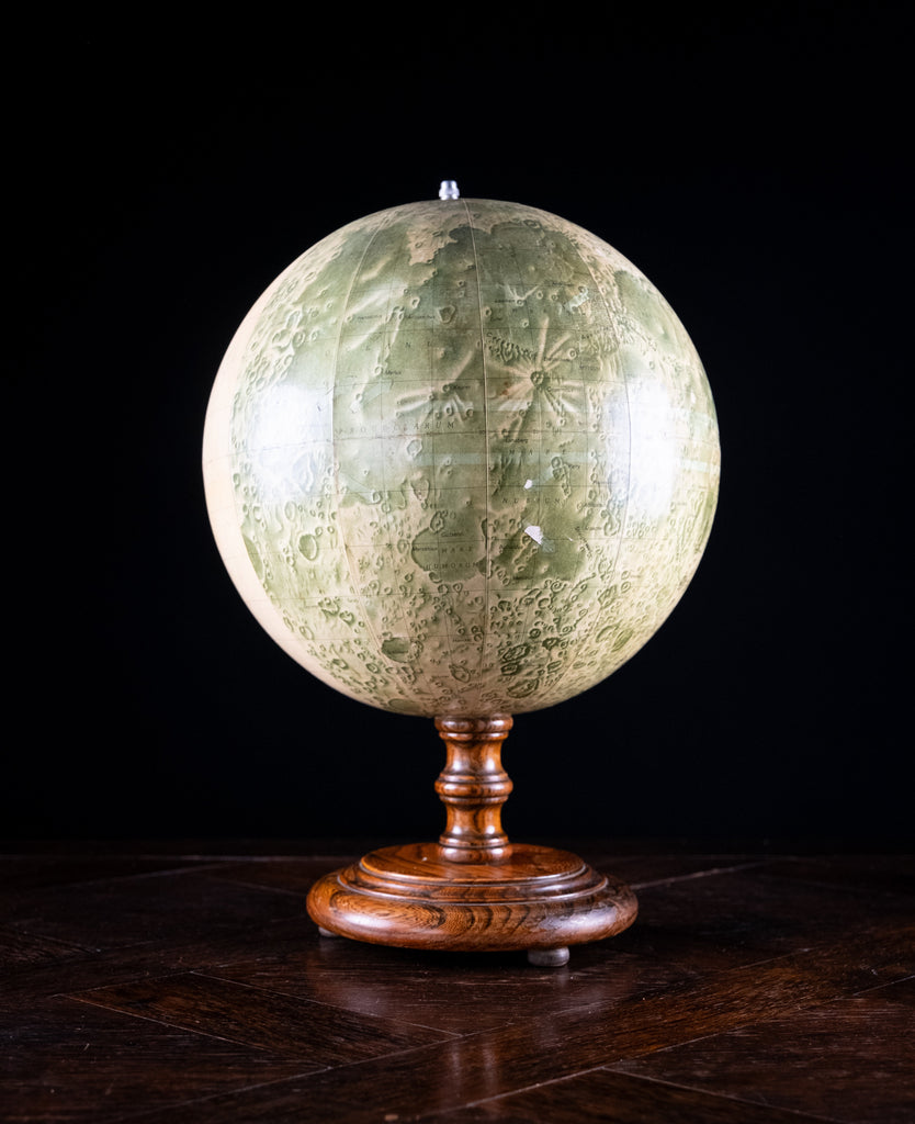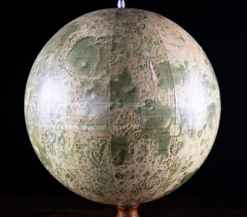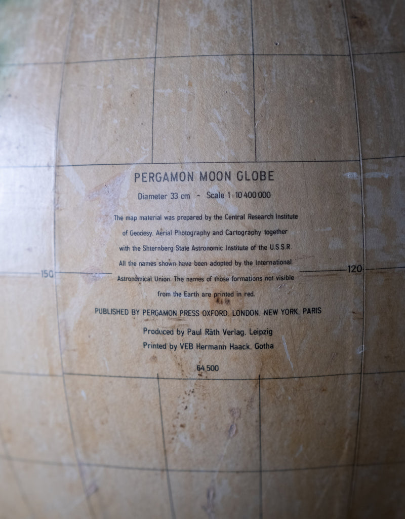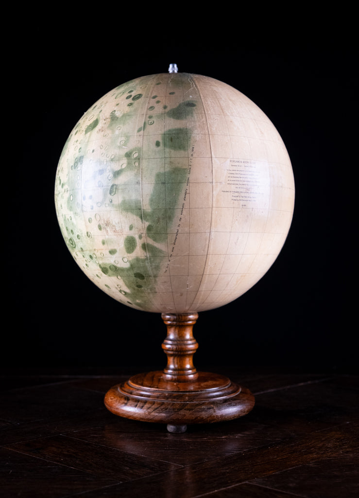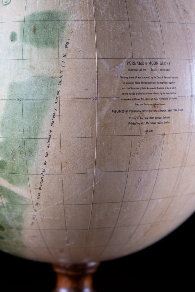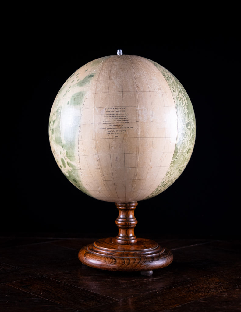 A 'Pergamon Moon Globe' or lunar globe. Produced by Paul Räth Verlag, Leipzig for Pergamon Press, c.1963. Diameter 13 inches (33cm). Scale 1:10,400,000. Mounted on a turned oak stand.