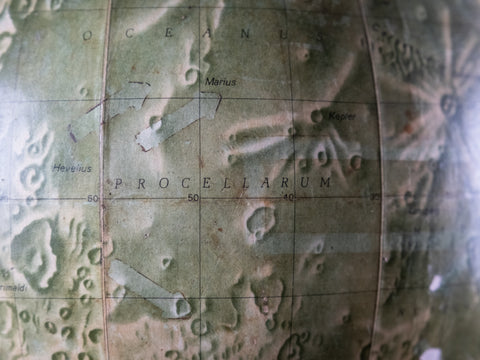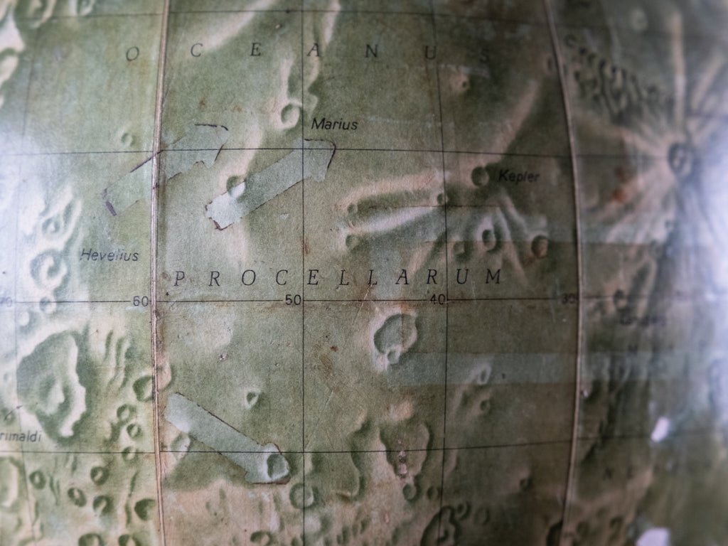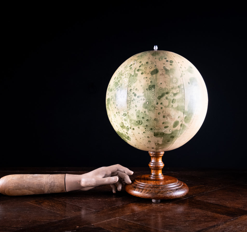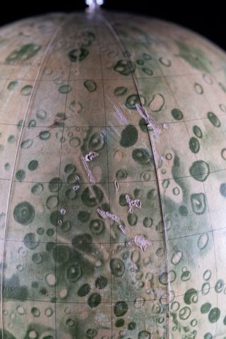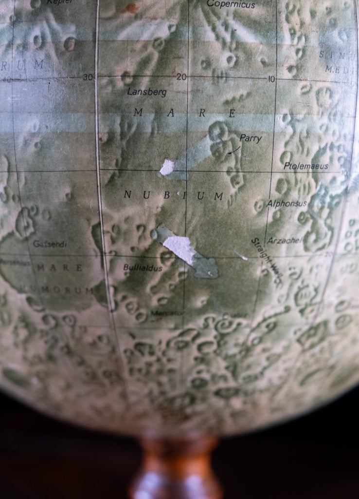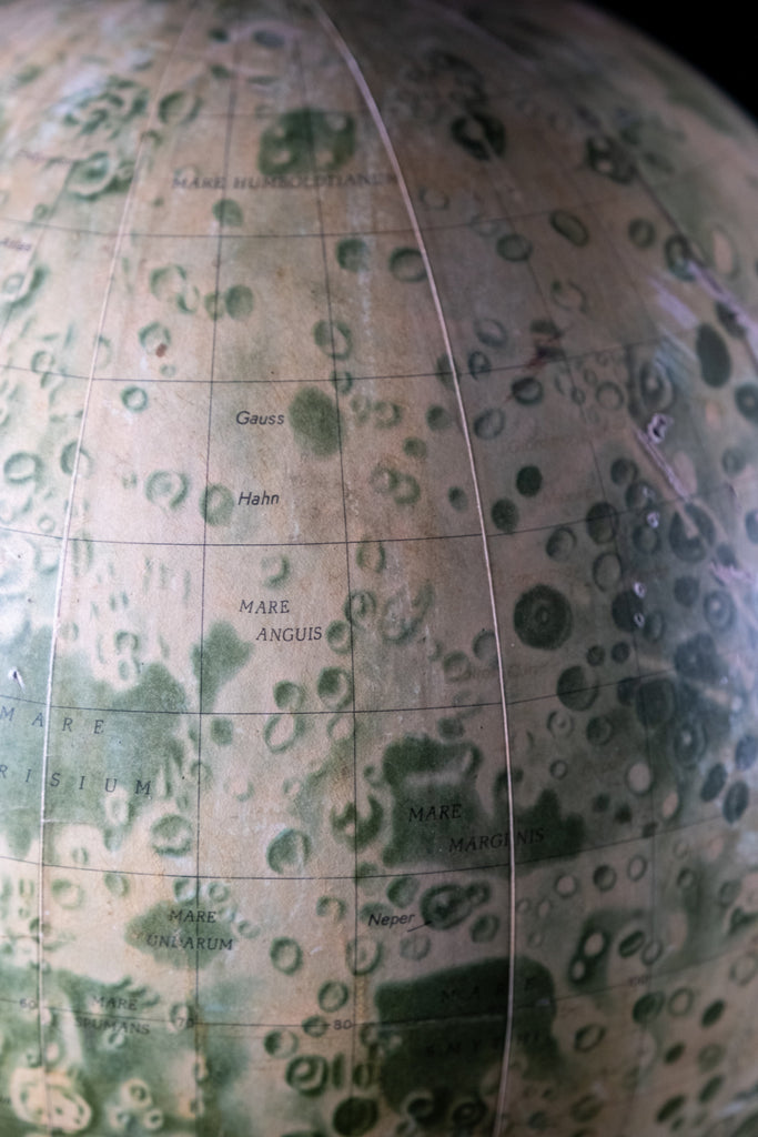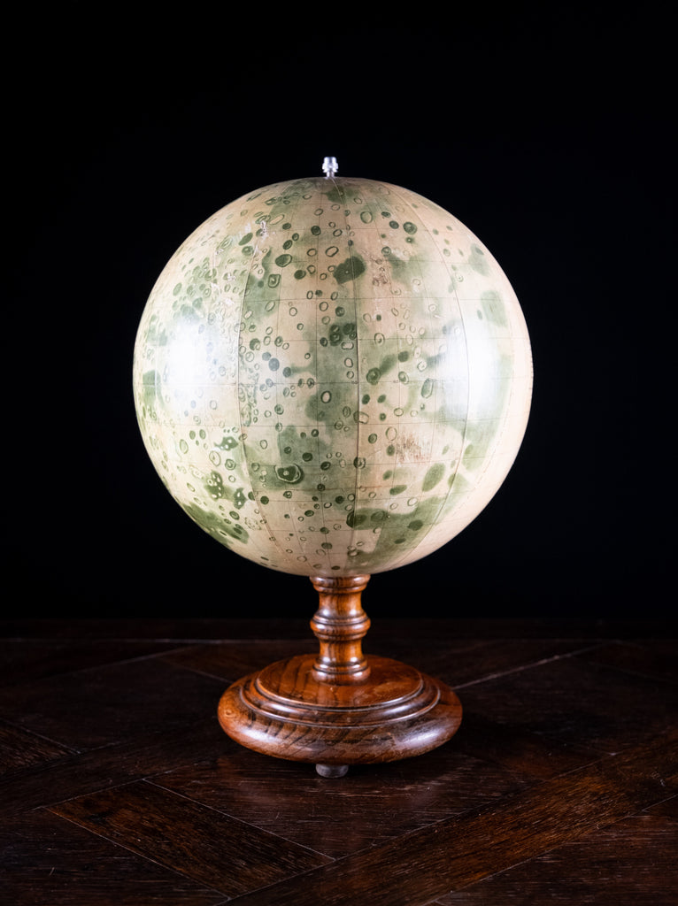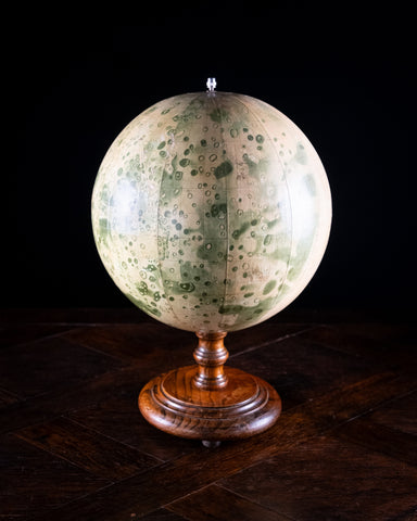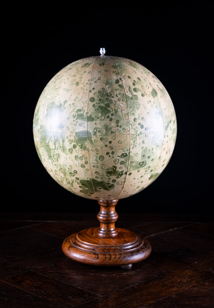 A 'Pergamon Moon Globe' or lunar globe. Produced by Paul Räth Verlag, Leipzig for Pergamon Press, c.1963. Diameter 13 inches (33cm). Scale 1:10,400,000. Mounted on a turned oak stand.