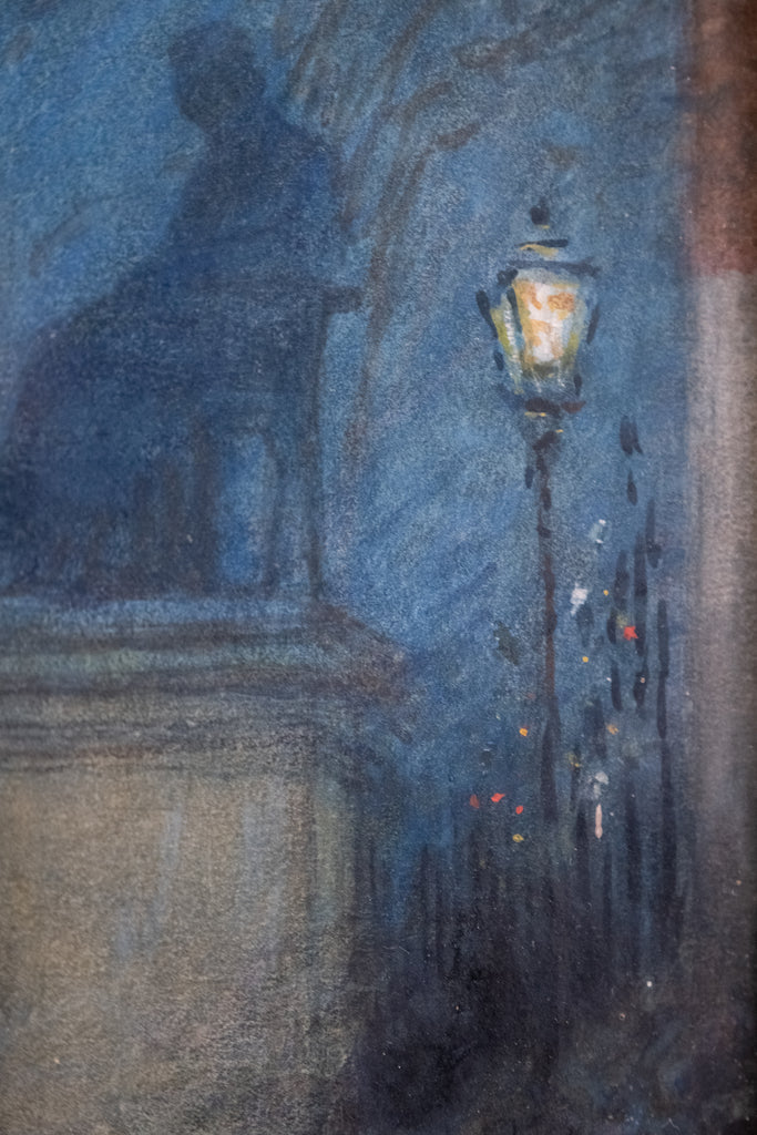 The scene is expertly depicted with the light radiating from the windows and gas lamp in such a way that the viewer gets the clear impression that it is raining. The monument looms hazily to the centre surrounded by shadows and the night sky. Housed in a later gilt frame.