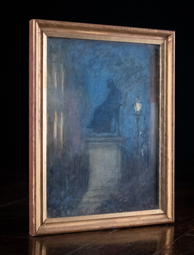 An atmospheric gouache depicting the statue of Sir Walter Scott at Princes Street Gardens, Edinburgh at night. Circa. late 19th/early 20th century. Unsigned. By repute the work is attributed to Scottish artist Katharine Cameron R.S.W, R.E (1874-1965). Whilst Katharine Cameron is more widely known for her fae and flowers, she has been known to sketch Edinburgh landmarks such Edinburgh Castle and Canongate.