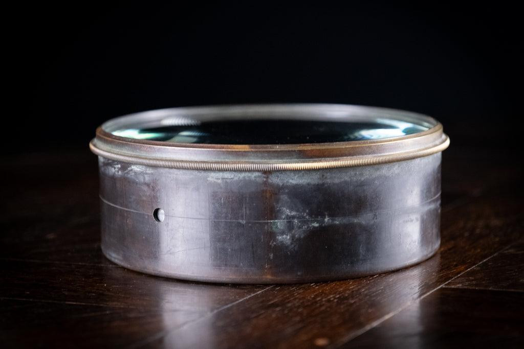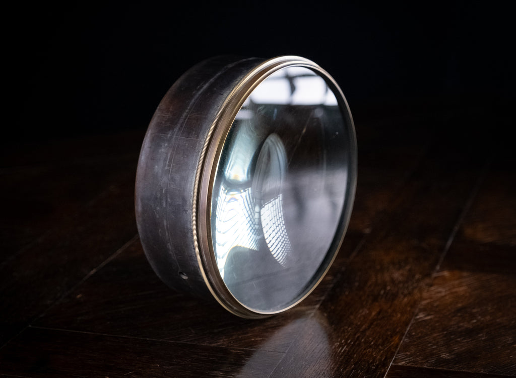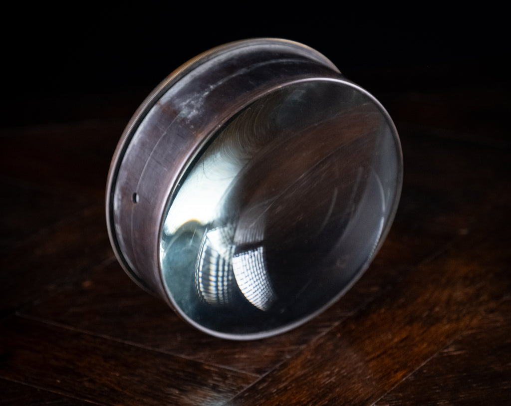 The large lens is mounted in a brass body with ribbed detailing to the outer edge. The brass surround has two holes to each time indicating the lens was mounted upon a support originally.