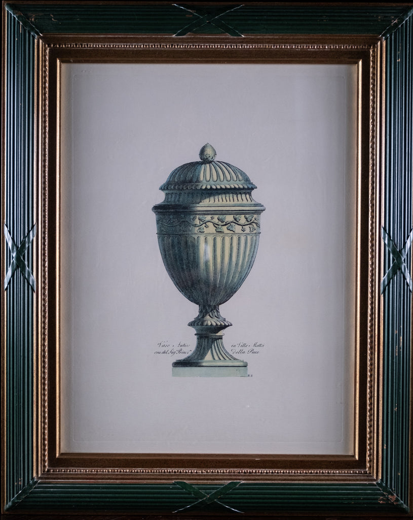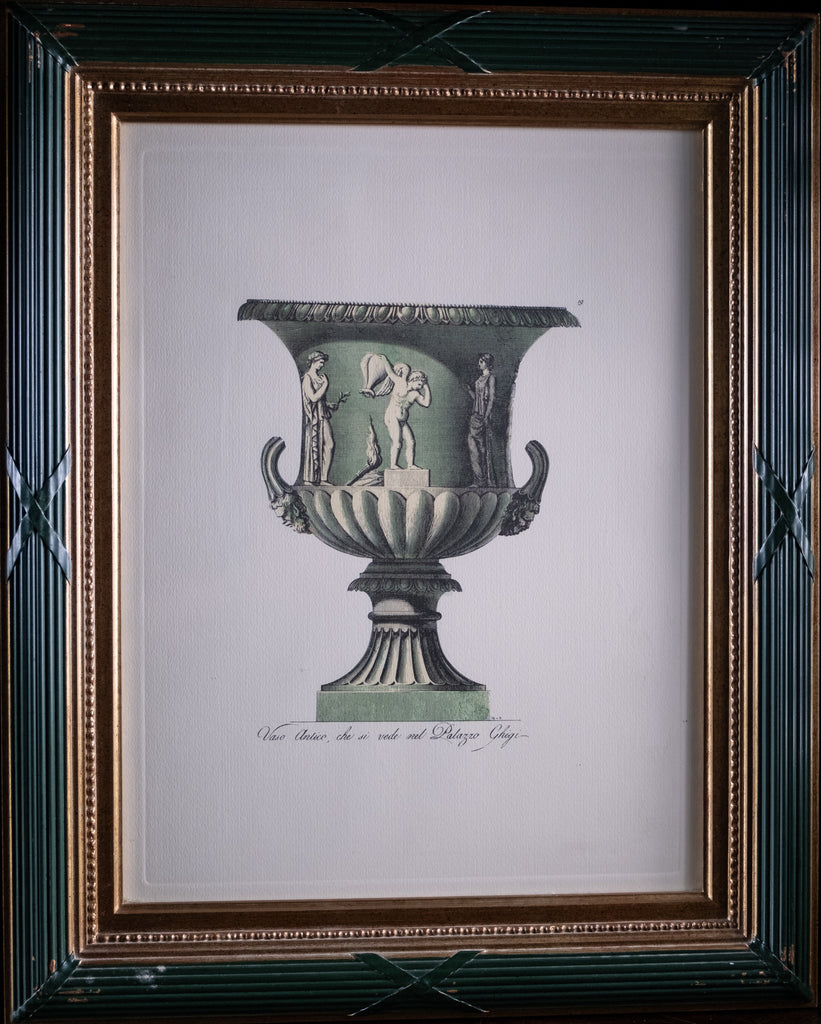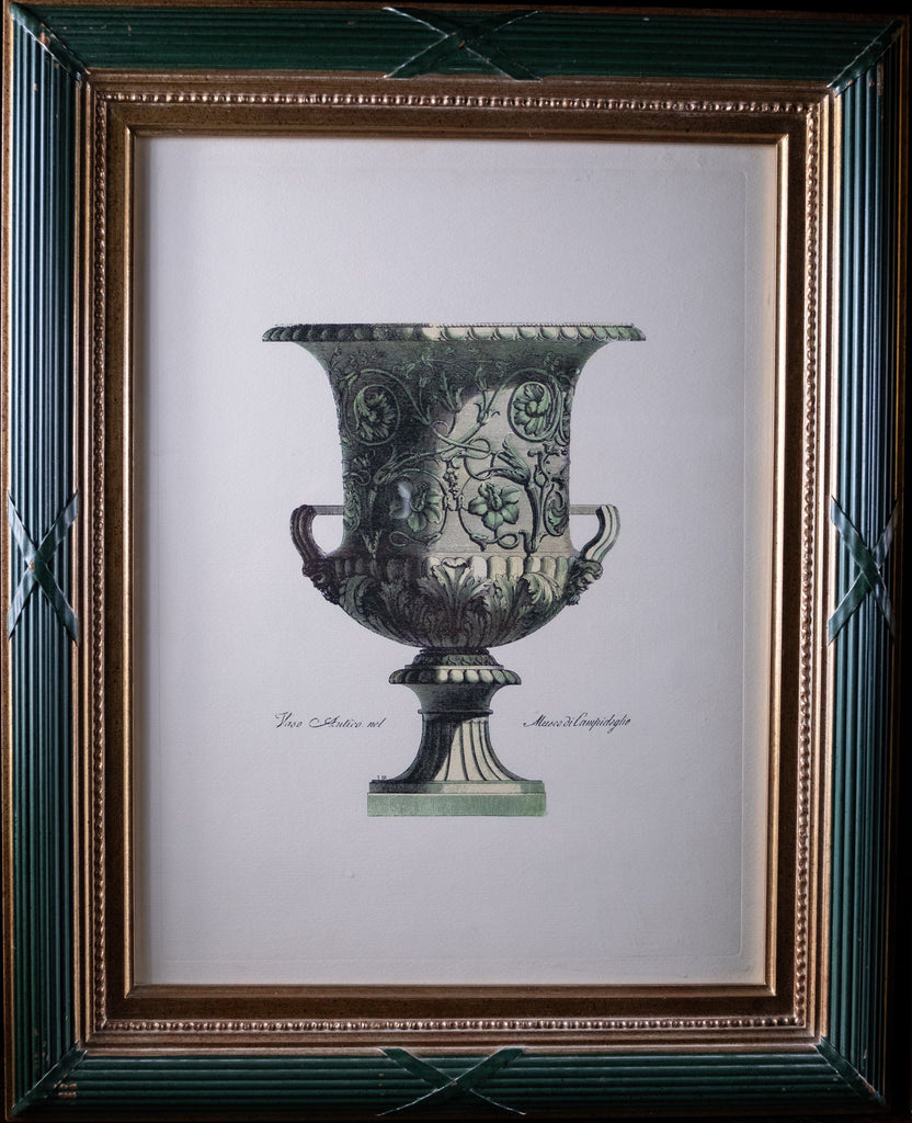 Each work is housed in a contemporary rich green and gilt reeded frame.