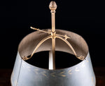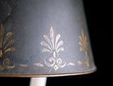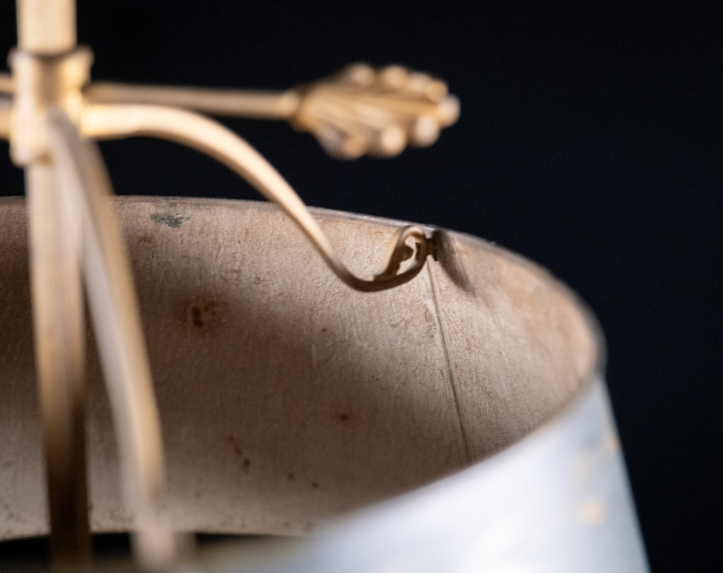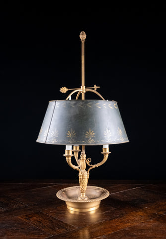 The three neoclassically decorated branches rise above a concave dish with an athemion ornament. The square shaft and further athemion ornament rise to a fully adjustable parcel-gilt and green toleware shade decorated with palmettes.
