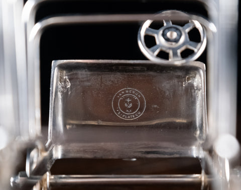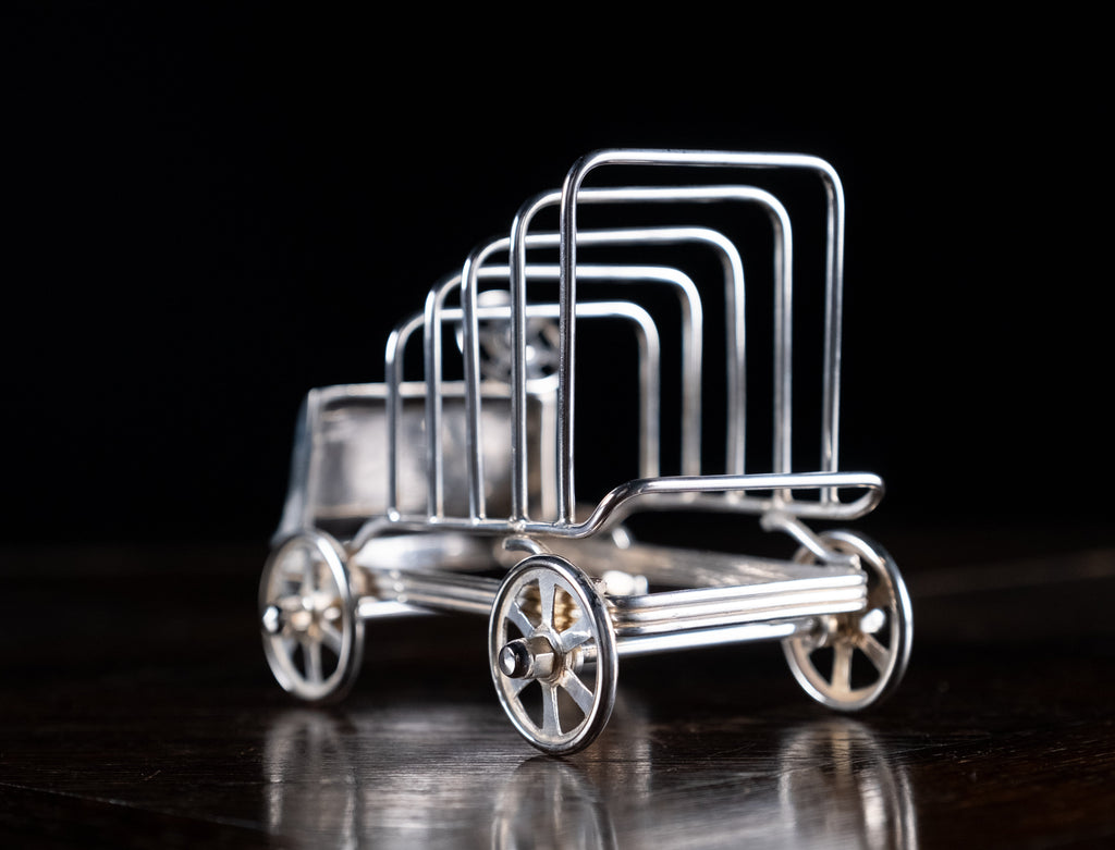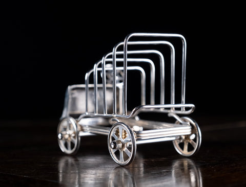 A delightful Edwardian period novelty car toast rack by the Van Bergh Silver Plate Co. (operating 1892 - 1926). Van Bergh stamp clearly to the inside front.