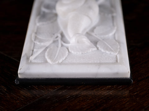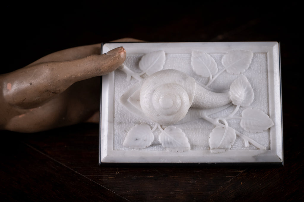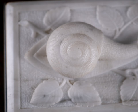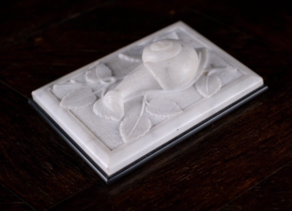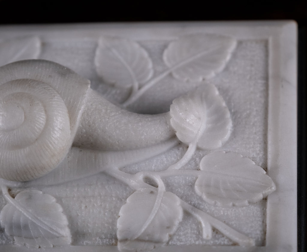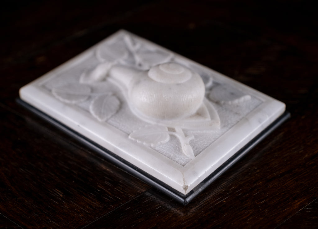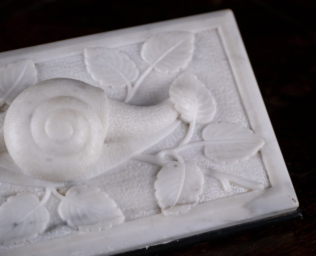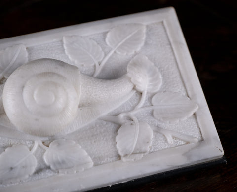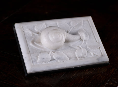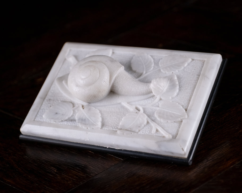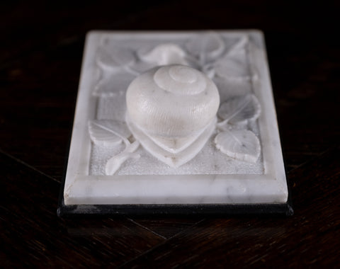 An unusual Victorian carved marble and slate paperweight of large proportions, depicting a snail amongst a plant with its head hidden behind a leaf.