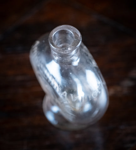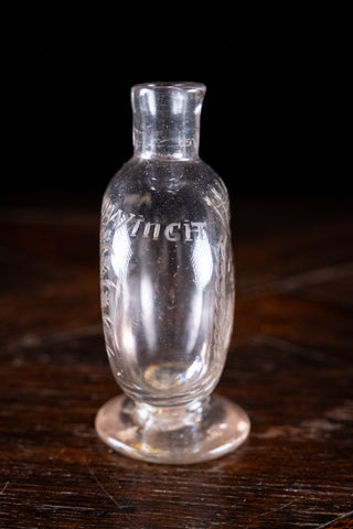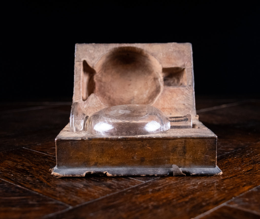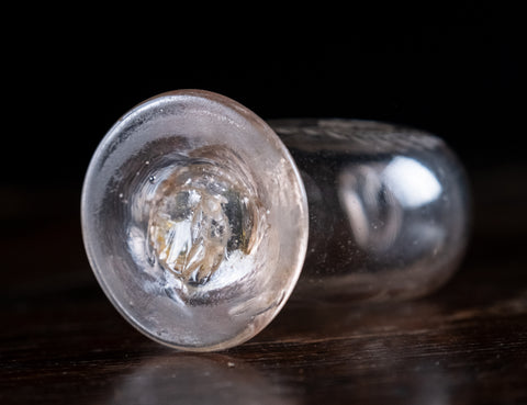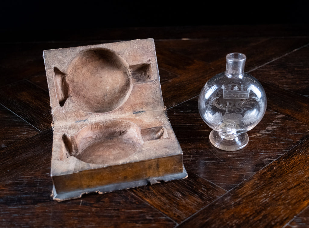 The glass flask is engraved on both sides. One side has the initials 'P.M' beneath a crown. The other is decorated with a scene of a child riding a mythical creature beneath the latin phrase 'Amor Omnia Vincit' ('Love Conquers All'). The flask has an historic repair to the foot but otherwise remains in a good condition, with all the character one would expect in a glass piece of this age.