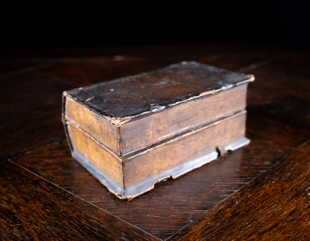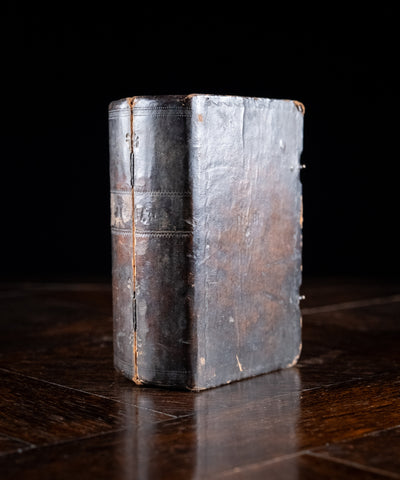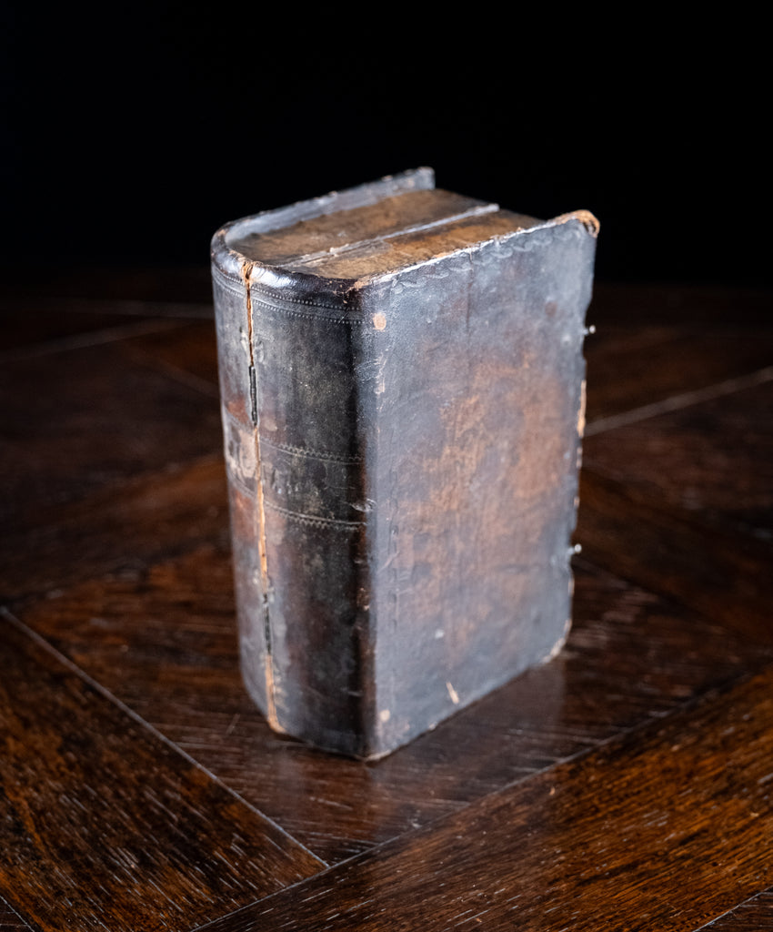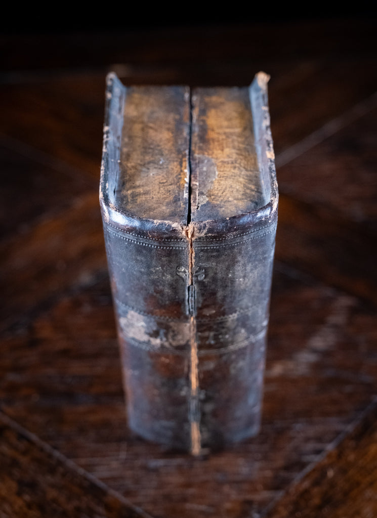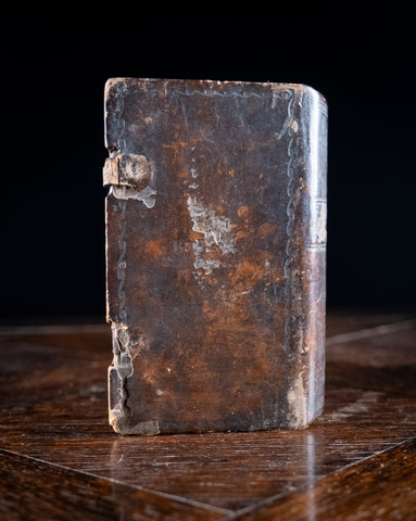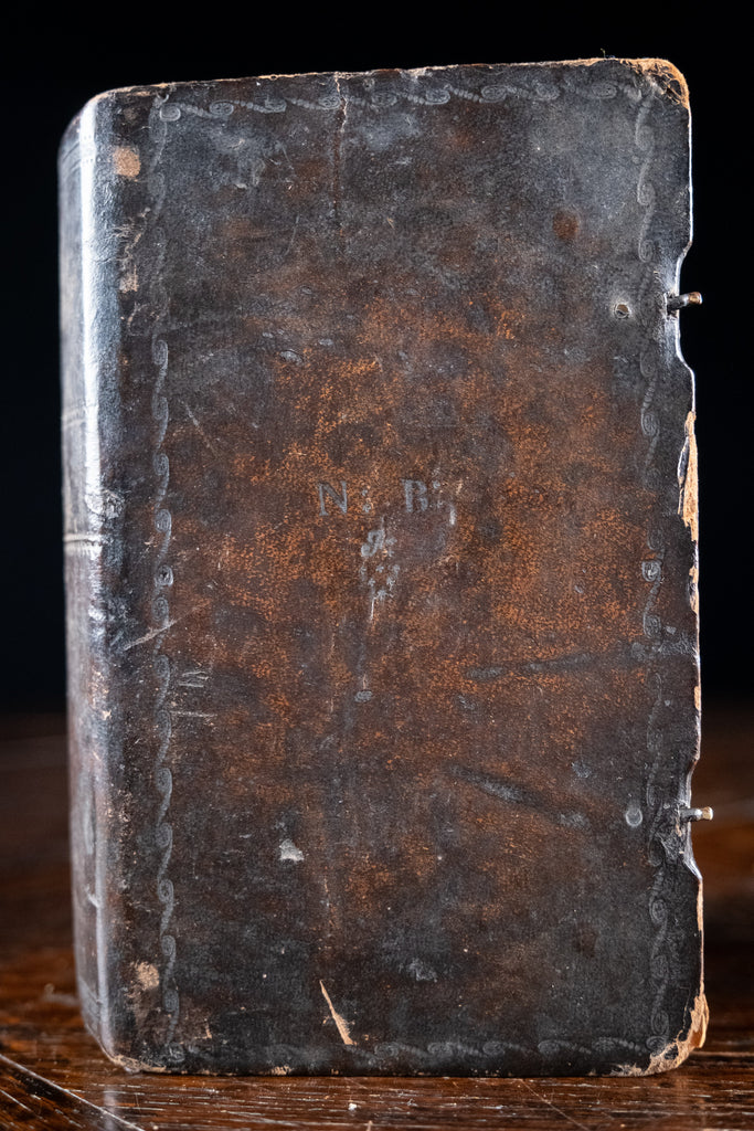 The hinged book is fully bound in tan leather with blindstamped decoration. Signs of wear throughout. Remnants of leather strapping to the outer edges.