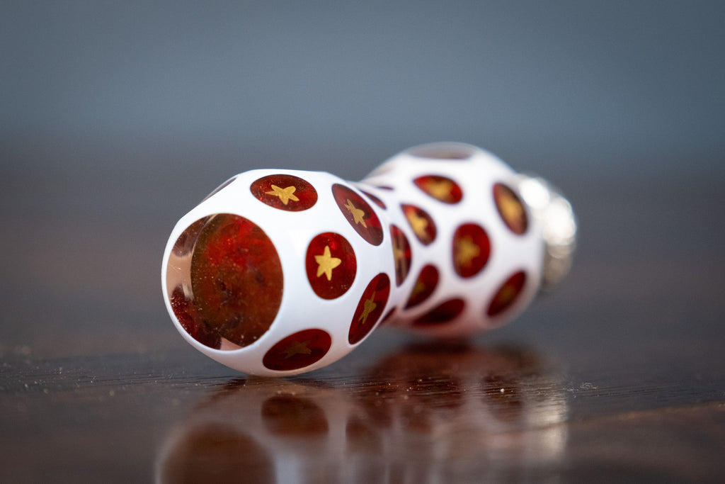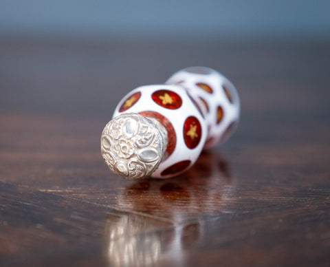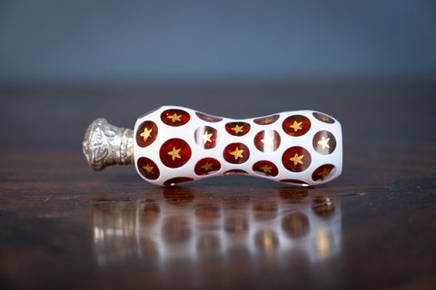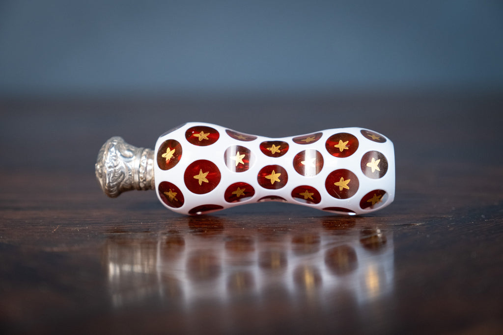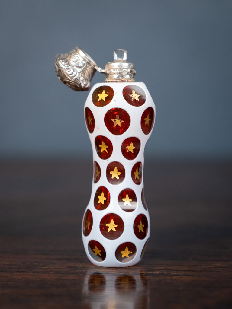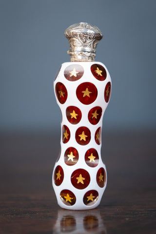 An unusual 19th century Bohemian ruby glass and white overlay scent bottle with hand painted gilt stars and silver lid, c.1860.
