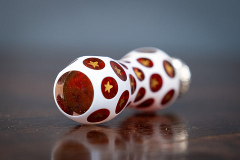 The scent bottle is of an extremely attractive form with a nipped waist and cut away white overlay creating concentric circles of ruby glass, within each of which is a hand-painted gilt star. The lid is unmarked but tests as silver. The bottle stopper fits snugly.