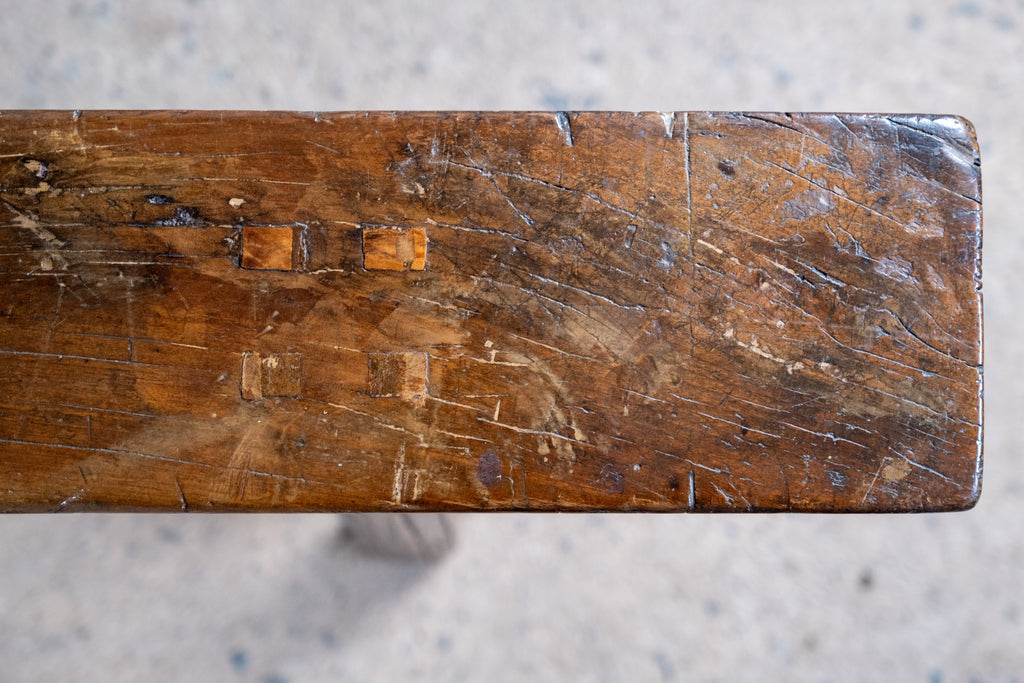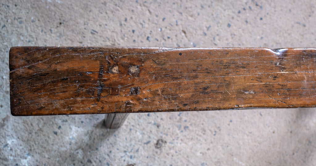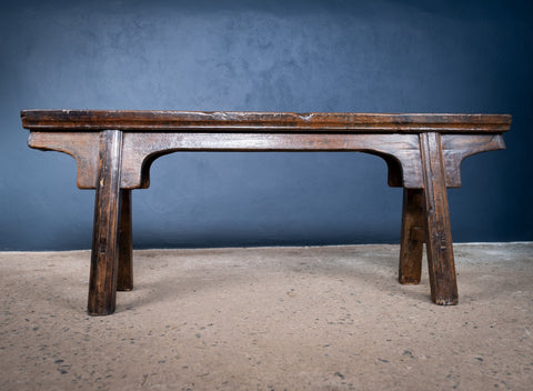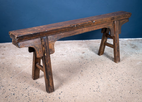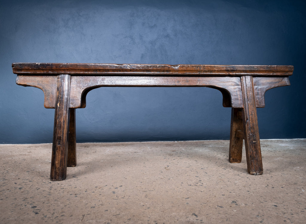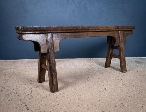 The bench is a two-person bench of classic form; it is substantial and stands firm. The wood has a truly outstanding patina throughout. Chinese symbols can be found to the underside.