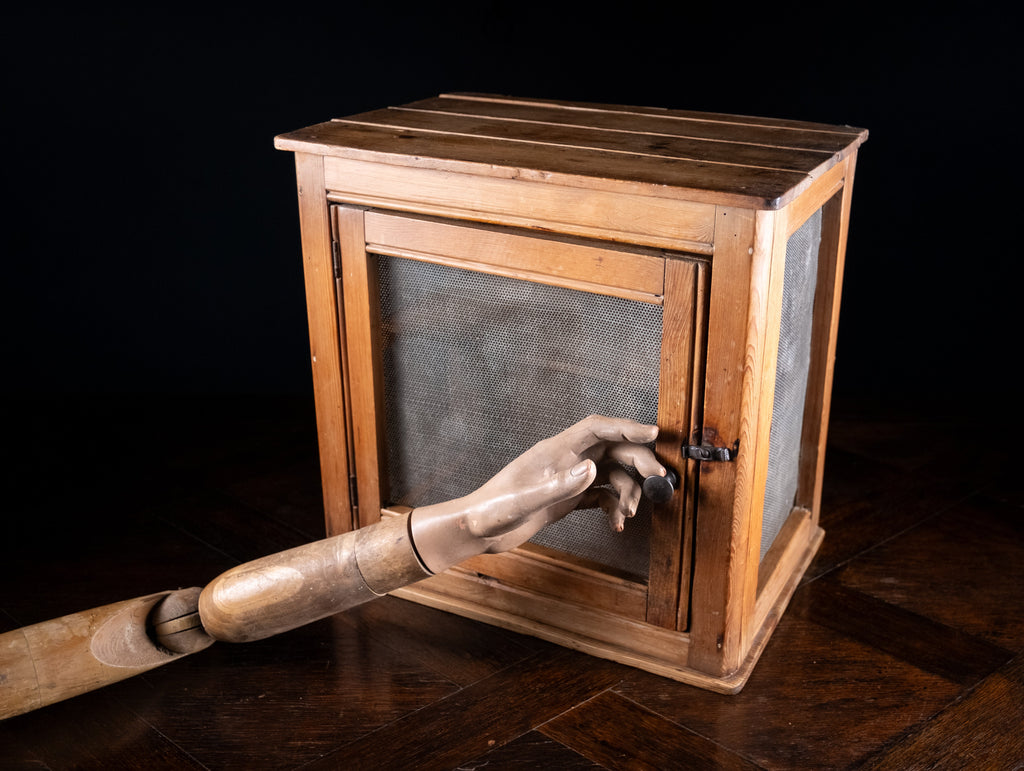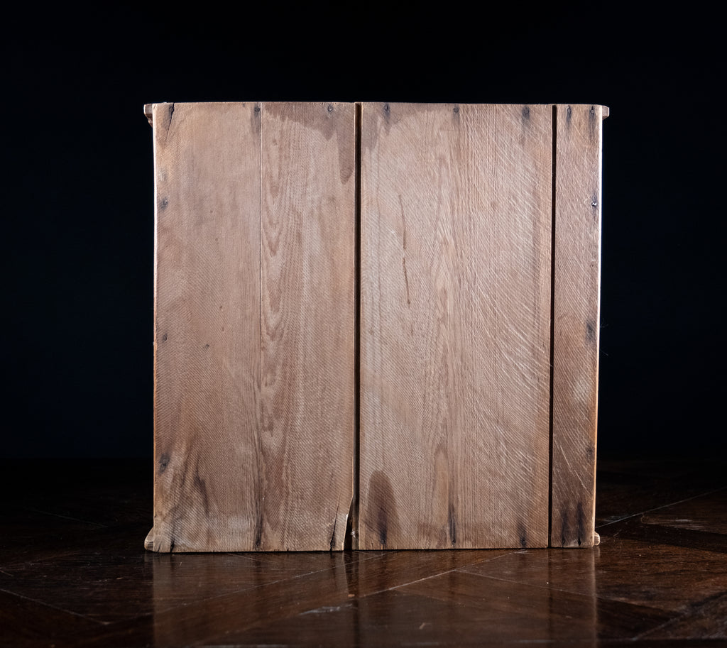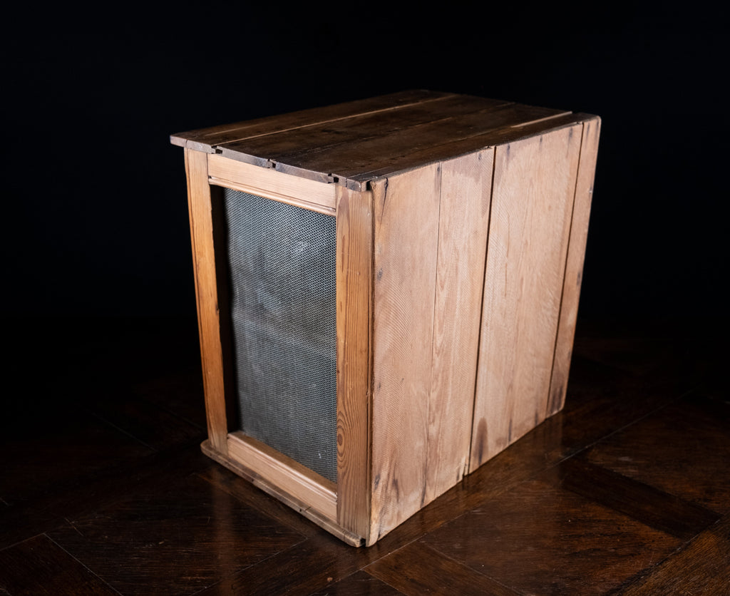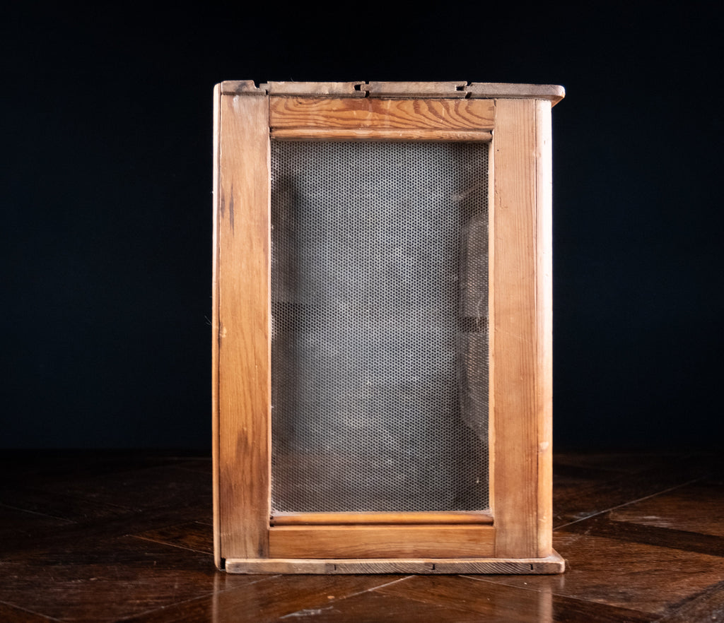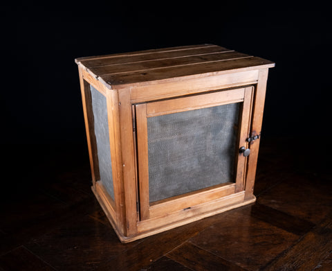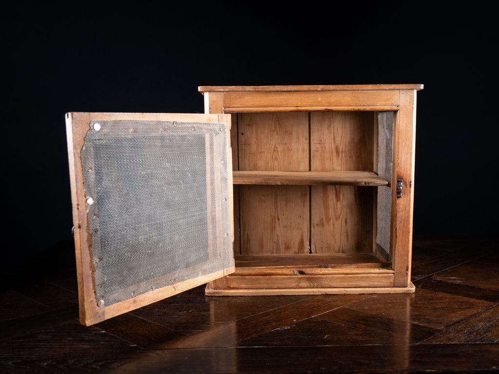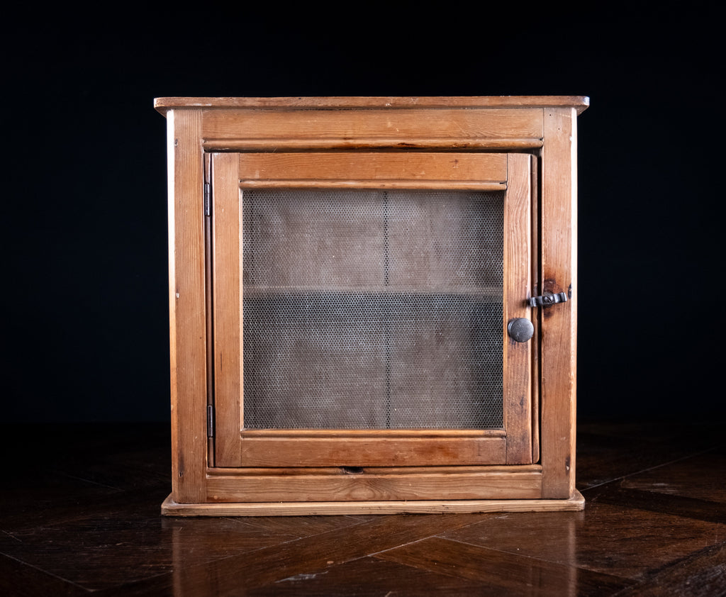Pitch pine throughout. Original gauze to the door and sides. The latched door opens to reveal a shelved interior.