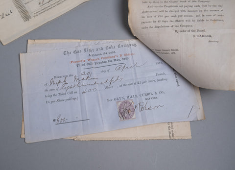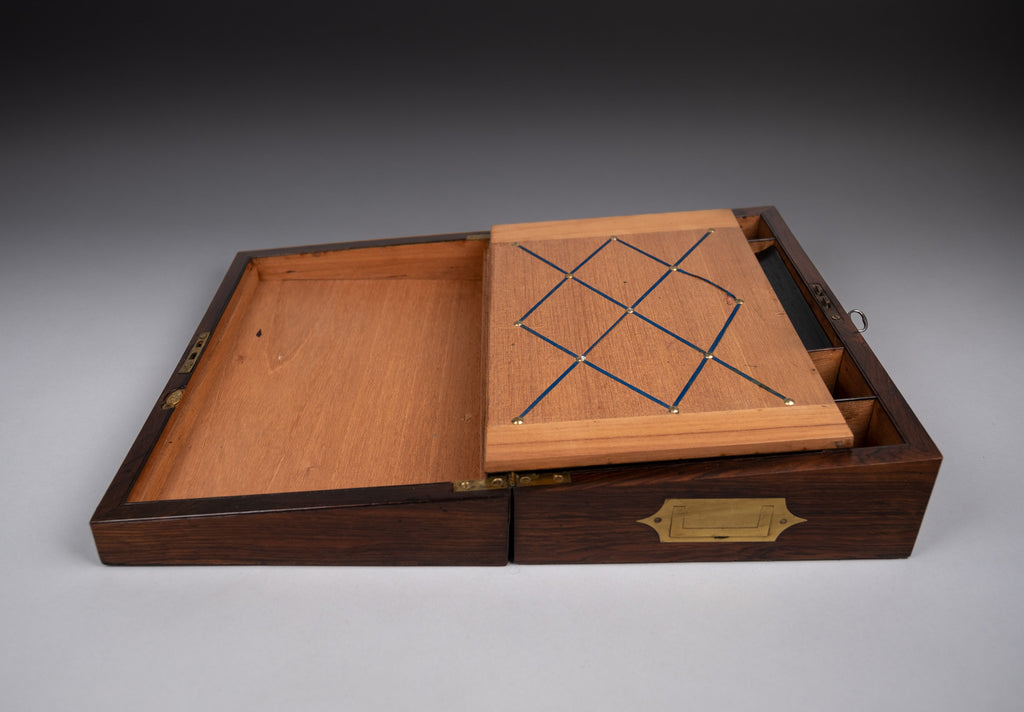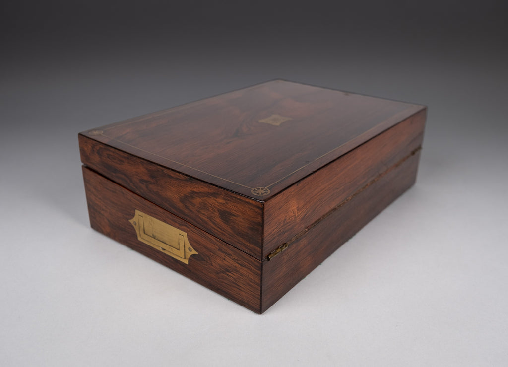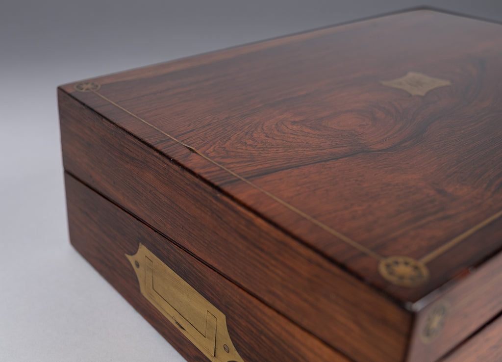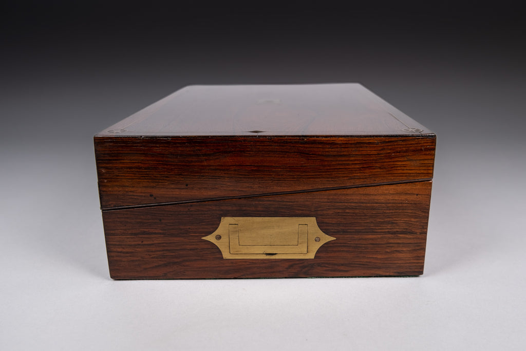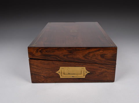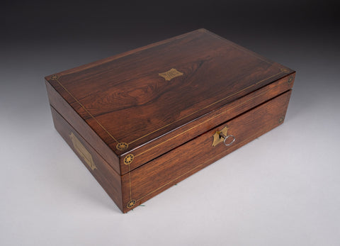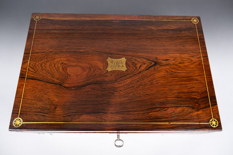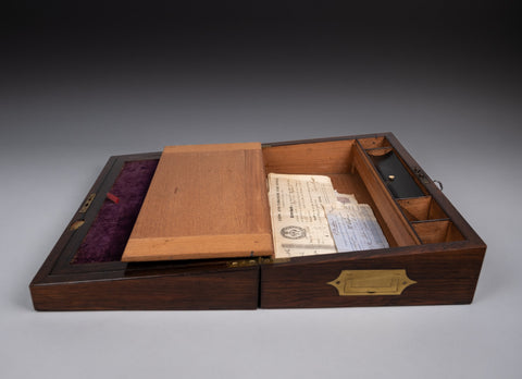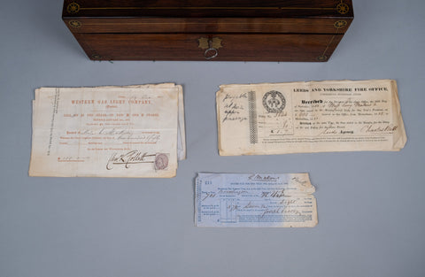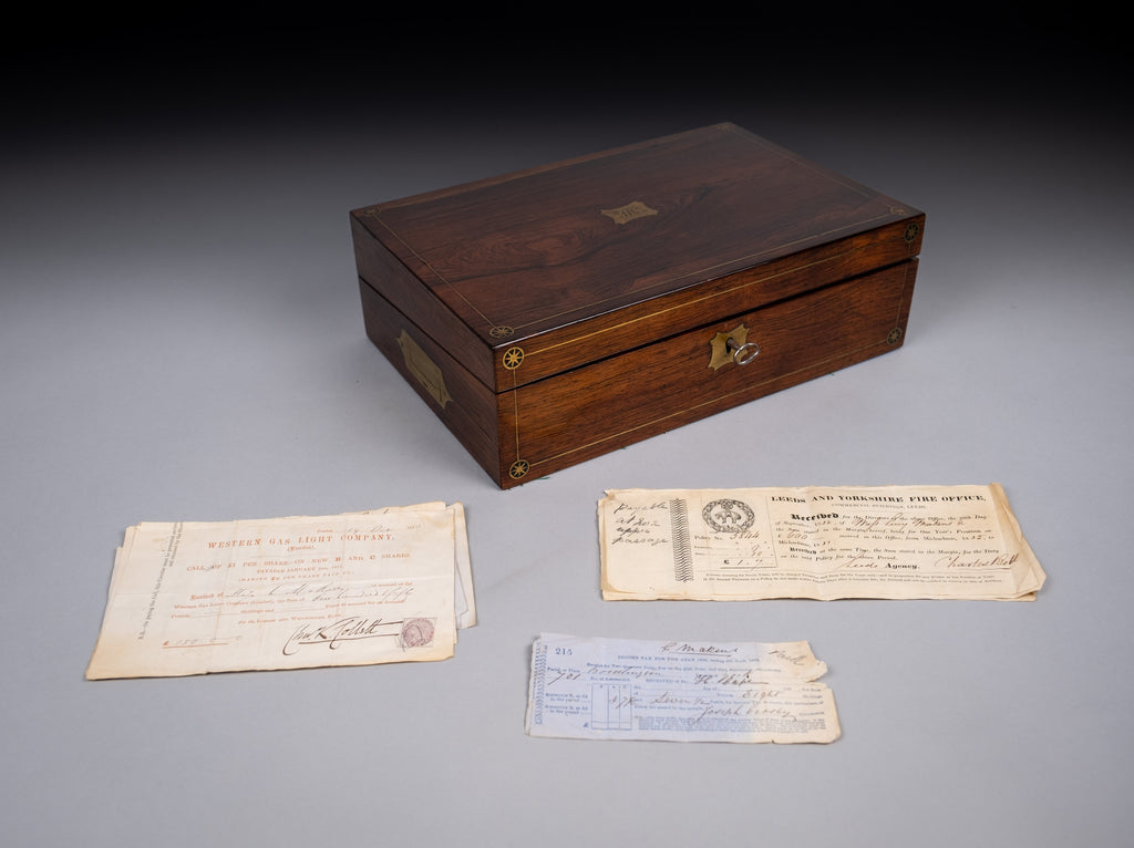 An attractive 19th rosewood and brass writing slope with lock and key, together with share certificates dating from the 1820s and 1860s for the Western Gas Light Company and Leeds and Yorkshire Fire Office in the name of 'Miss Lucy Makins'.