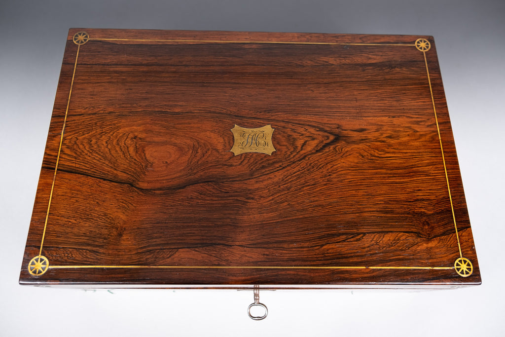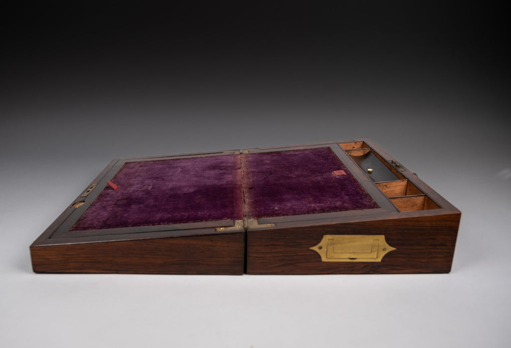 The writing slope boasts delicate brass inlay to the top and front with fine star detailing to the corners, together with campaign style brass handles to the sides. The box opens to reveal a plush purple velvet lined interior with two glass inkwells. Each side of the slope lifts to reveal a compartment beneath.