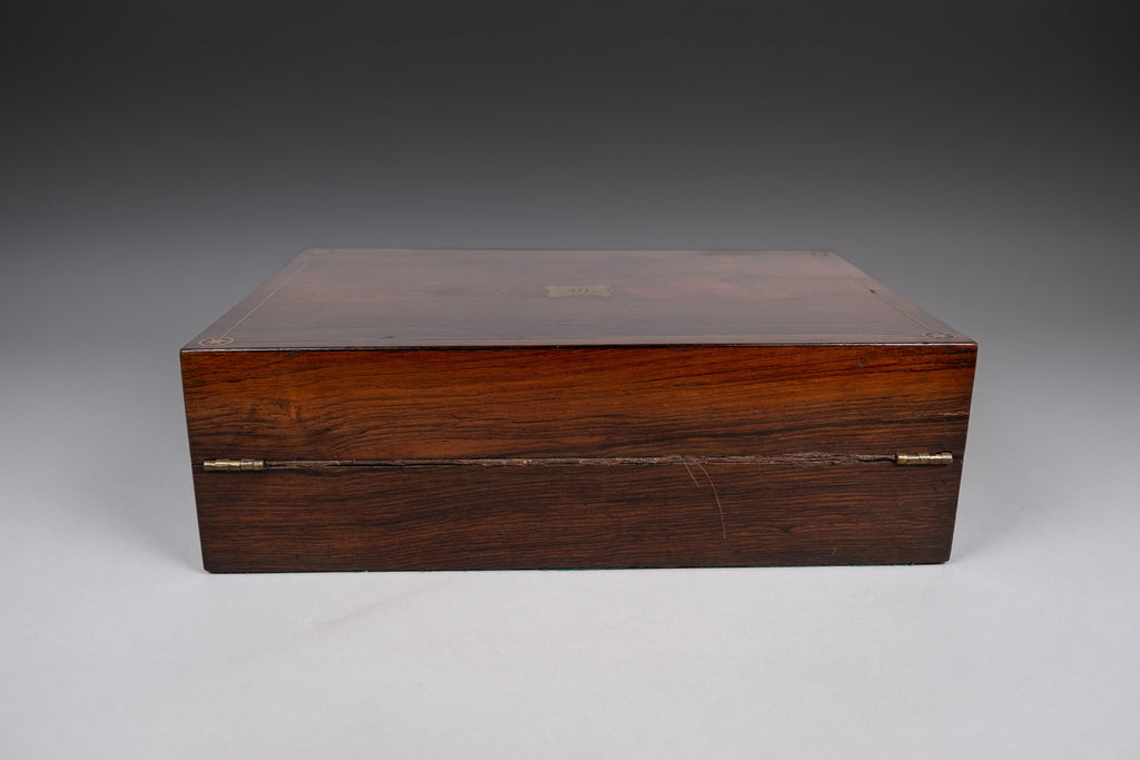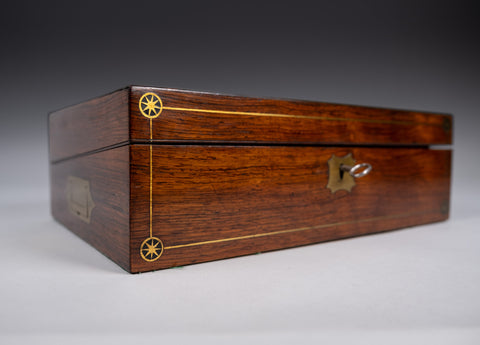 The box does lock but the mechanism is a little sticky; the lid does not fully close as a result. There is a small area of lift to the brass inlay to one side (please see photographs) but otherwise the inlay remains in a fine condition throughout.