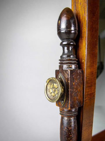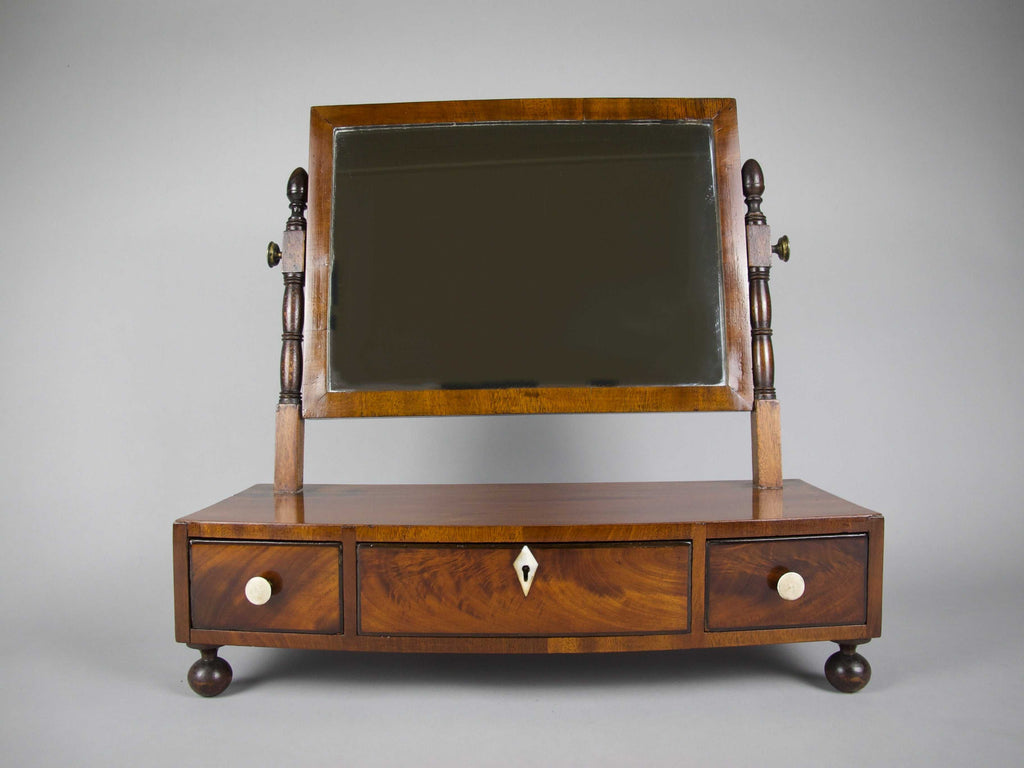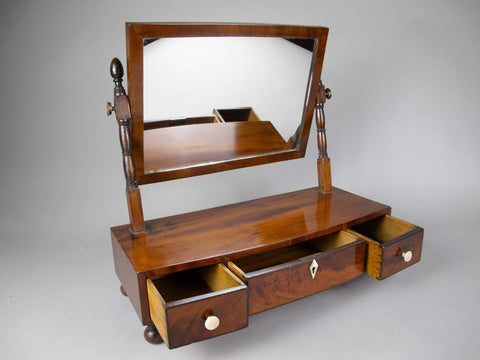 The mahogany is in an excellent condition with only one very small nick to one side (please see photographs). The rectangular framed mirror is flanked by stiles, each with a brass swing mechanism engraved with a flower. The swing mechanism operates as it should and the mirror glass is in an excellent condition.