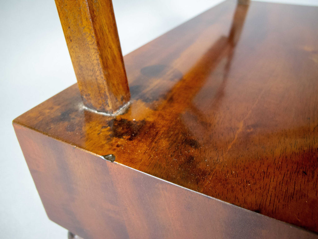 The three drawers open with ease and have visible small dovetail joints. There is no key for the centre drawer ,but it can be easily opened from the underneath of the mirror.
