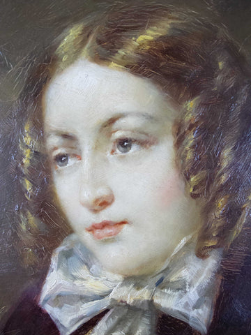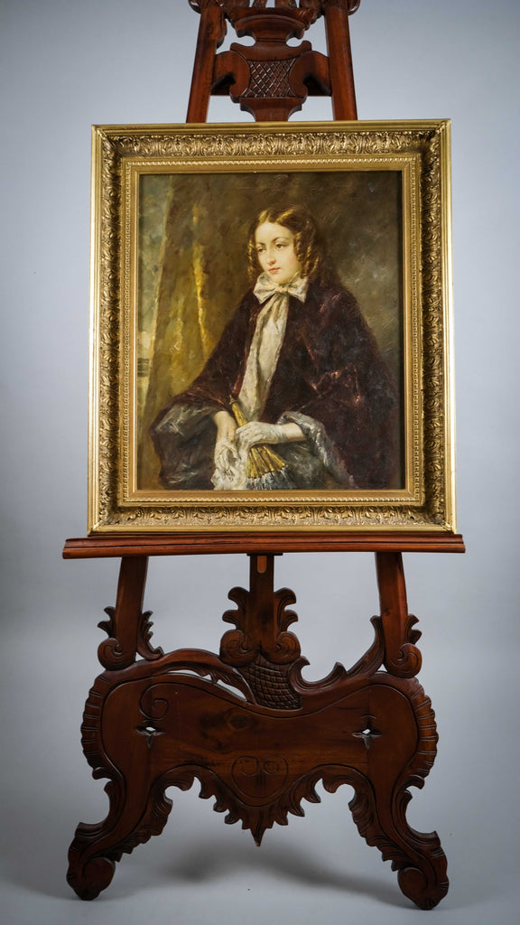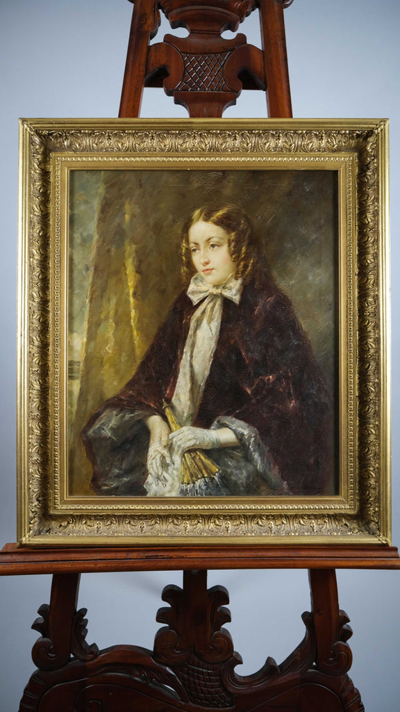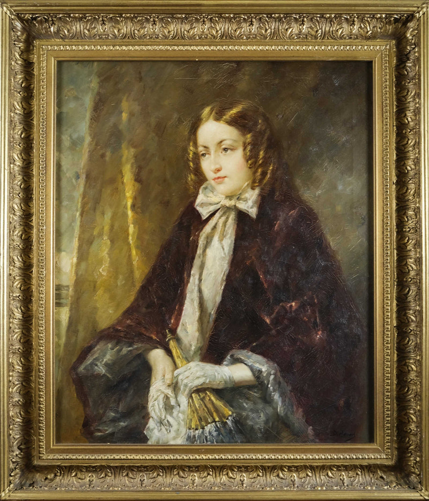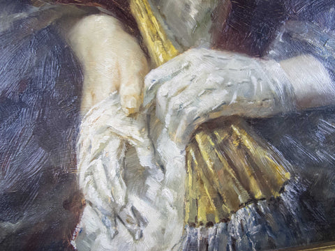 The portrait depicts a lady of wealth holding a parasol and removing her gloves. The painting is very finely done with exceptional painting of the face and hands. The artist has captured the light such that the work appears to glow. A truly stunning piece of 20th century portraiture.