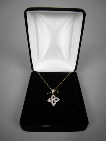 The pendant boasts thirteen 0.10 carat diamonds. The pendant hangs from a very fine 9 carat gold link chain.