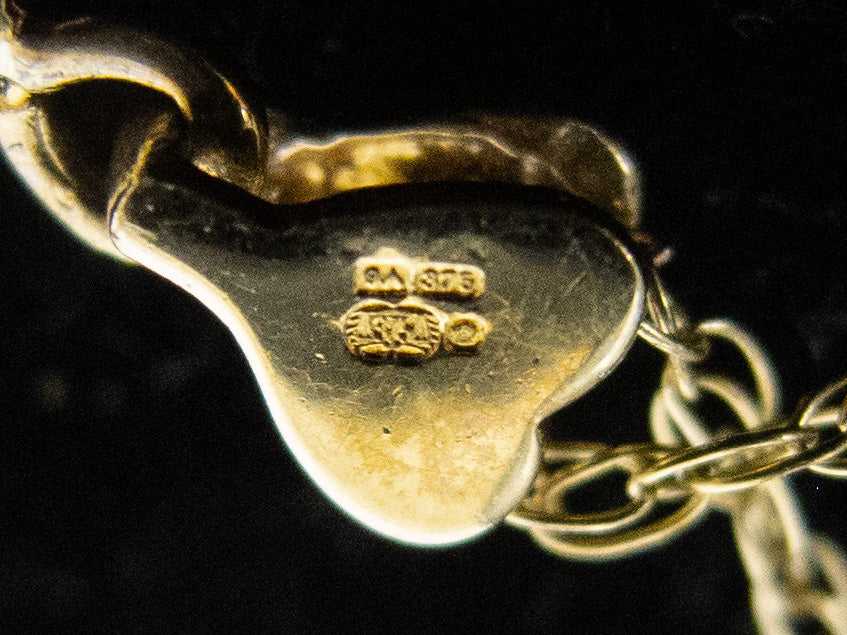 The pendant is fully hallmarked with 'GA' for Gallery Abbeycrest, '375' for 9 carat gold and the Sheffield rose.