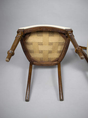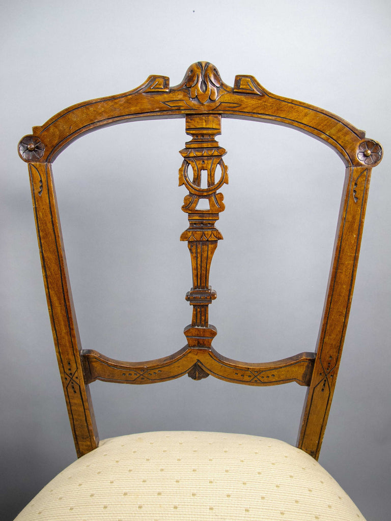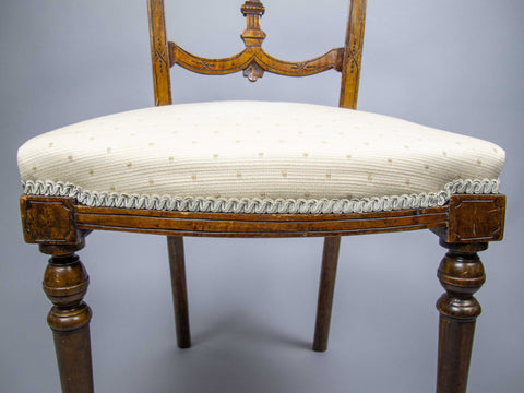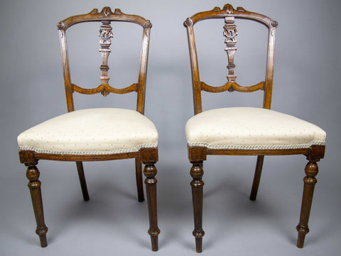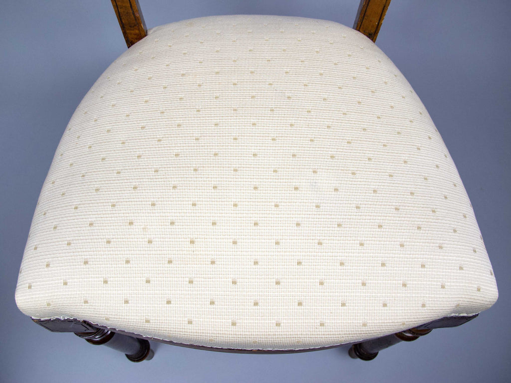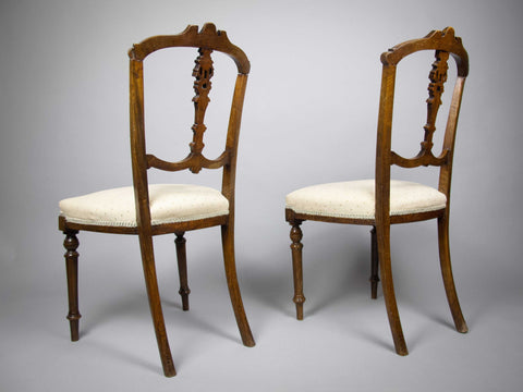 A stunning pair of Edwardian stained walnut side chairs with overstuffed seats in a later neutral geometric design.
