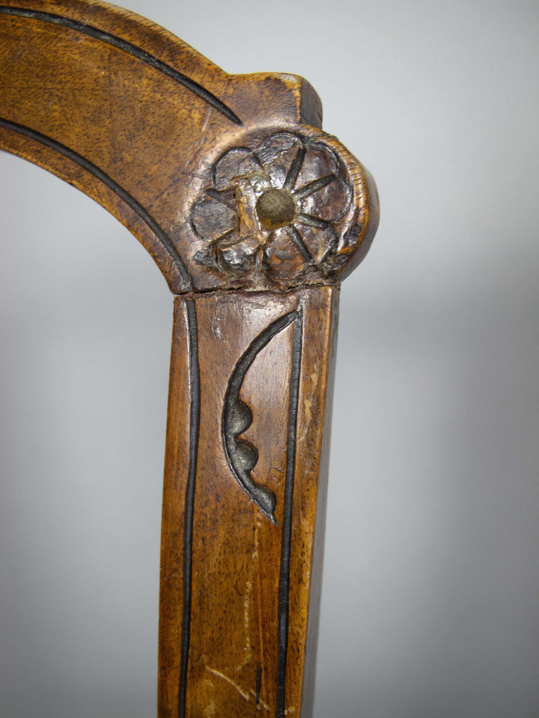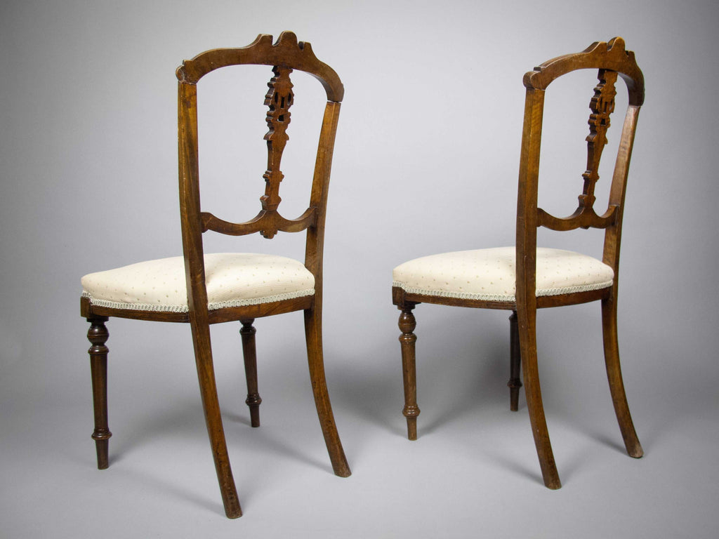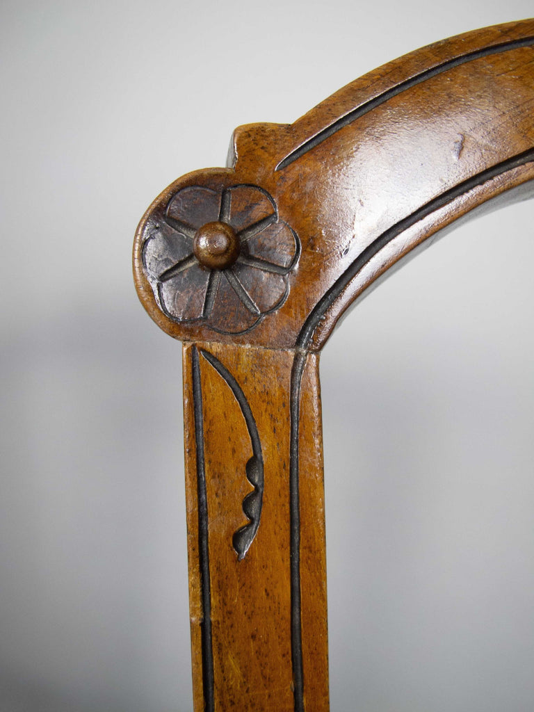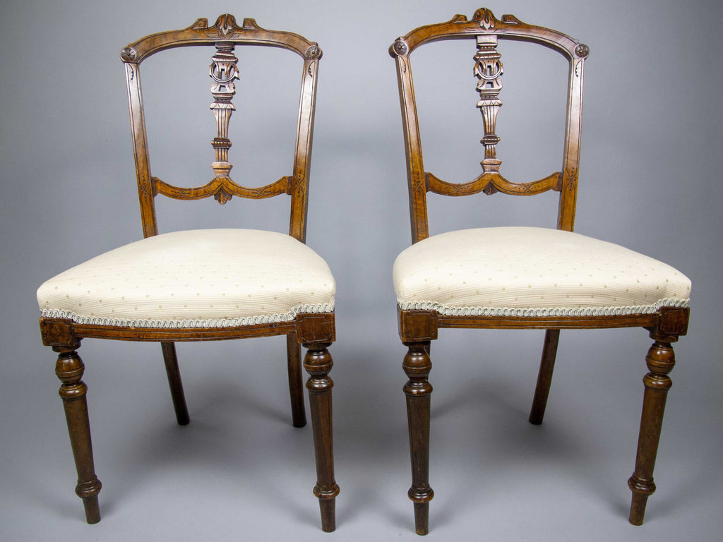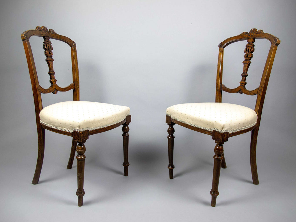 The chairs are structurally sound and stand firm with no difficulties in weight bearing. The support struts to the base of one chair appear to have been repaired at some point (please see photographs); this repair remains effective. The top craved flower decoration to one chair has warped with age (please see photographs).