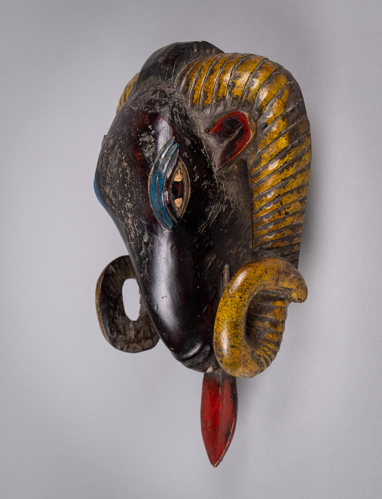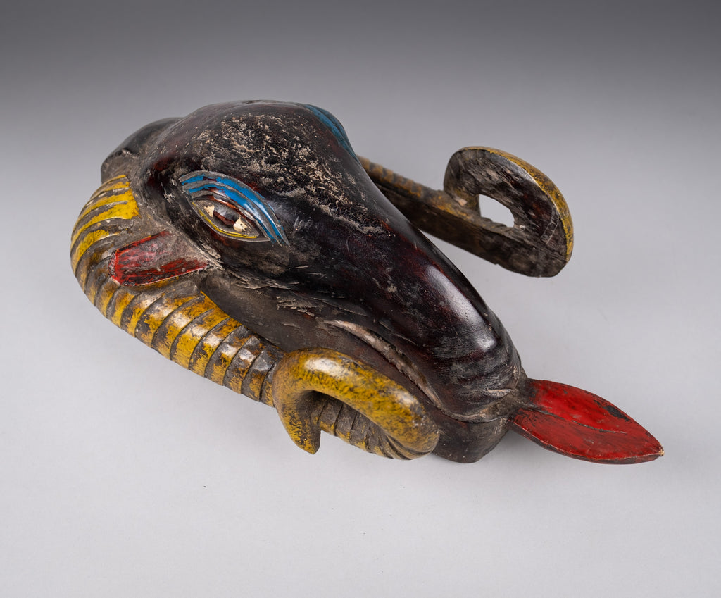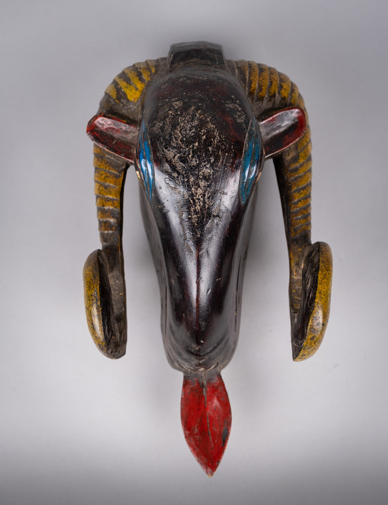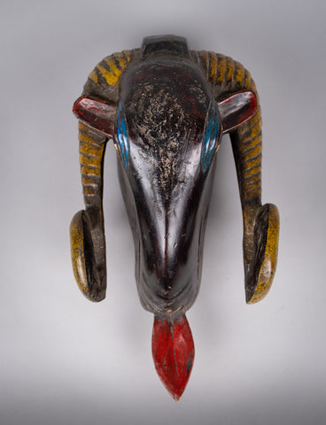 This baule mask depicts a ram, beautifully carved with intricate curved twisted horns, two ears, delicately painted eyes and a long tongue.