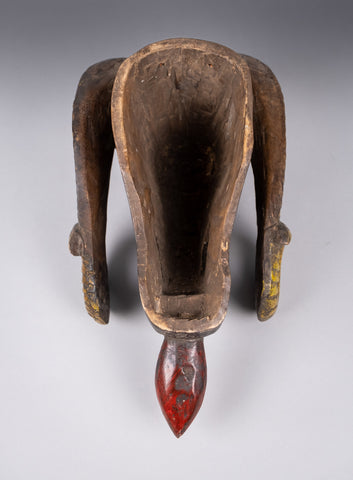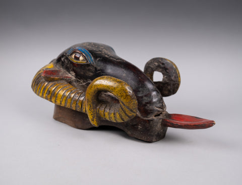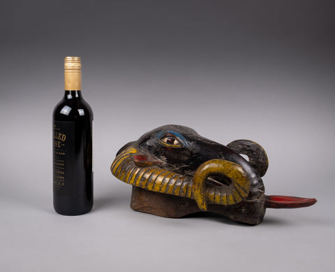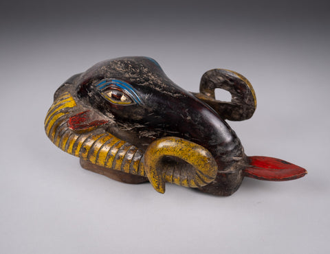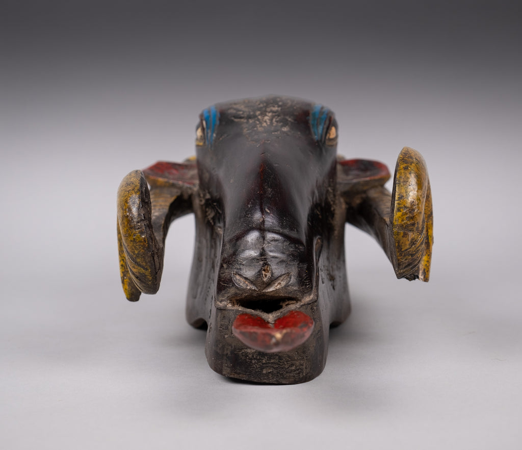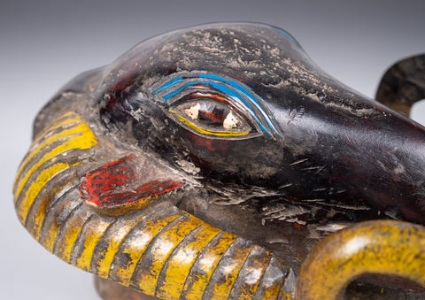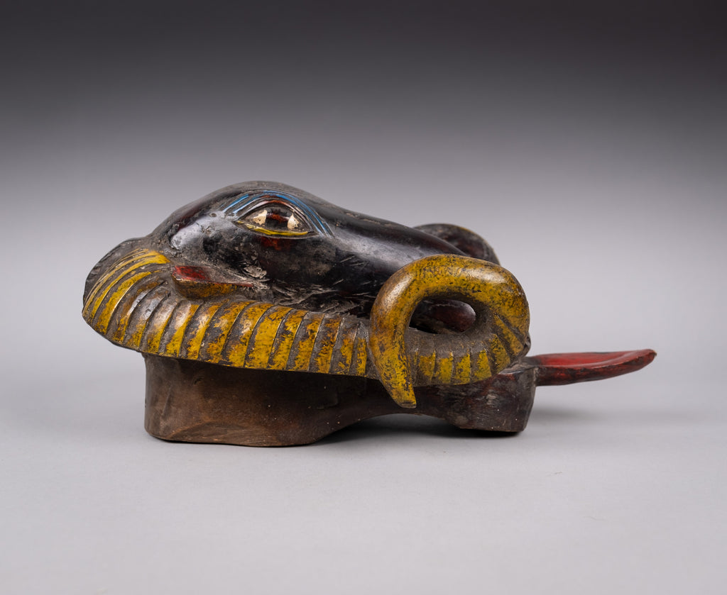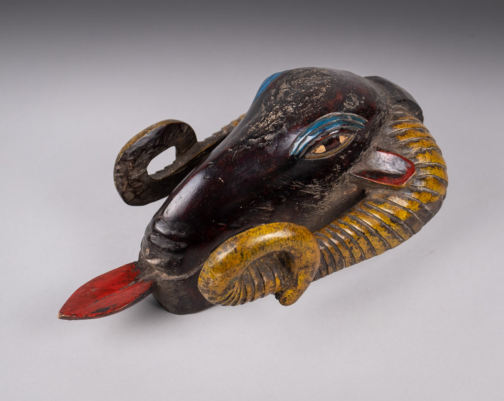 This baule mask depicts a ram, beautifully carved with intricate curved twisted horns, two ears, delicately painted eyes and a long tongue.