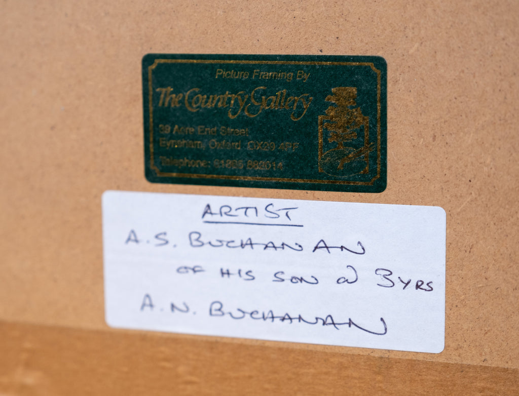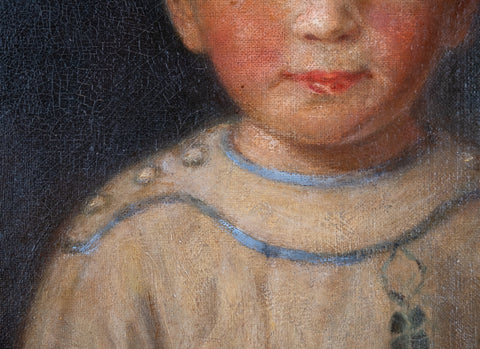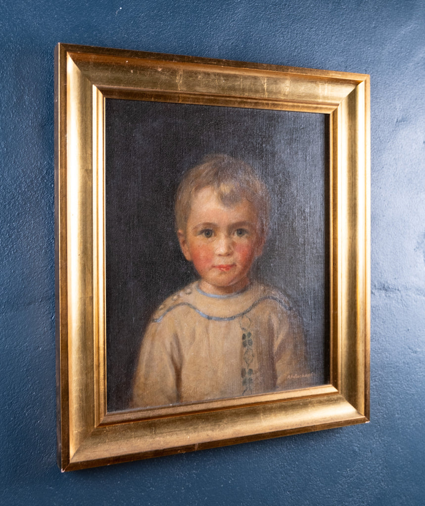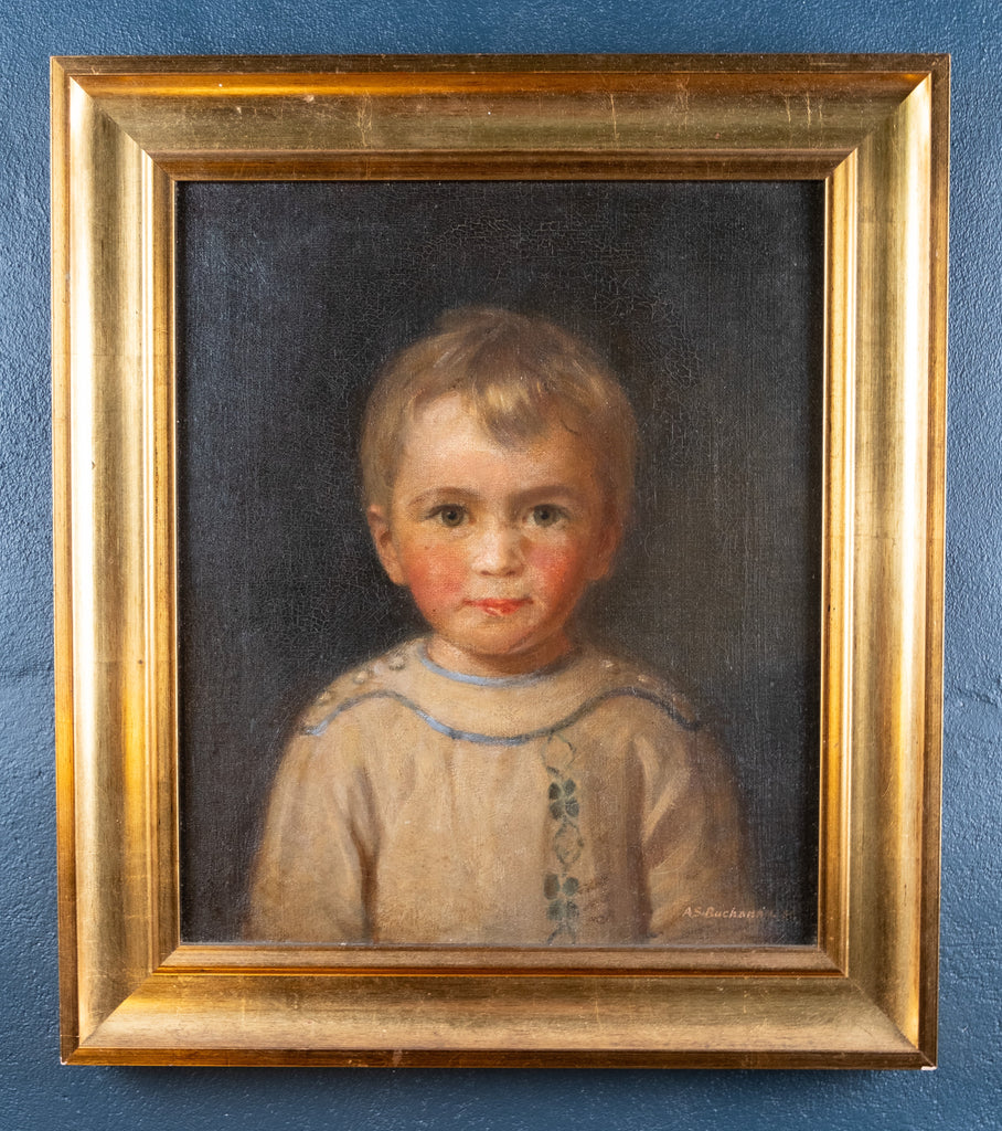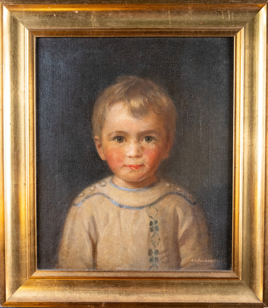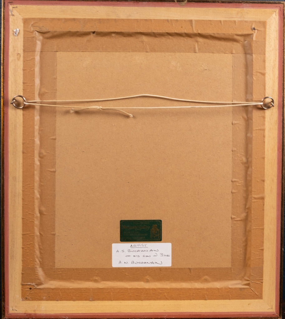 A charming portrait by Alexander Strahan Buchanan (1870-1956), of his son Alexander Norman Buchanan (1910-2004). Alexander Norman Buchanan went on to become an artist in his own right and resided in Oxfordshire. There was a large studio sale of his personal collection in 2005 following his death. This work has a hand-written label identifying the subject signed 'A. N. Buchanan', together with the label of an Oxford-based framer. It is therefore probable that this work formed part of his private collection auctioned in 2005.