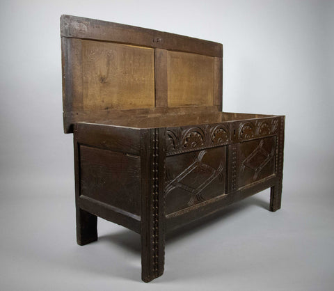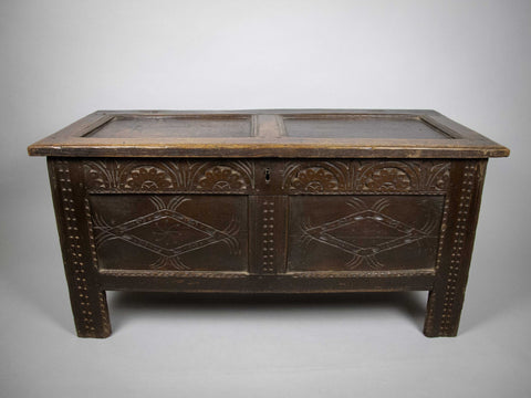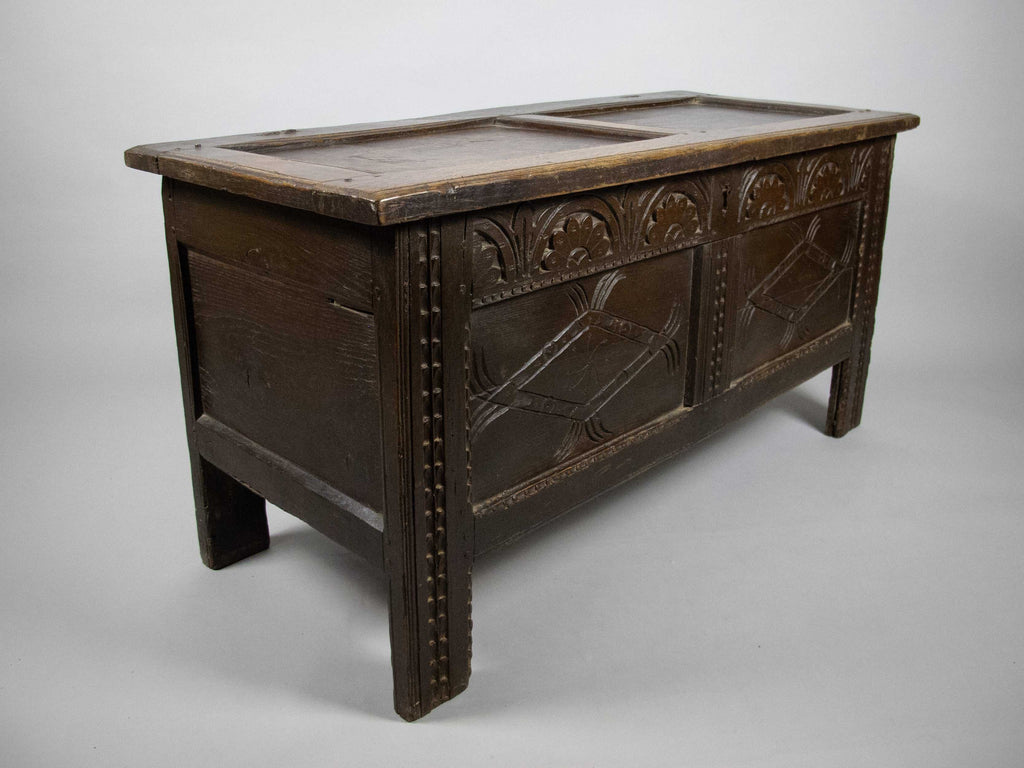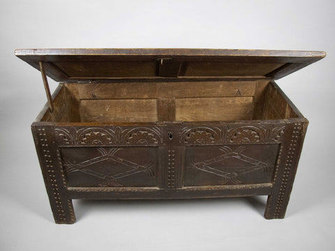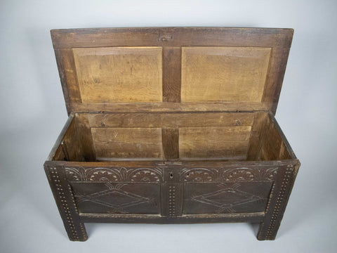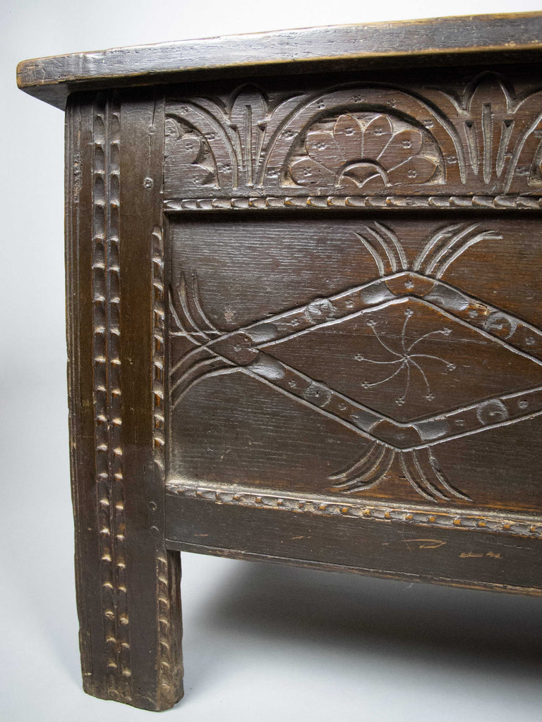 The coffer sits on raised legs and has a moulded panel lid, opening on the original iron loop hinges, and sitting above a moulded panel front and back. The coffer is of early pegged construction and boasts carving to the front panels and borders. The colour of the oak is wonderful; warm, glowing and tactile.
