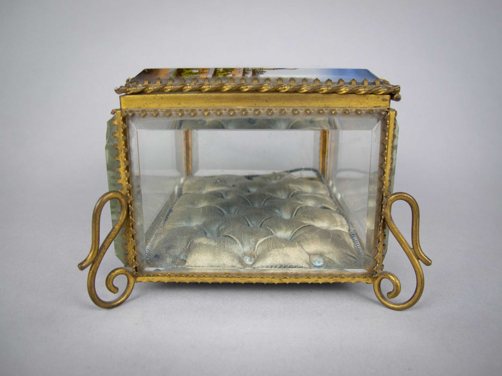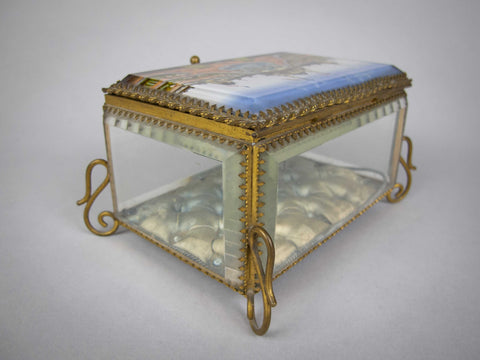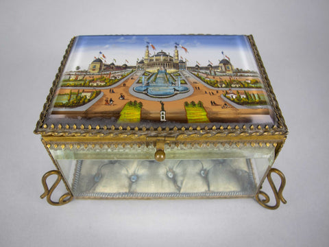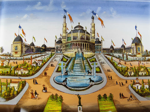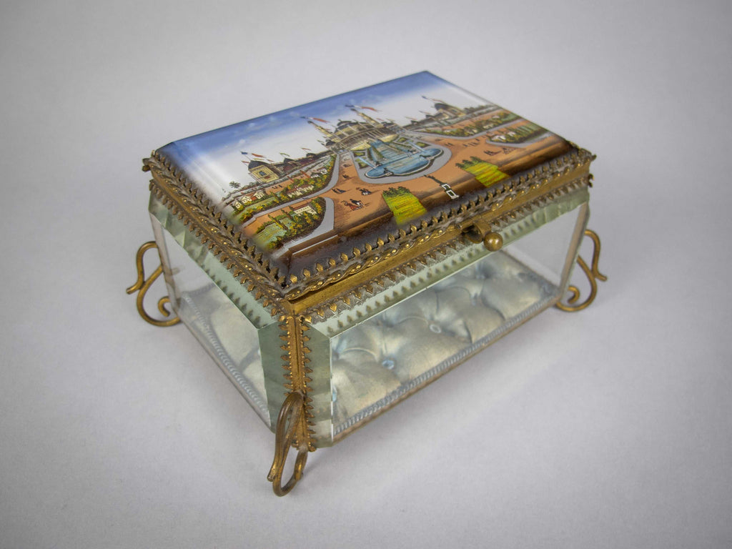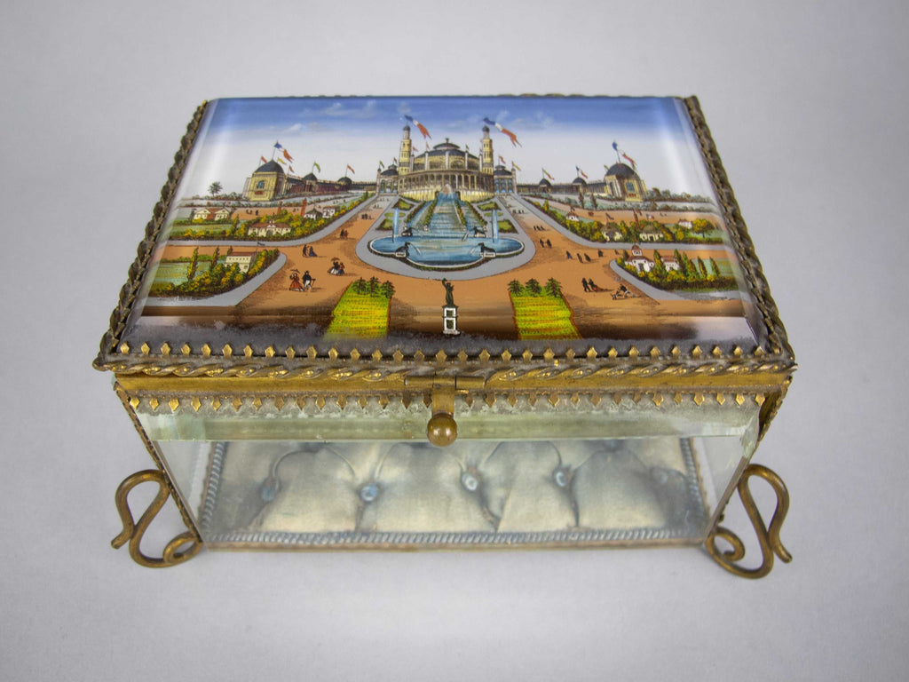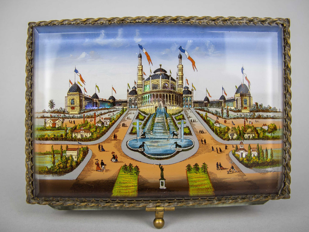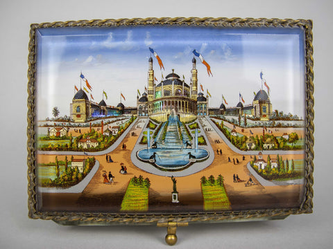 The lid of the box depicts Palais Du Trocadero, Paris at the Exposition Universelle, 1878. The depiction boasts inlaid mother of pearl throughout the palace and water fountains and is set under thick bevelled glass. This box was likely a souvenir from the event.