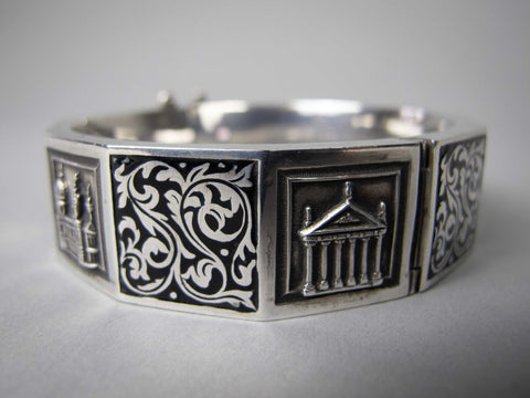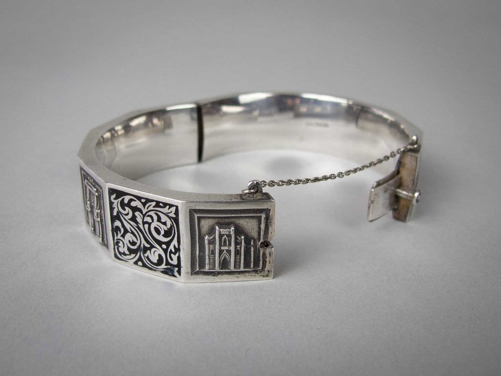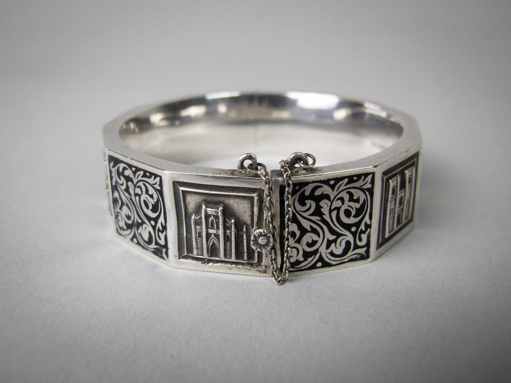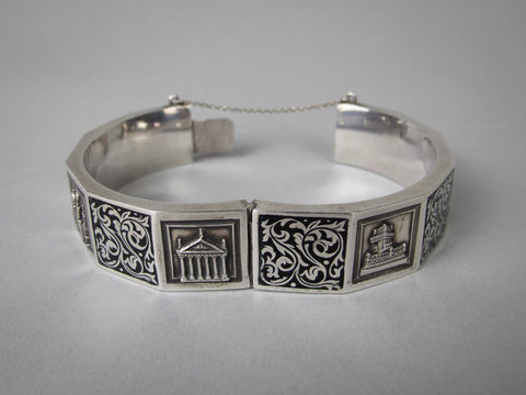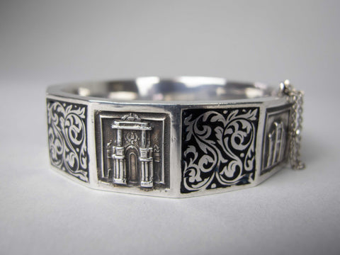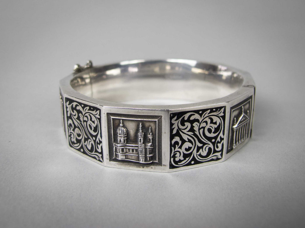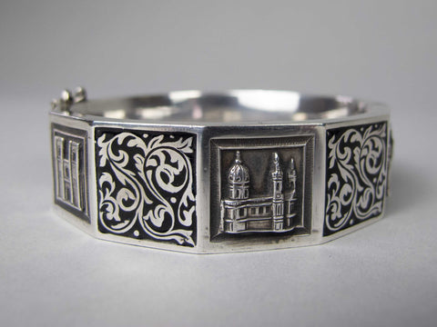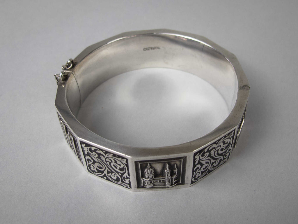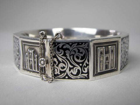 The bracelet boasts raised silver panels depicting landmarks, each flanked by a black enamel panel with silver foliate decoration in the art nouveau style. The bracelet is particularly interesting as it also embraces the art deco period of the time with its bold square panel desig.