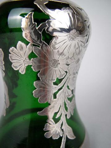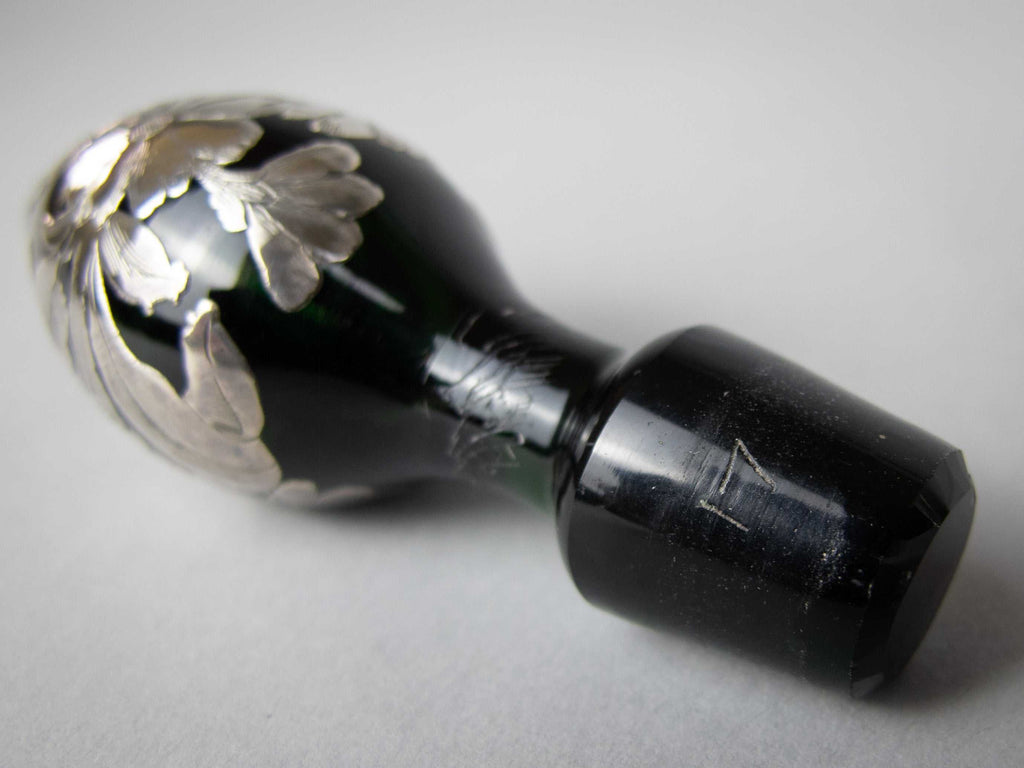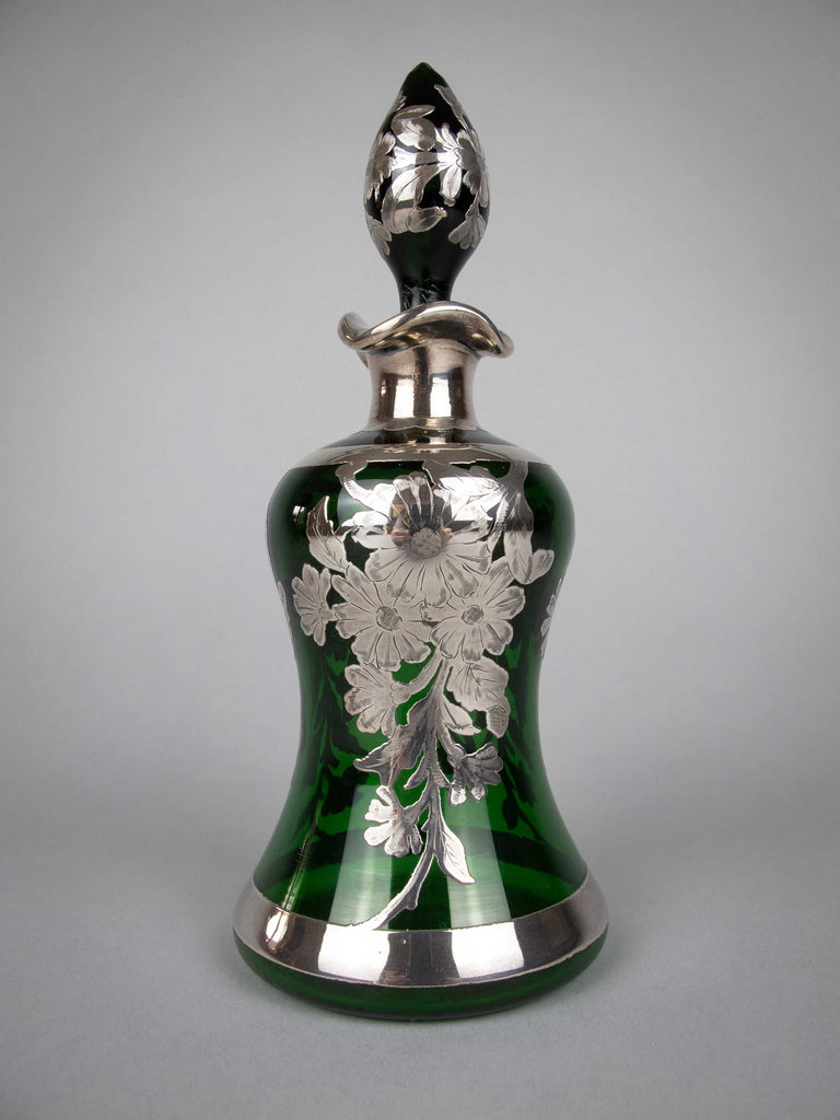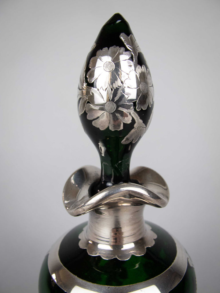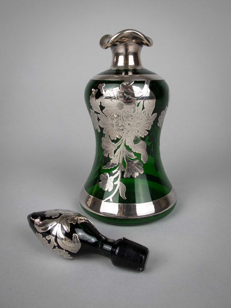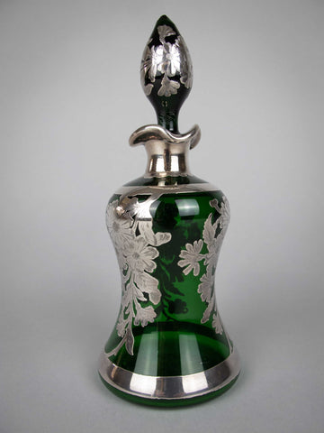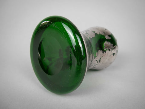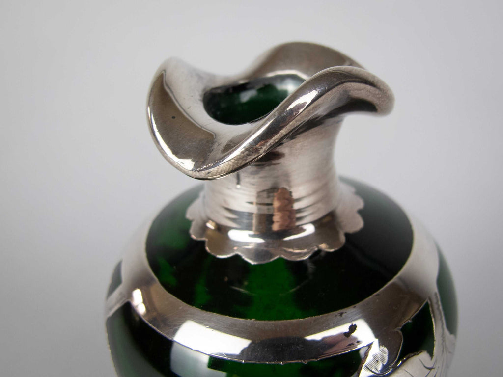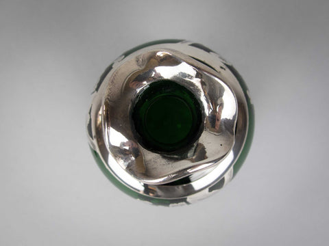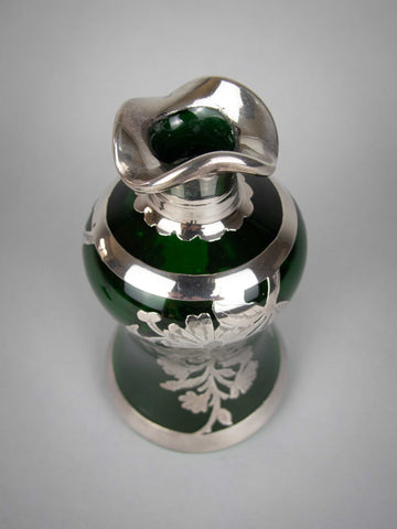 A lovely art nouveau green glass scent bottle with silver overlay, c.1900-1910.